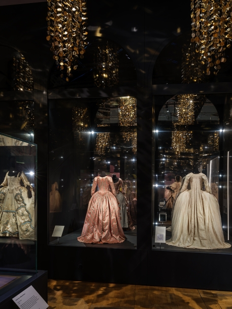 The exhibition opens with a glimpse of splendour before the Hall of Mirrors, where lighting mimics a candlelit chandelier with dynamic reflections on walls, floors, and mirrors suggesting infinity. Using reflective discs from a previous exhibition clusters of gold and silver sequins hang from cables, illuminated by low-glare downlights and DMX-controlled fittings that twinkle with the soundtrack.