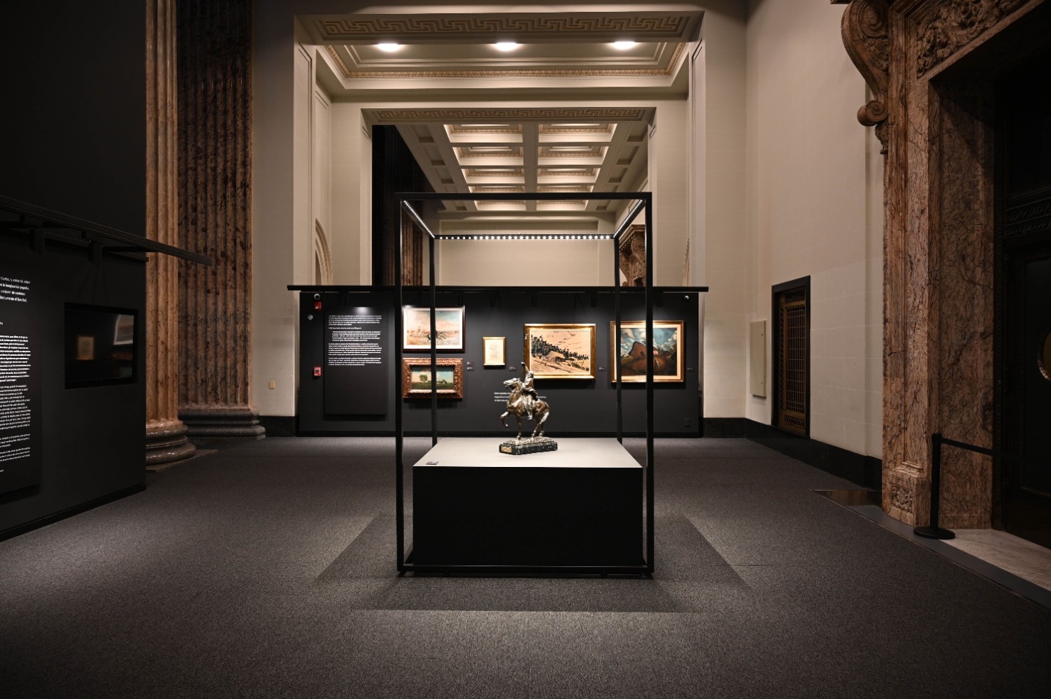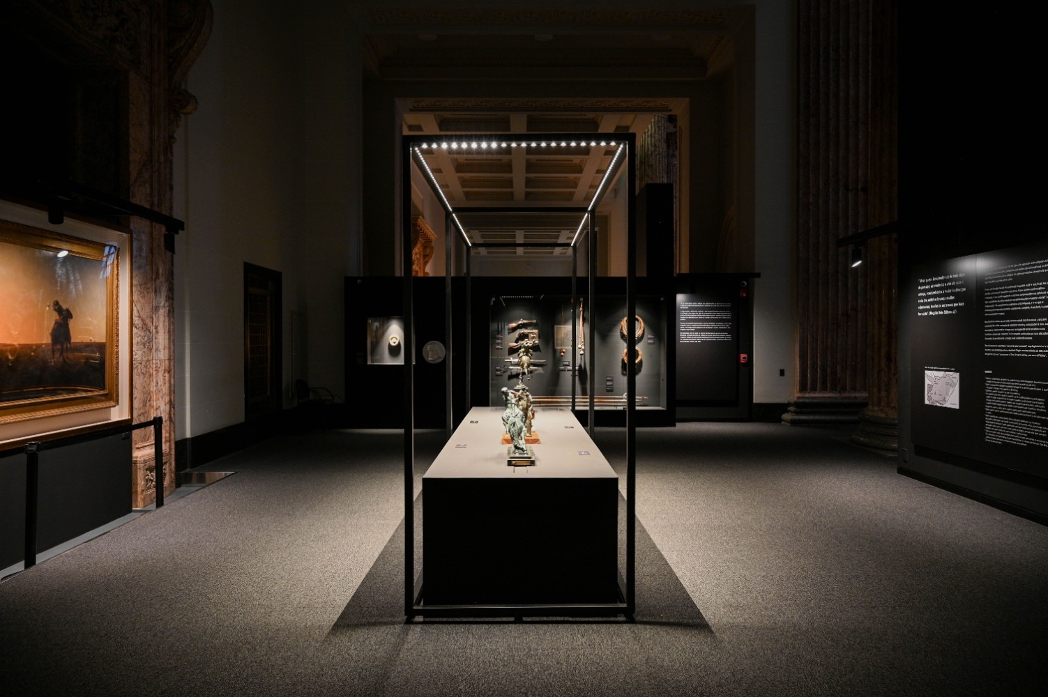 The lighting design establishes a cohesive visual language that guides visitors through newly created exhibition areas, ranging from intimate galleries to the expansive central hall. Indirect lighting was integrated into cornices to reveal the geometry of the vaulted ceiling. These layers of soft, diffused light provide ambient illumination that enhances the monumentality of the hall while preserving a contemplative, museum-appropriate atmosphere.