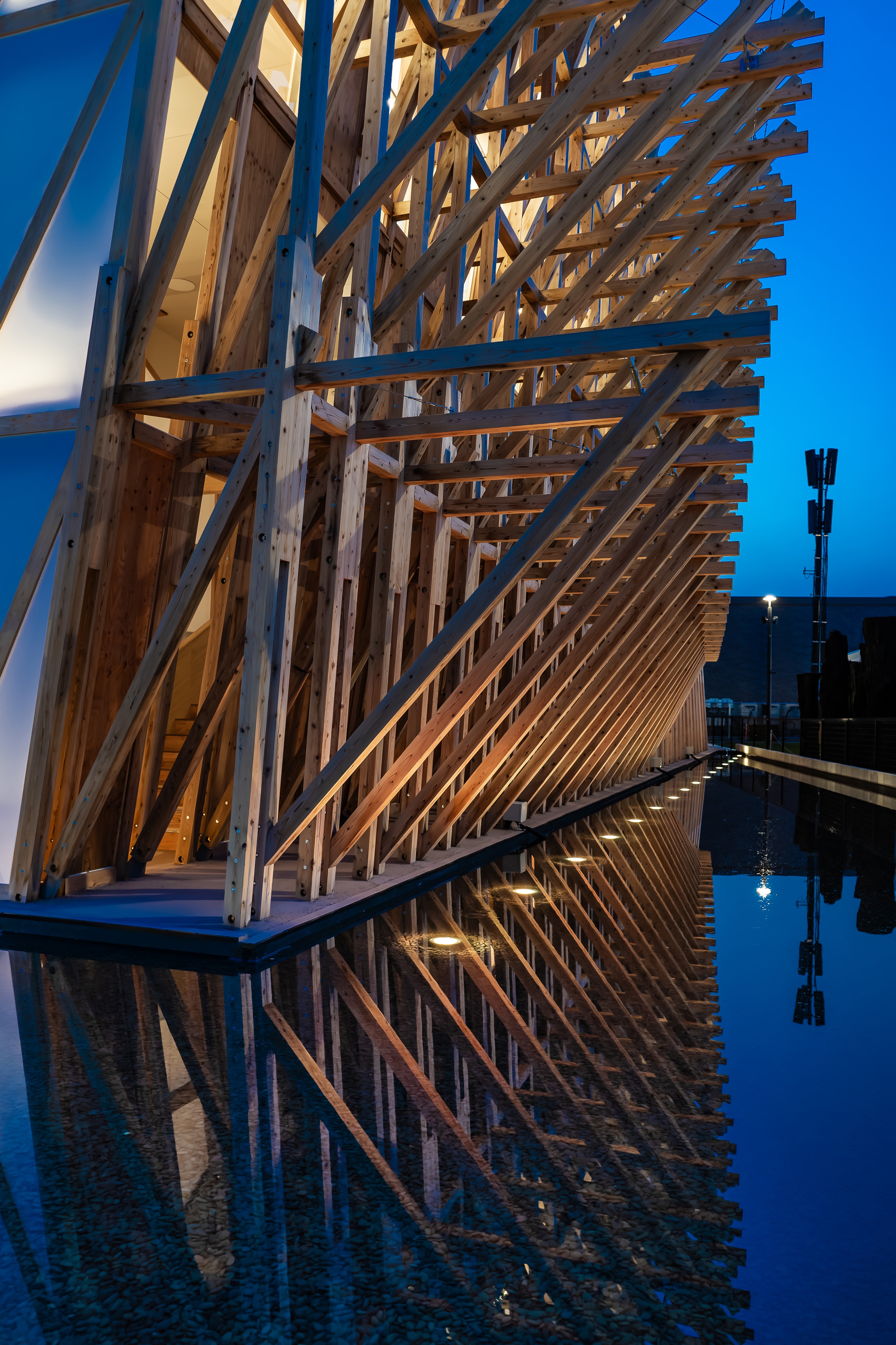 Entry DescriptionThe lighting design and control system aimed to create a “well-being light environment” within the expansive wooden structure. The pavilion’s timber framework and mesh membrane evoke the image of a traditional Bahraini pearl-dhow boat. Water features on both sides of the pavilion incorporate underwater lighting, casting shimmering reflections onto the timber structure, suggesting a vessel illuminated by the “Mother Sea” embarking on a voyage.