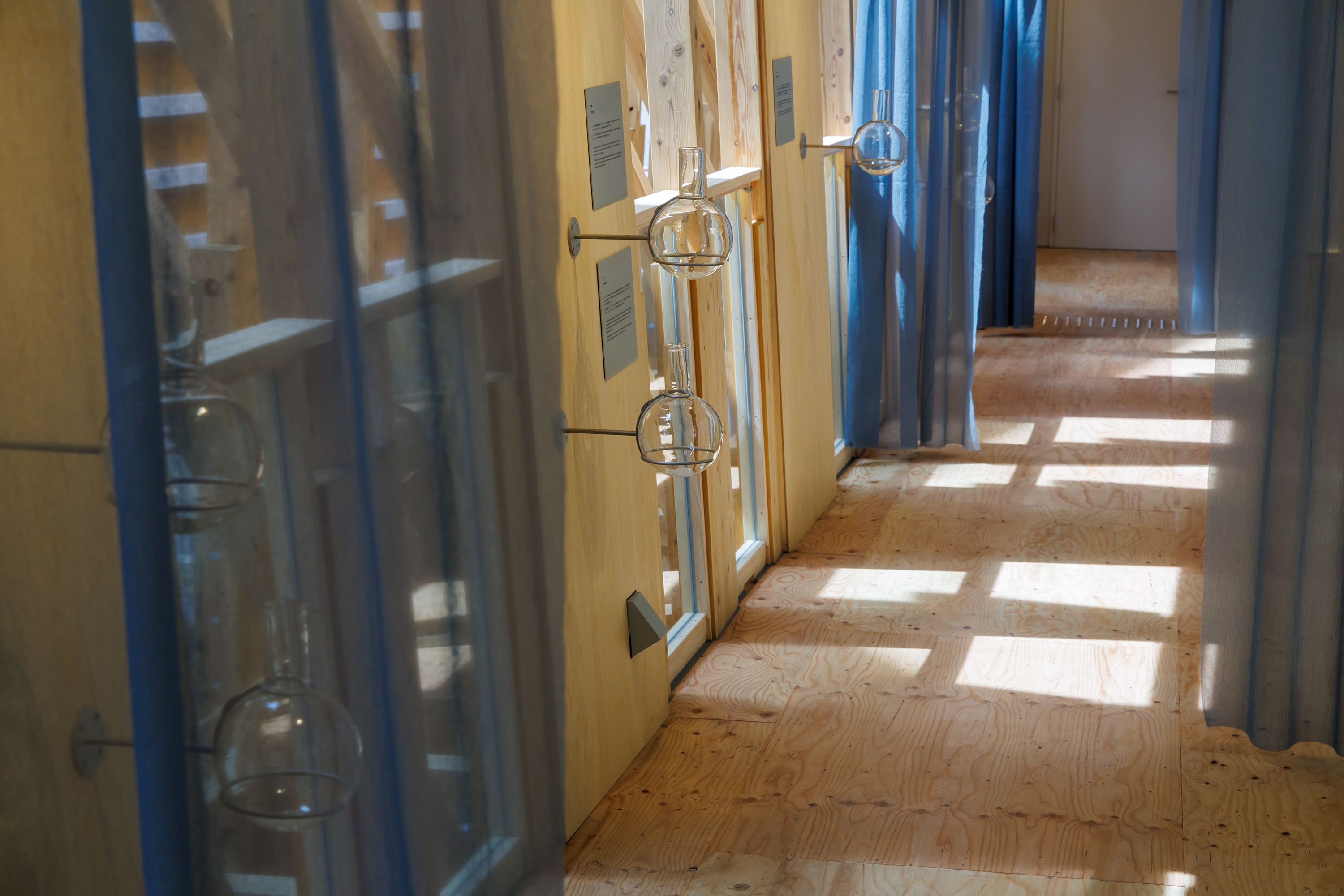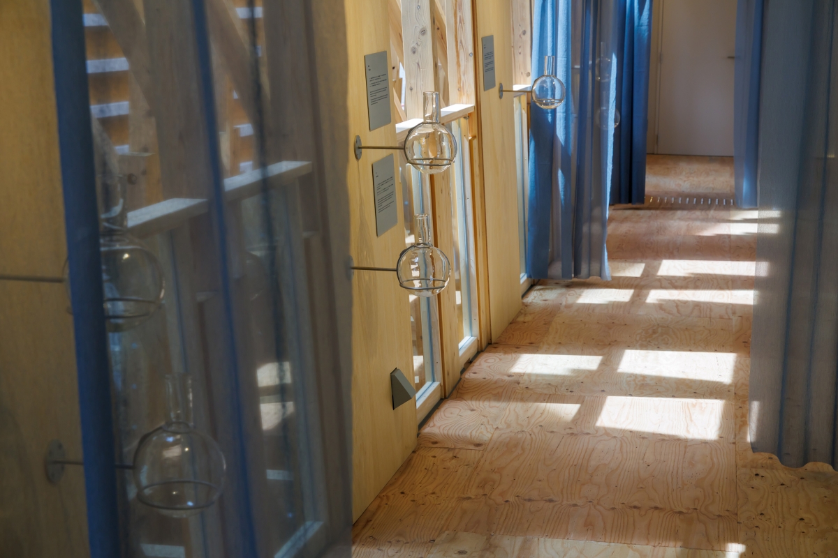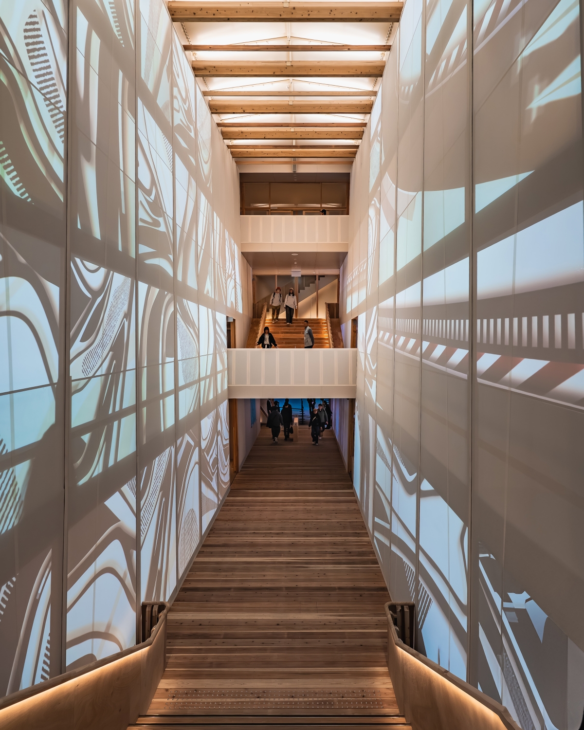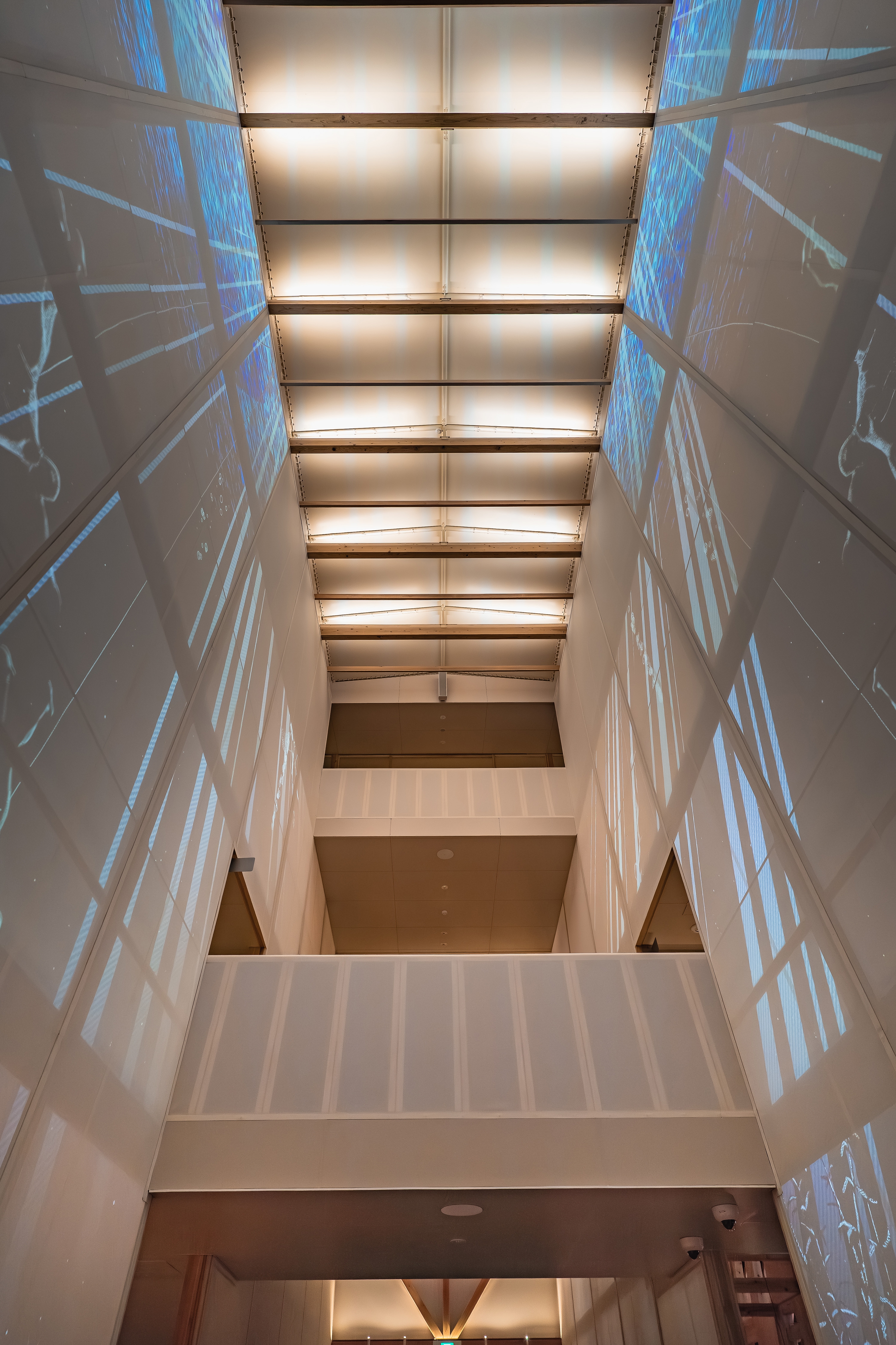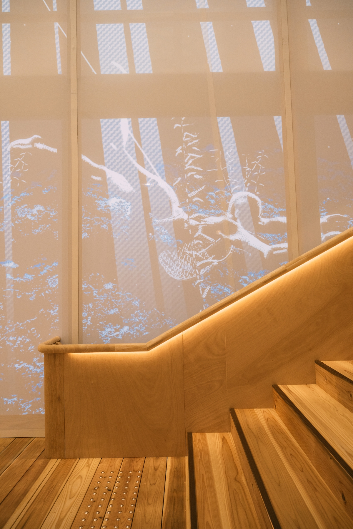 The 4th story atrium, enveloped by a mesh membrane, softly reflects and diffuses daylight and indirect light. The ceiling membrane, illuminated by high-power linear lighting installed above the top beams, delivers softened light down to the ground floor, offering visitors comfort as if embraced by the “Mother Sea” or within a mother’s womb. The front mesh membrane, lit indirectly from inside, enhances depth and spatial extension along the corridor.