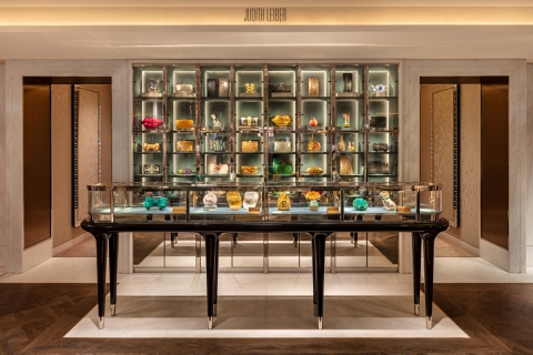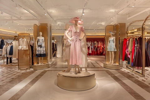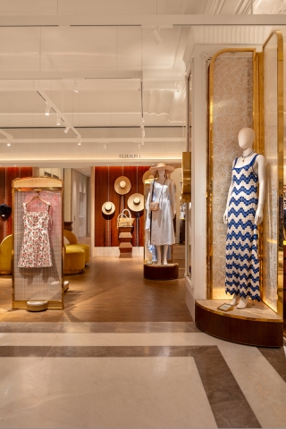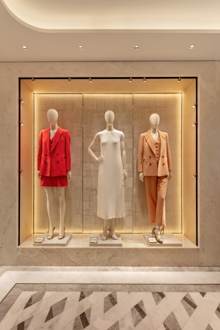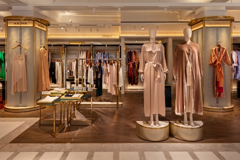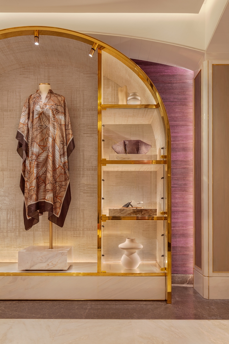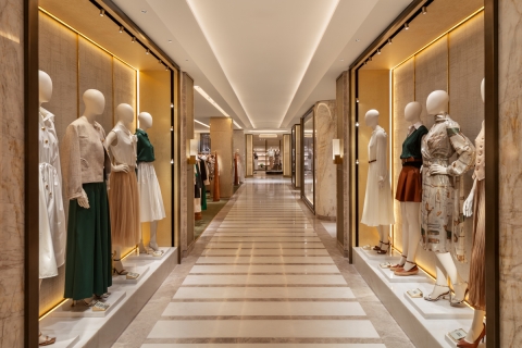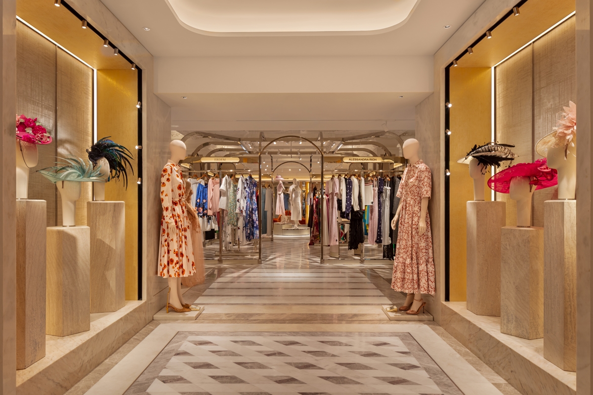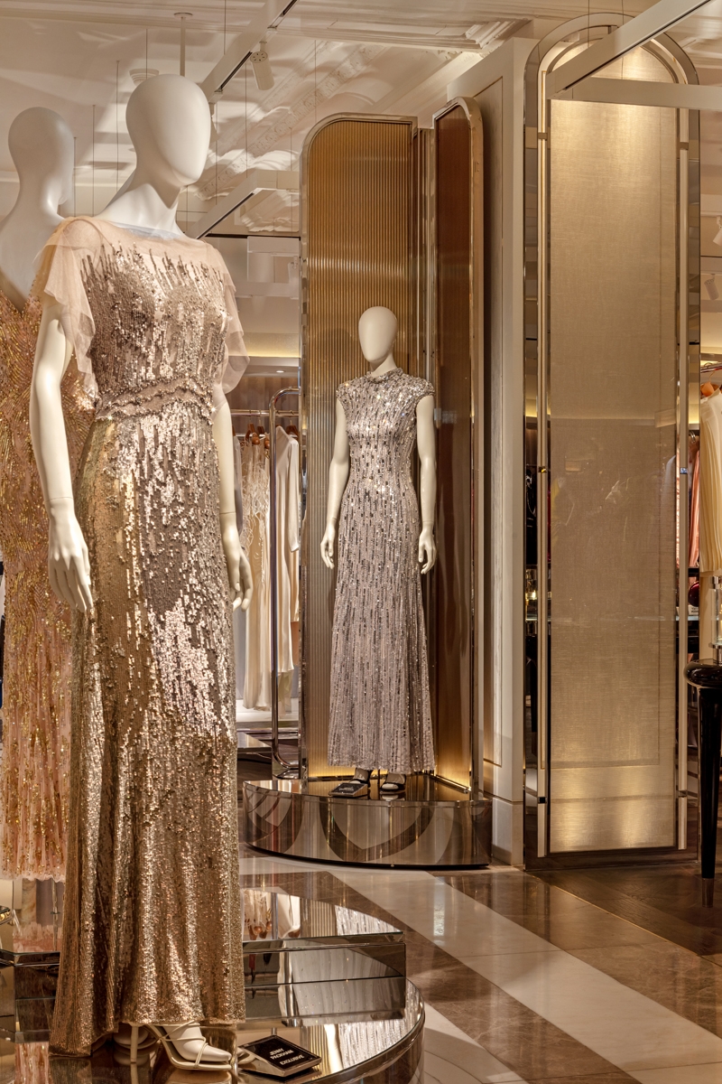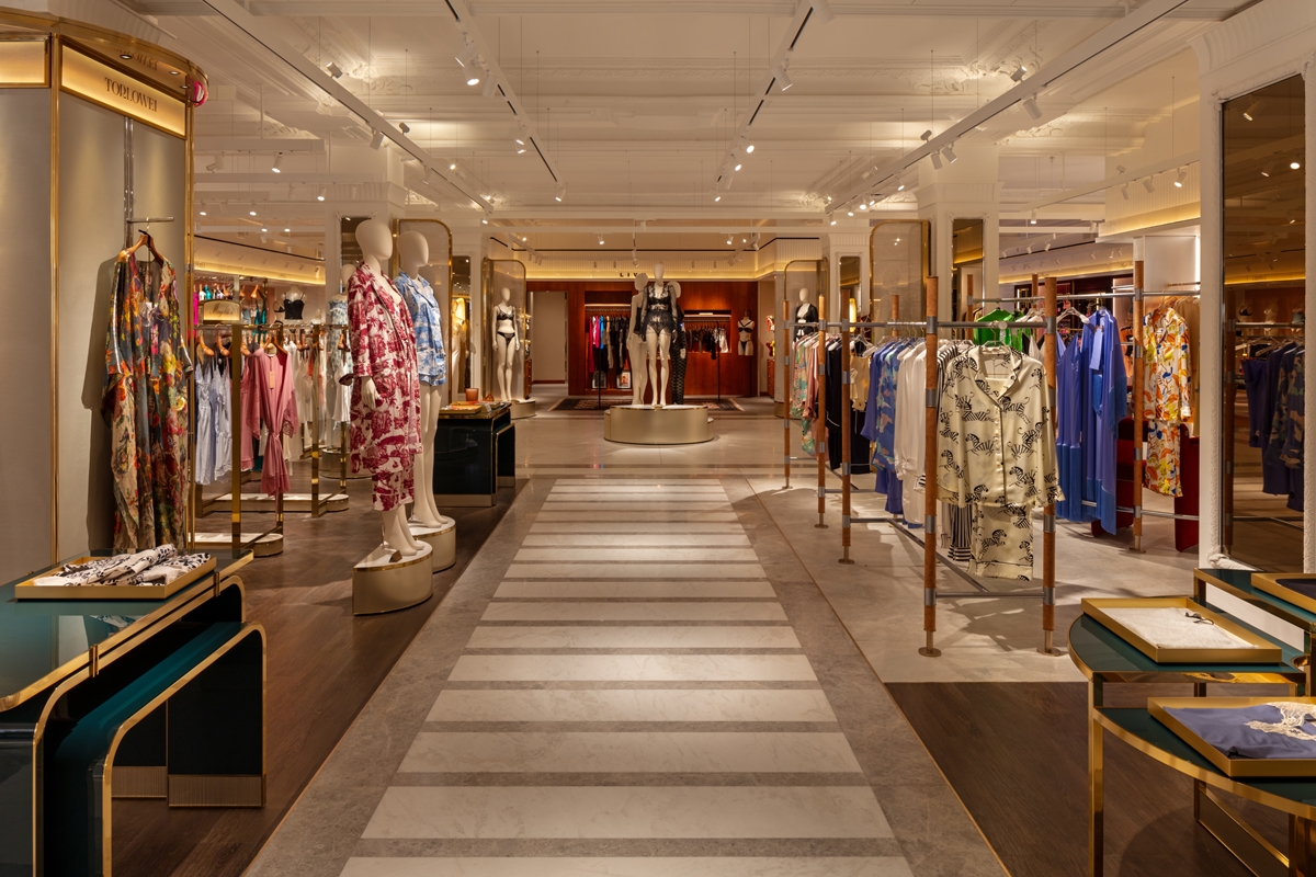 Ambient warm light is punctuated by low glare Hi CRI 2700K spotlighting, creating contrast to accentuate luxurious fabrics. LDI took care to ensure minimal direct illumination to the floor, ensuring garments and product displays are the main feature.