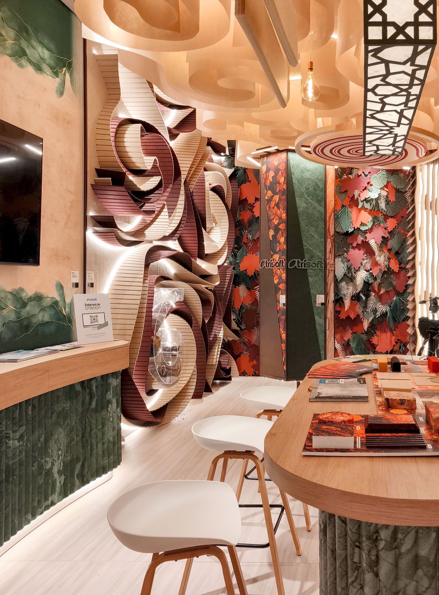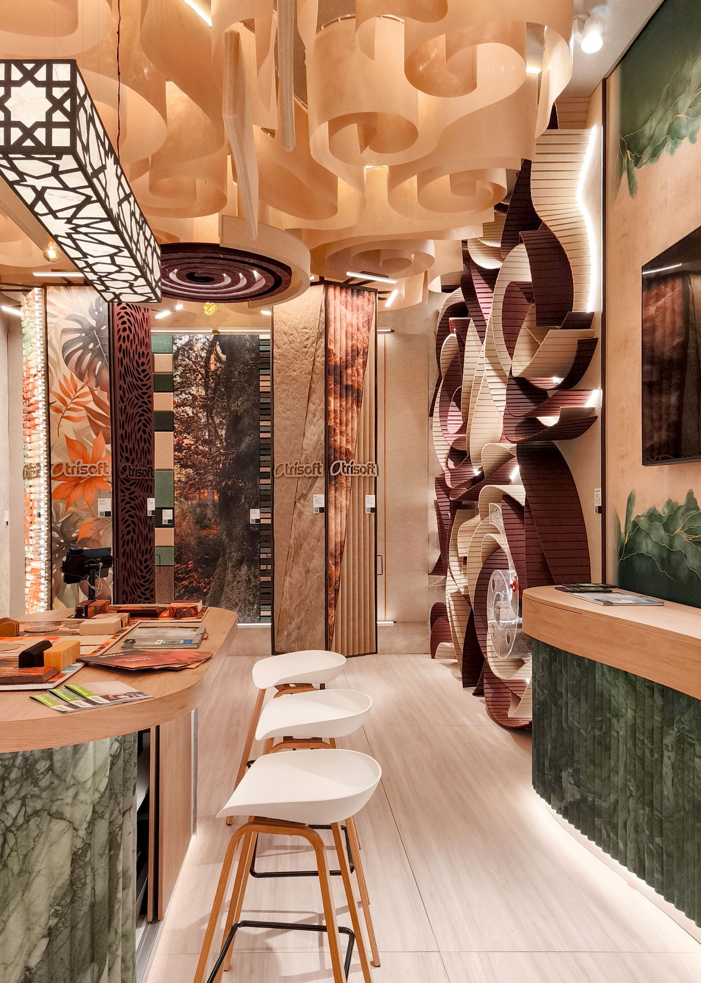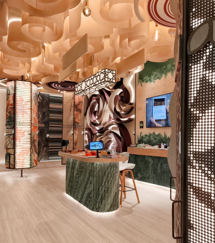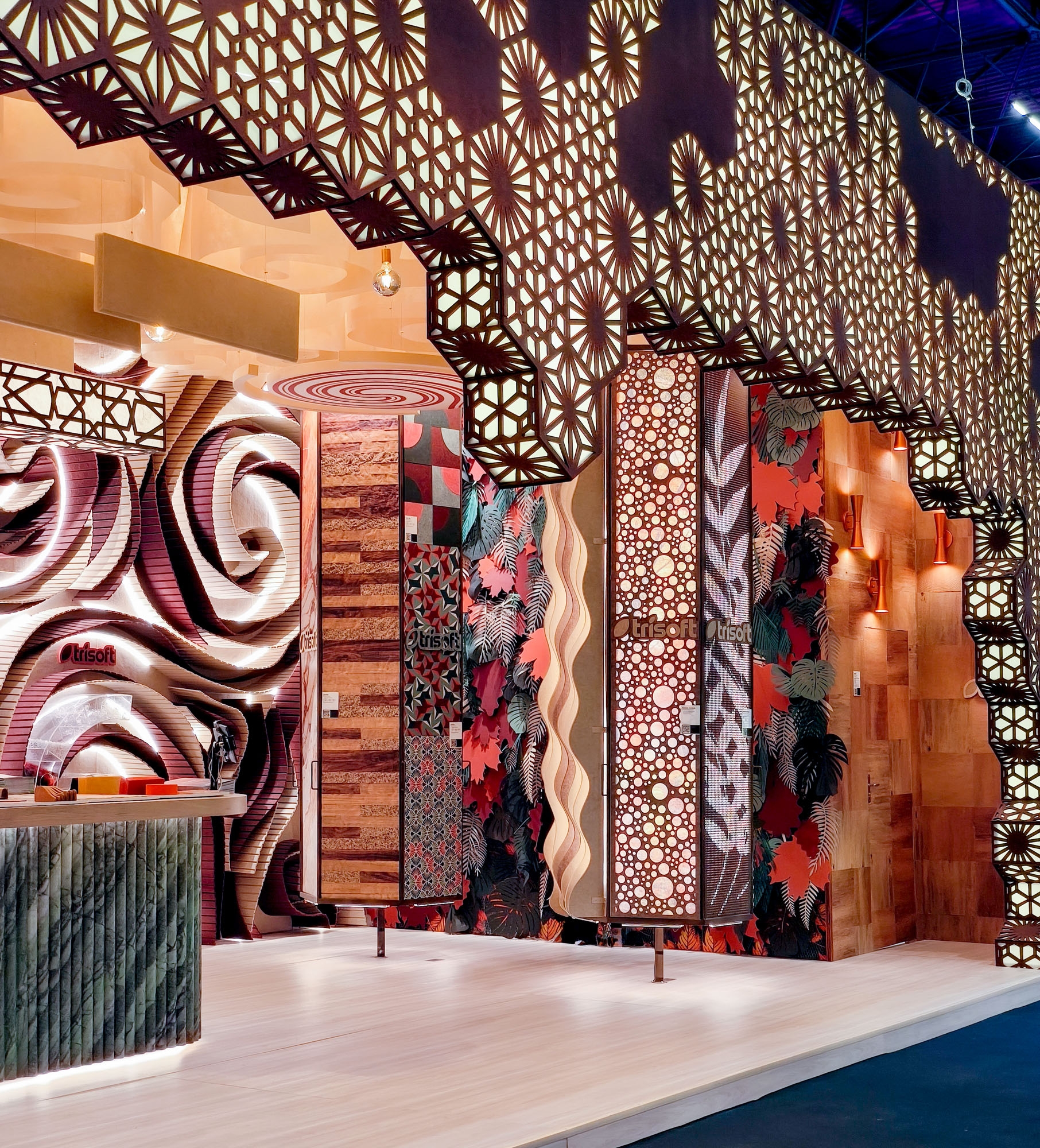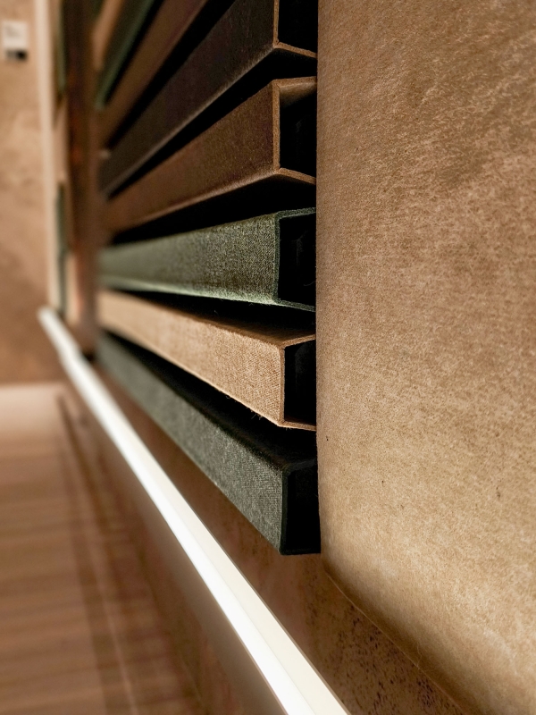 Entry DescriptionThe design was inspired by autumn, incorporating earthy tones to showcase a wide variety of sustainable acoustic products made from recycled PET. The lighting required innovative technical solutions, as the products covered nearly the entire ceiling, walls, and furniture of the stand.