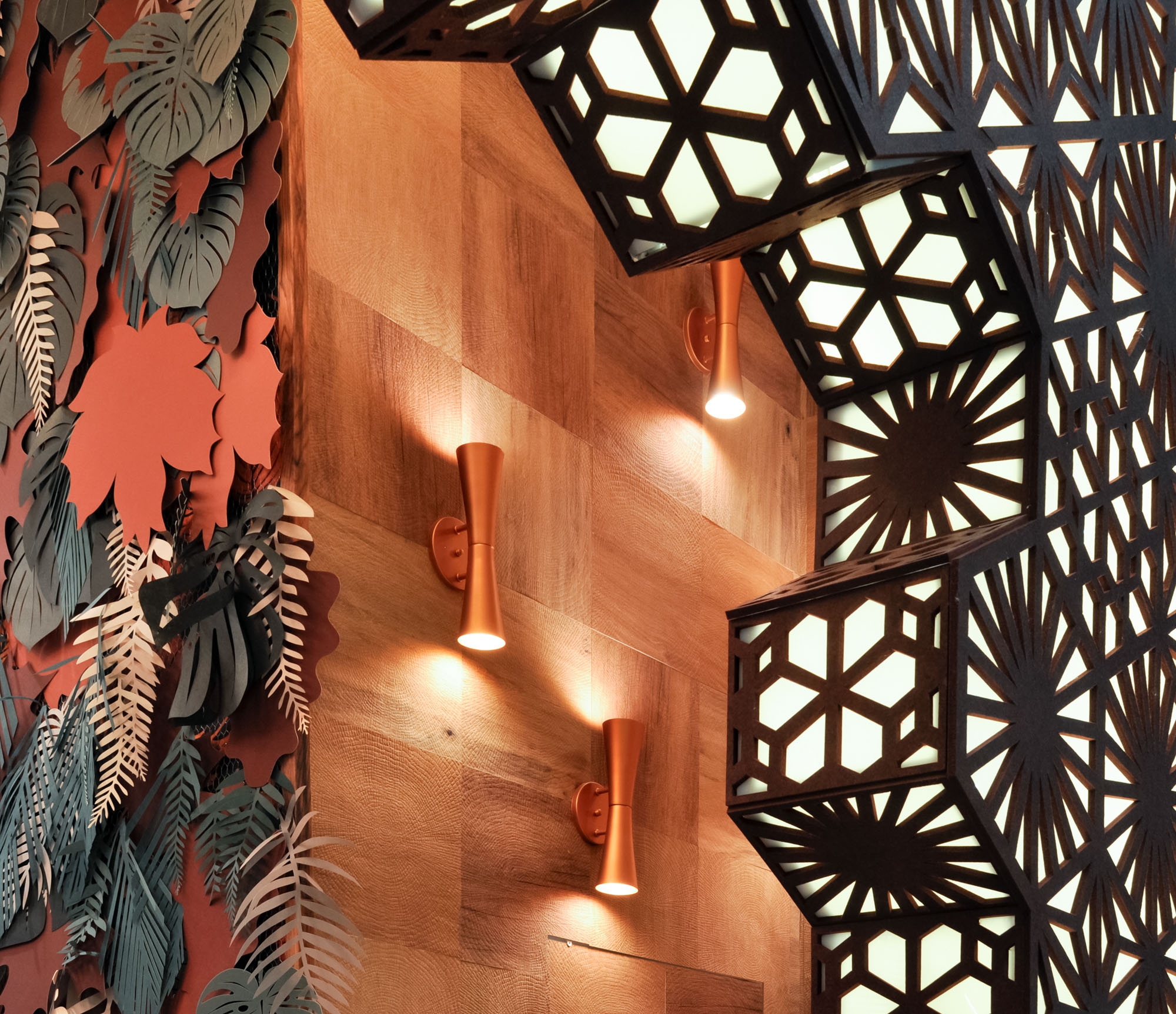 Additional elements included LED profiles integrated into the display units and the acoustic panel, strategically positioned technical spotlights along the perimeter, 8mm LED strips highlighting materials on walls and furniture, and wall sconces arranged as an artistic installation. The project was complemented by decorative pendants with filament lamps, adding a special touch.