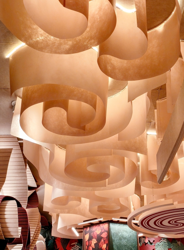 To ensure efficient lighting without interfering with the display, we developed supports fixed to the four rotating hexagonal display units, providing asymmetrical diffuse illumination that followed their movement. The acoustic paper curtains on the ceiling were fitted with a 3mm LED strip, alternately applied inside and outside the profile, creating a visual effect.