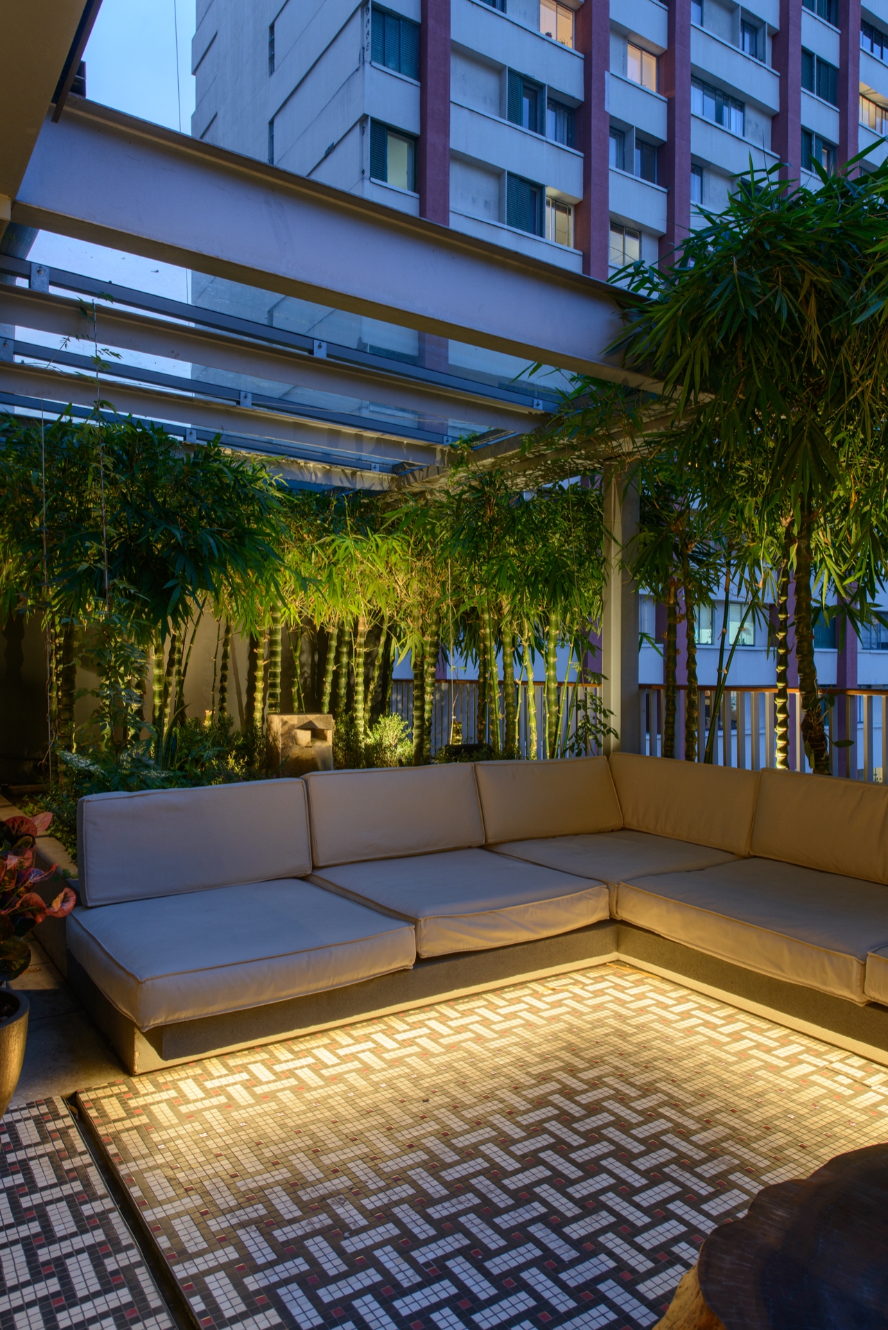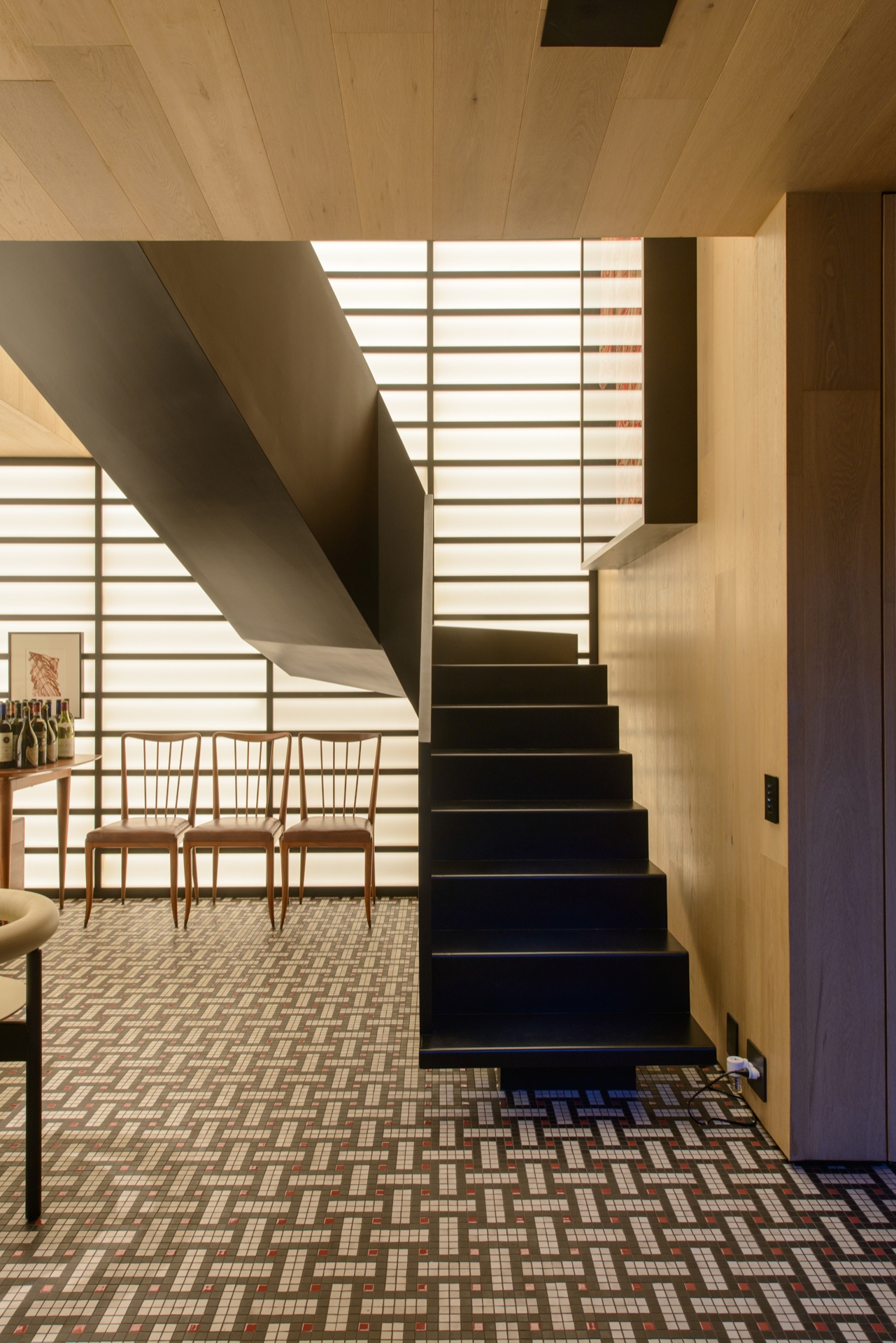On the floor, the mosaic of small ceramic tiles in cool and warm tones interacts with the ambient lighting to create a subtle play of reflections and shadows, adding tactile complexity underfoot. The minimalist furniture—with dark structural lines—emerges as graphic silhouettes against the luminous background, emphasizing spatial hierarchy.