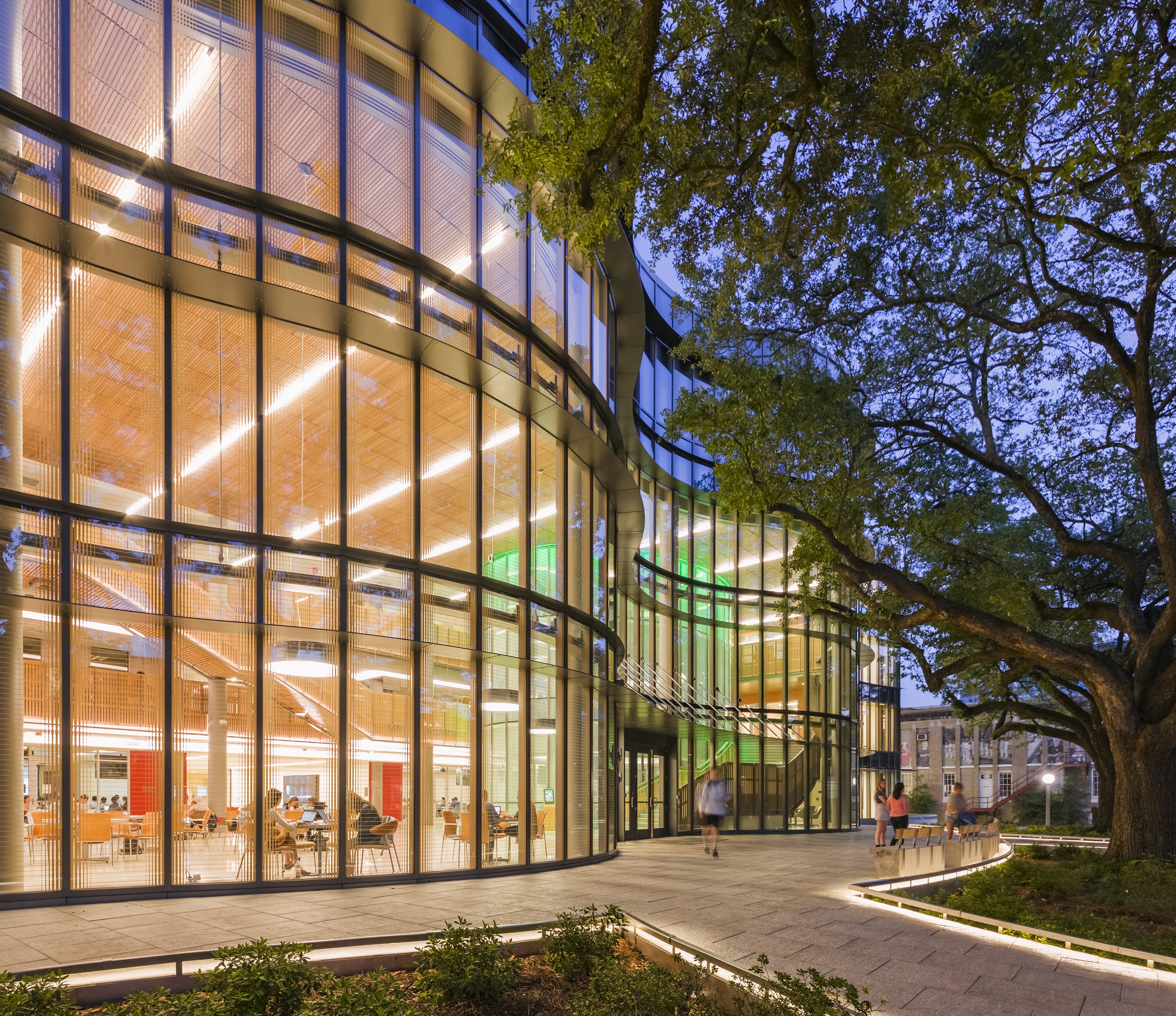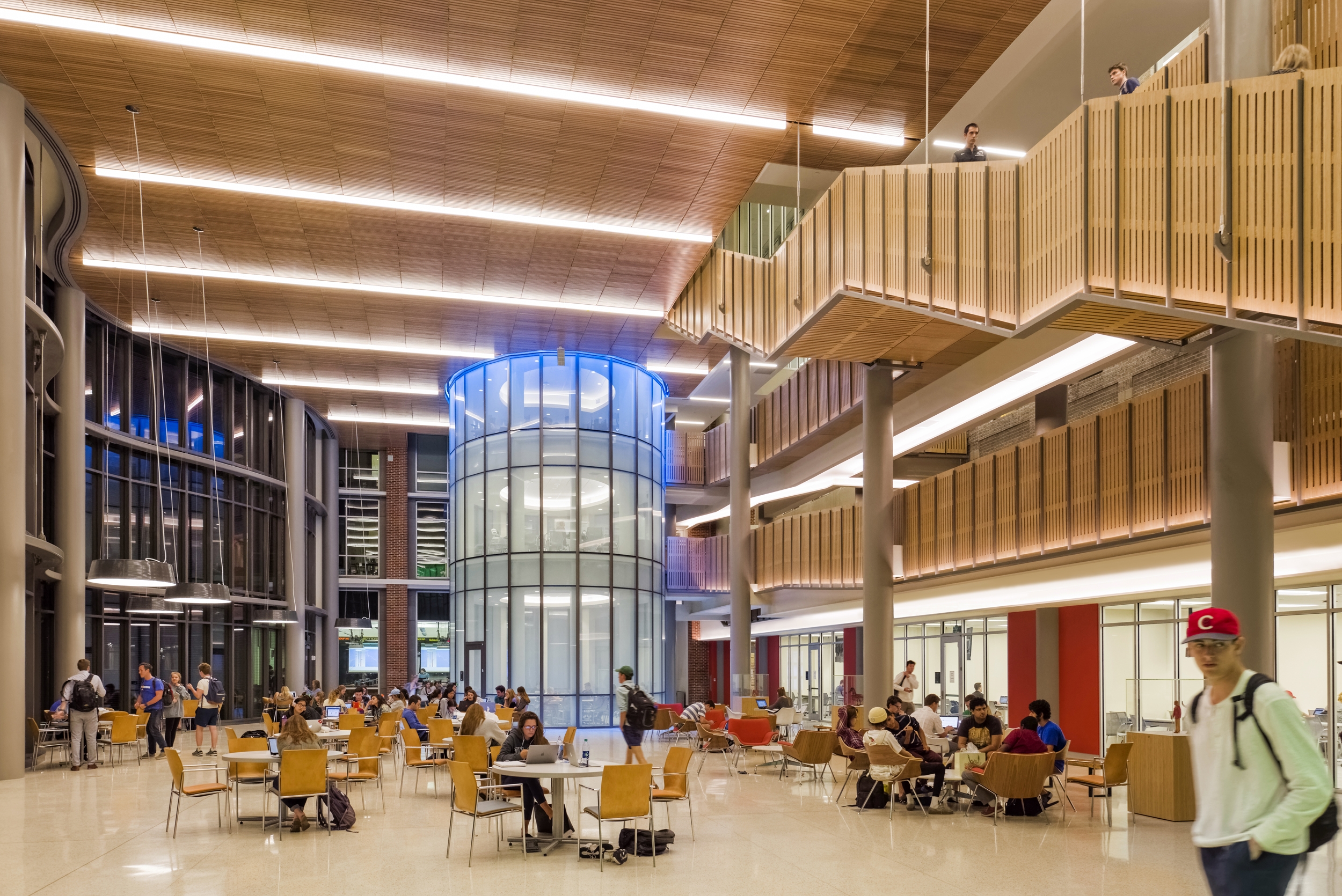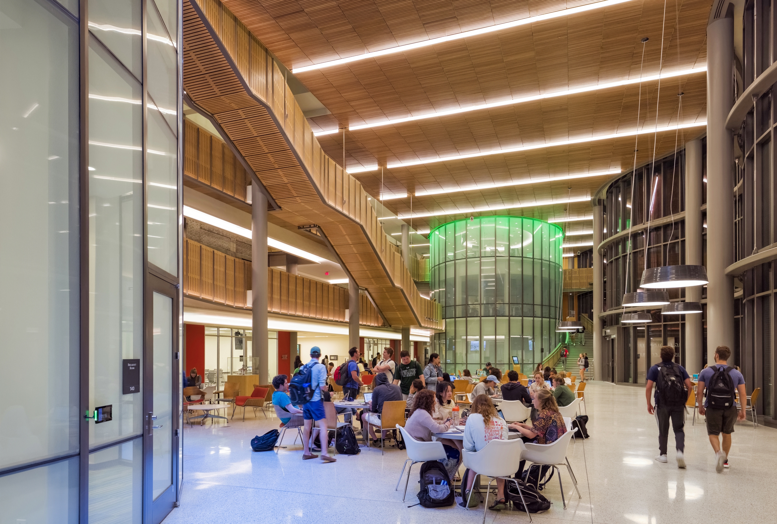 Entry DescriptionThe design intent for this Business School’s expansion was to put education on display, making the learning process engaging. A 42,000 SF addition that links two existing buildings is distinguished by a large, three-story, curving glass wall.