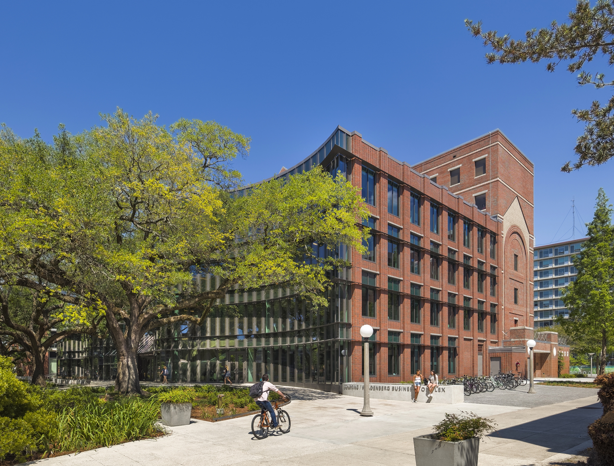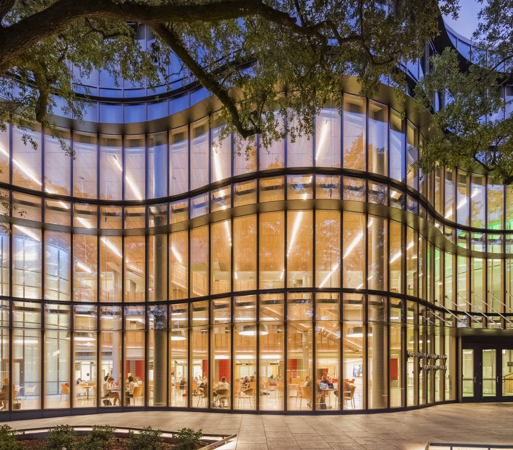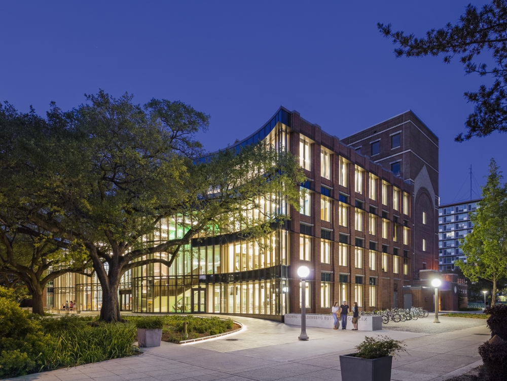 Entry DescriptionThe design intent for this Business School’s expansion was to put education on display, making the learning process engaging. A 42,000 SF addition that links two existing buildings is distinguished by a large, three-story, curving glass wall.