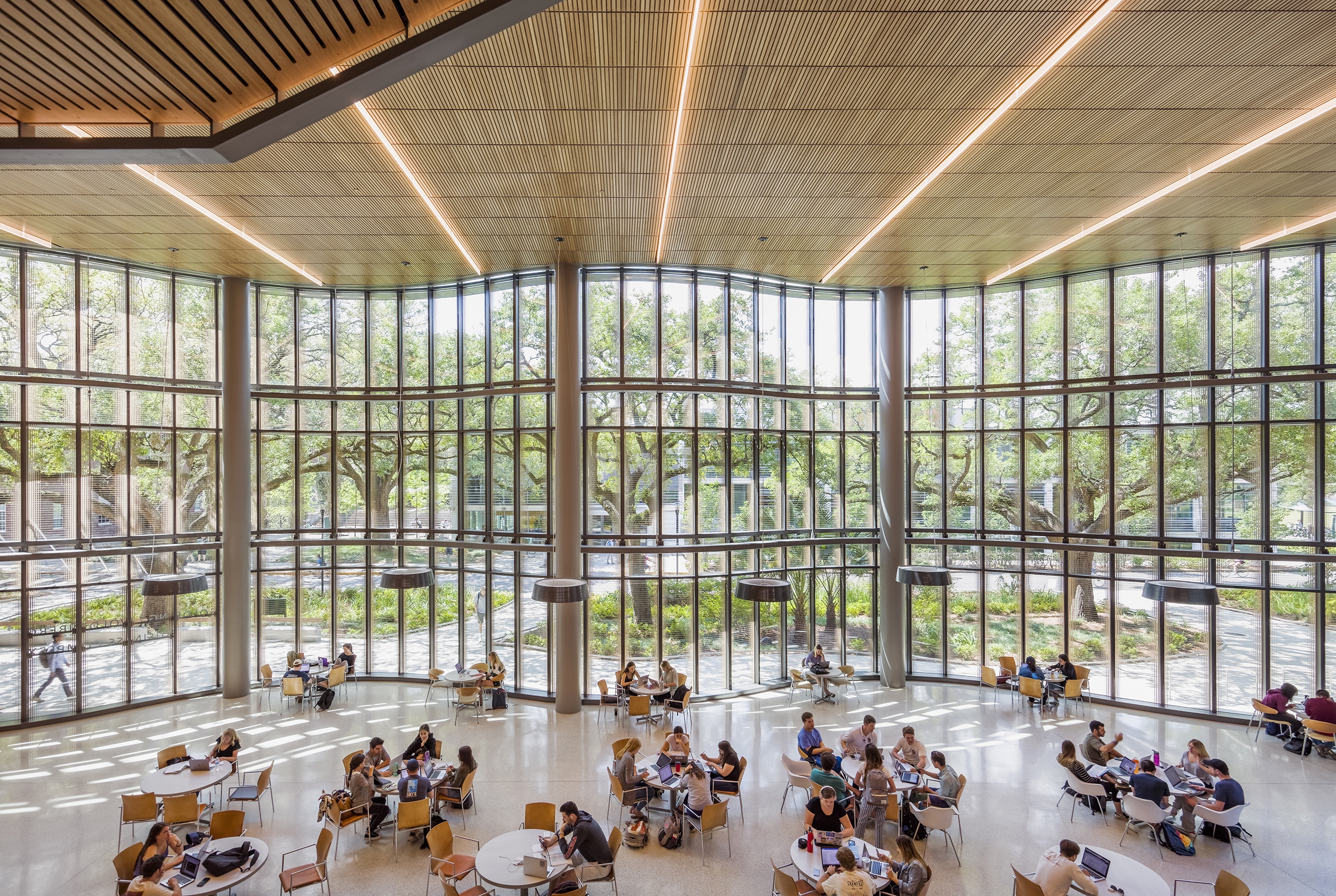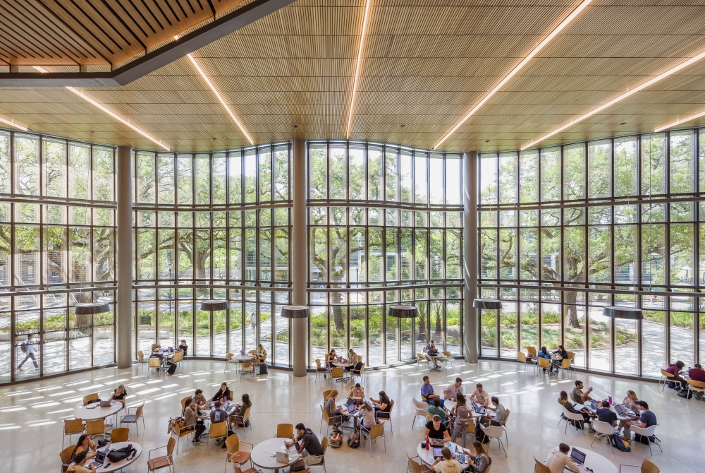 To meet sustainability goals, the lighting is controlled by a daylight harvesting dimming system incorporating photo-sensors.