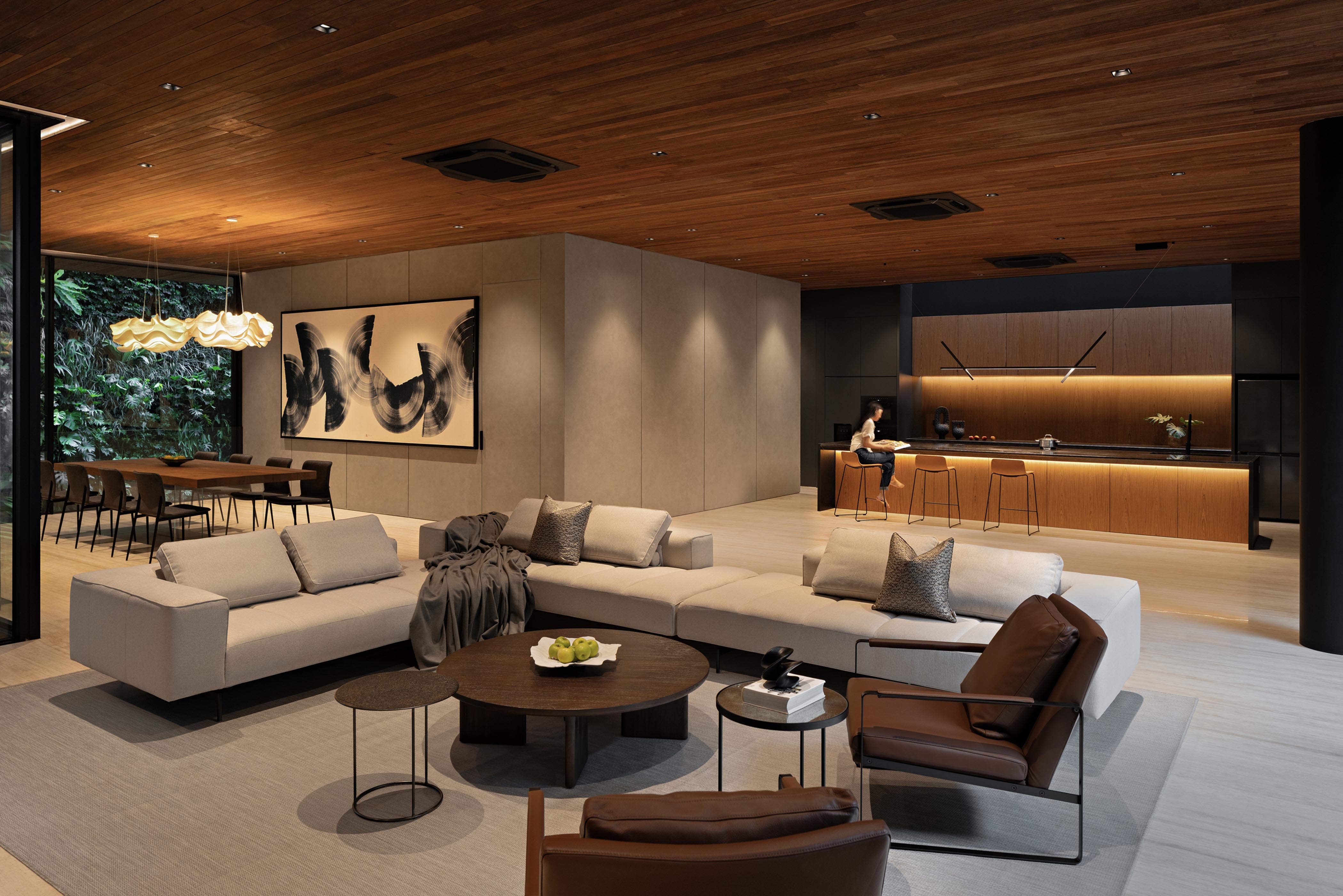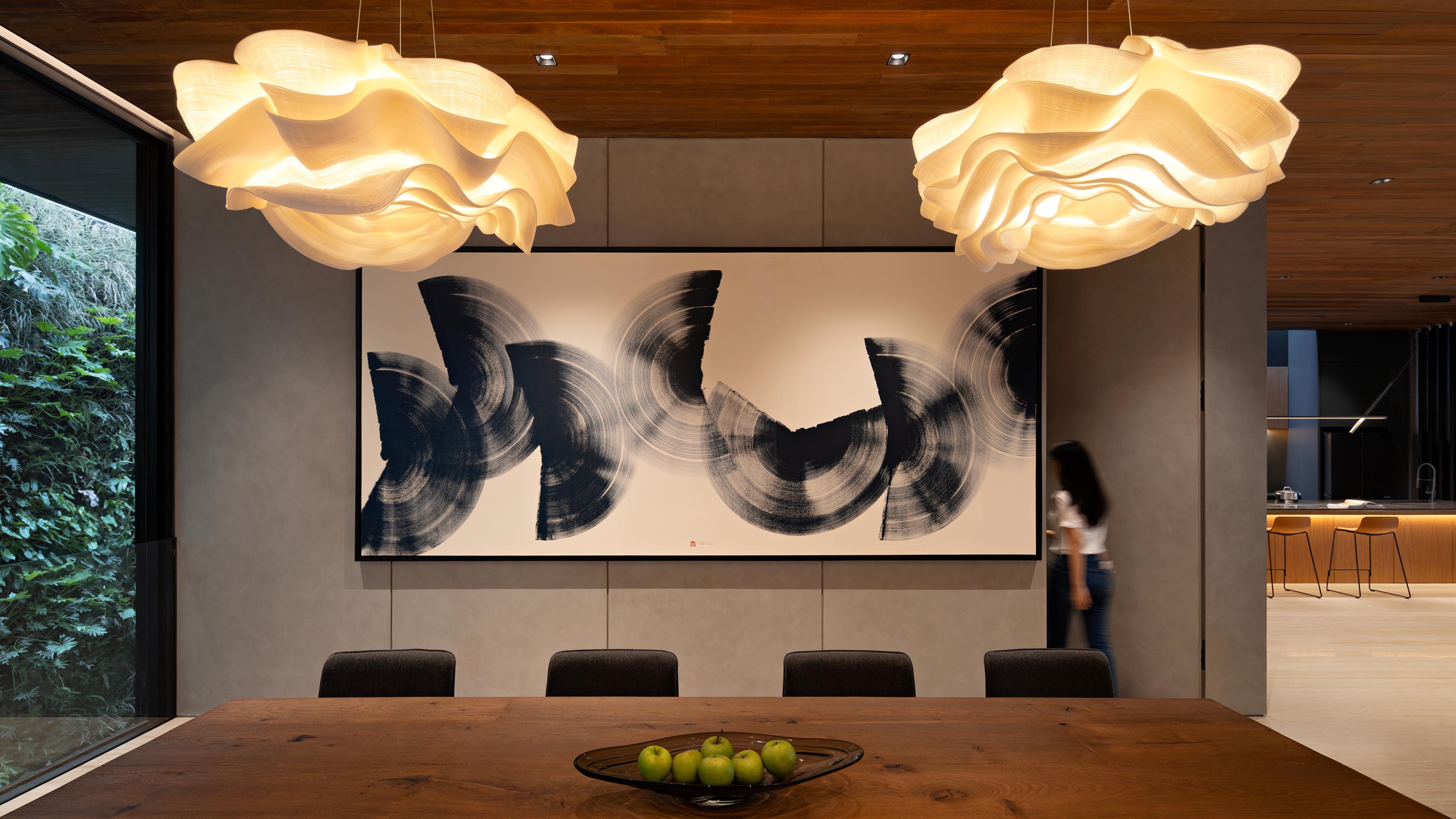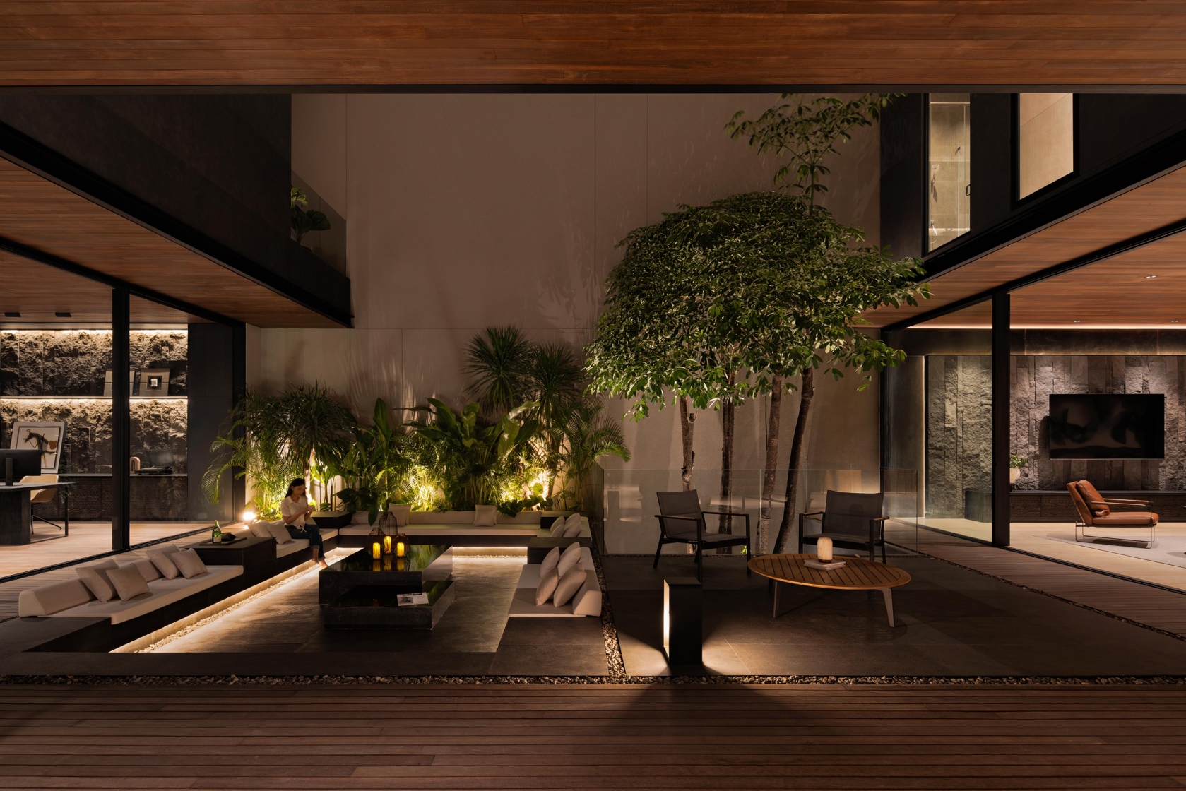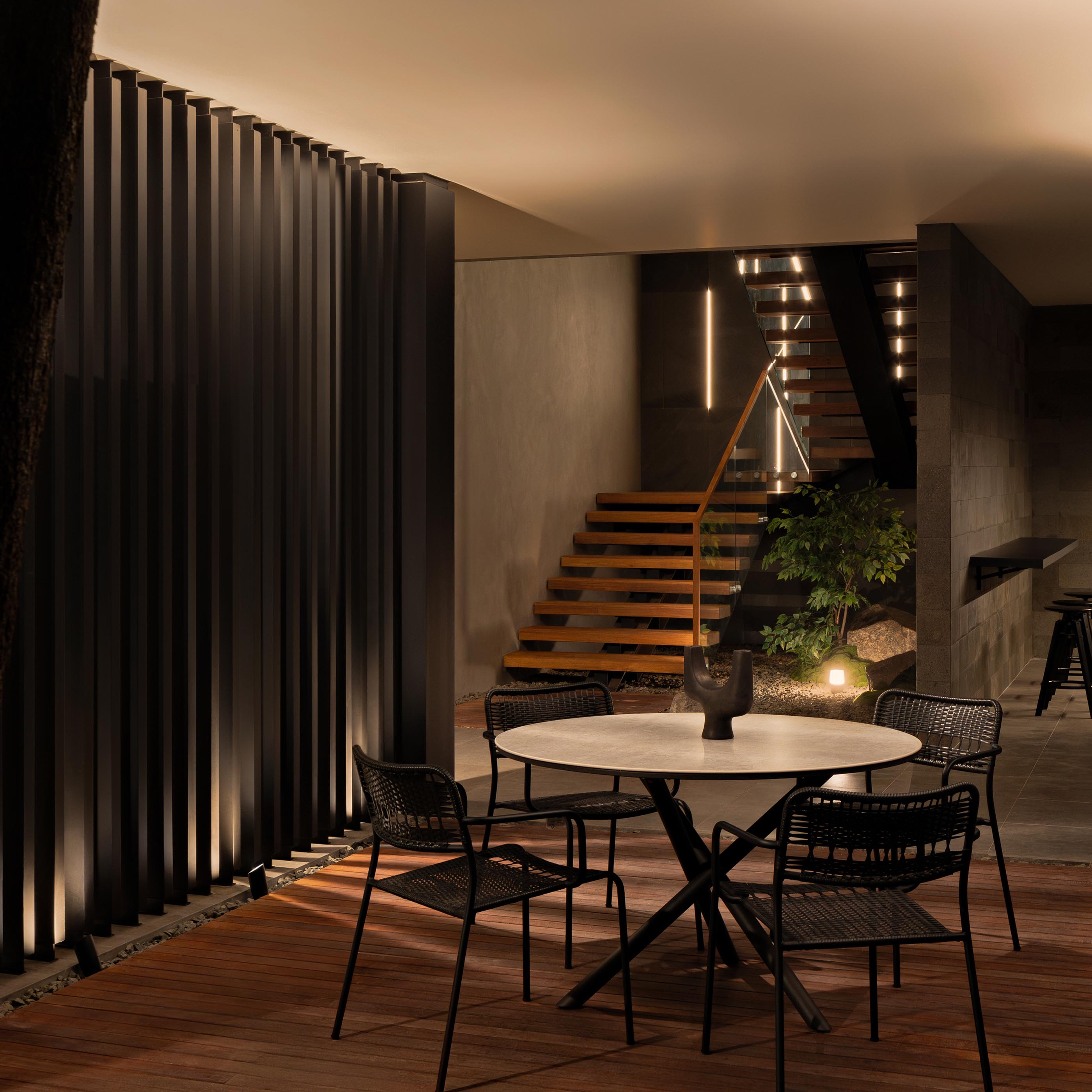 Warm 3000K tones wash teak ceilings and travertine floors, revealing their grain and depth. Concealed grazers animate the volcanic andesite and lava stone, their shadows echoing the tactility of Mount Merapi’s terrain. In the central volume, cove lighting creates a sense of levitation between floors, while the kitchen void becomes a luminous well, its sculptural downlights mirroring the verticality of the space.