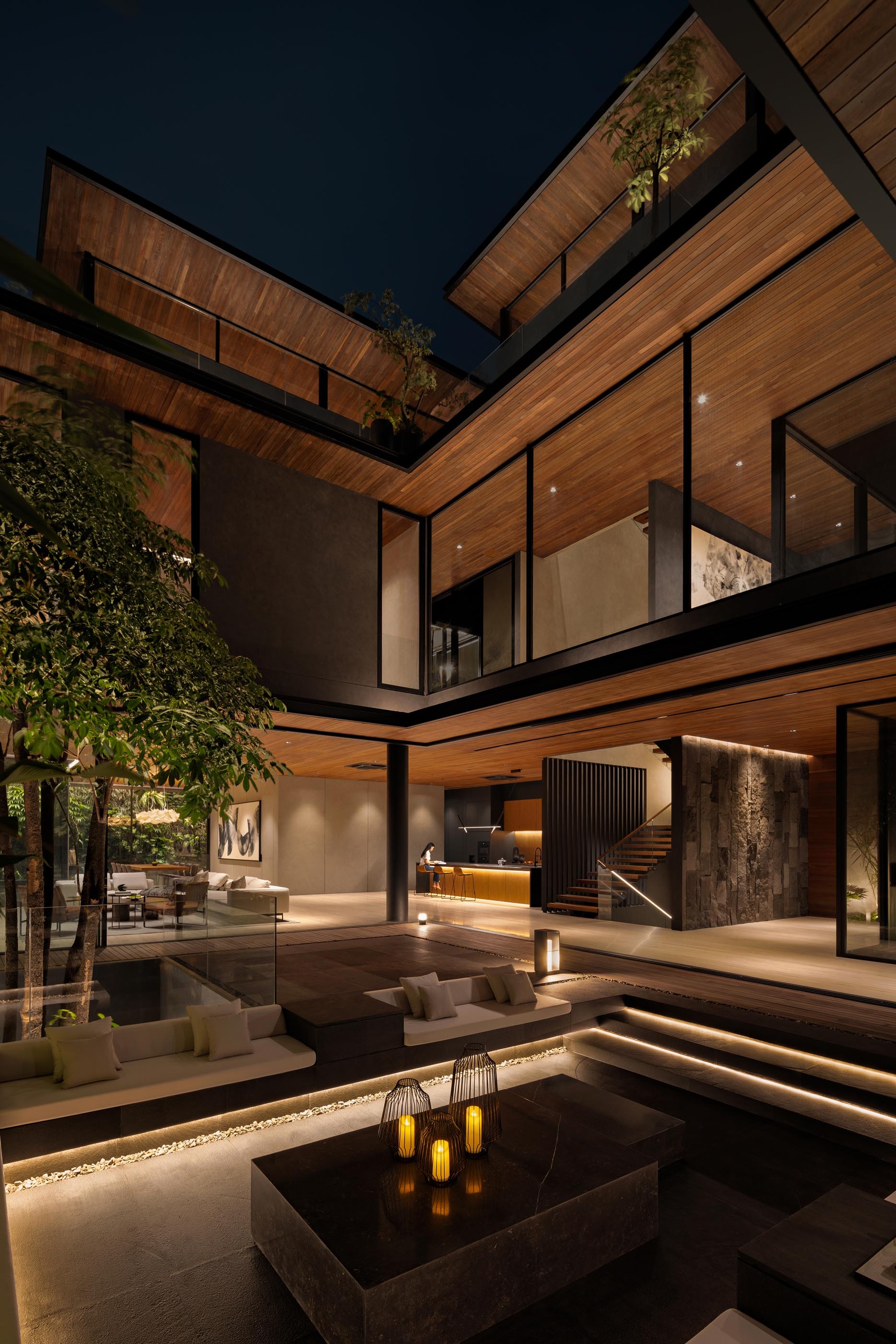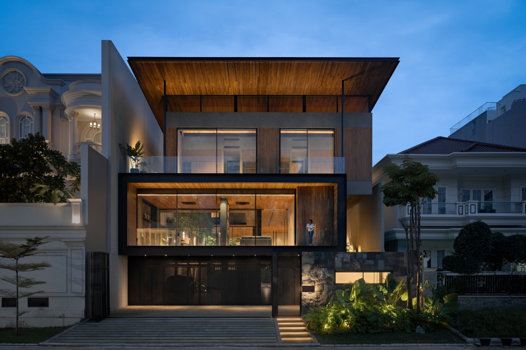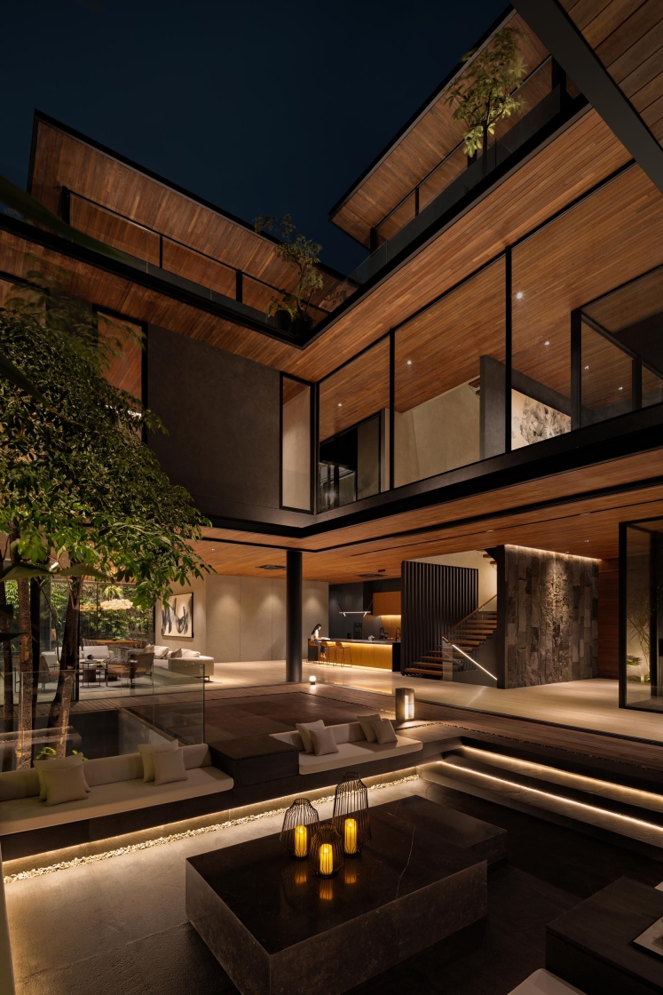 Entry DescriptionIn a home shaped by carved voids and layered courtyards, light becomes the architecture’s most fluid material. By day, openings and vertical gardens harvest Jakarta’s shifting daylight, drawing it deep into the plan. By night, the lighting design reinterprets this openness-transforming voids into glowing lanterns, stone walls into textured canvases, and circulation paths into ribbons of quiet guidance.