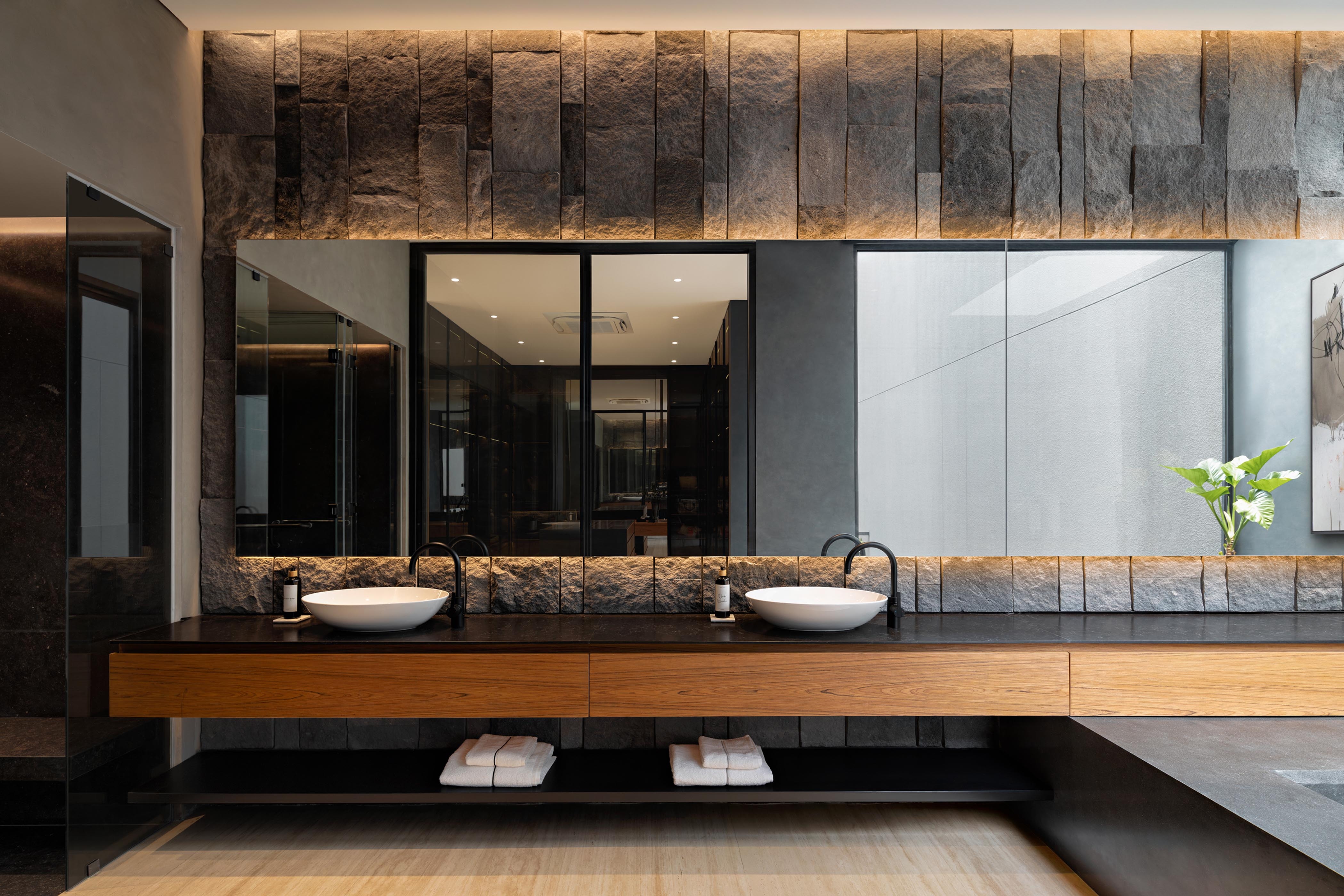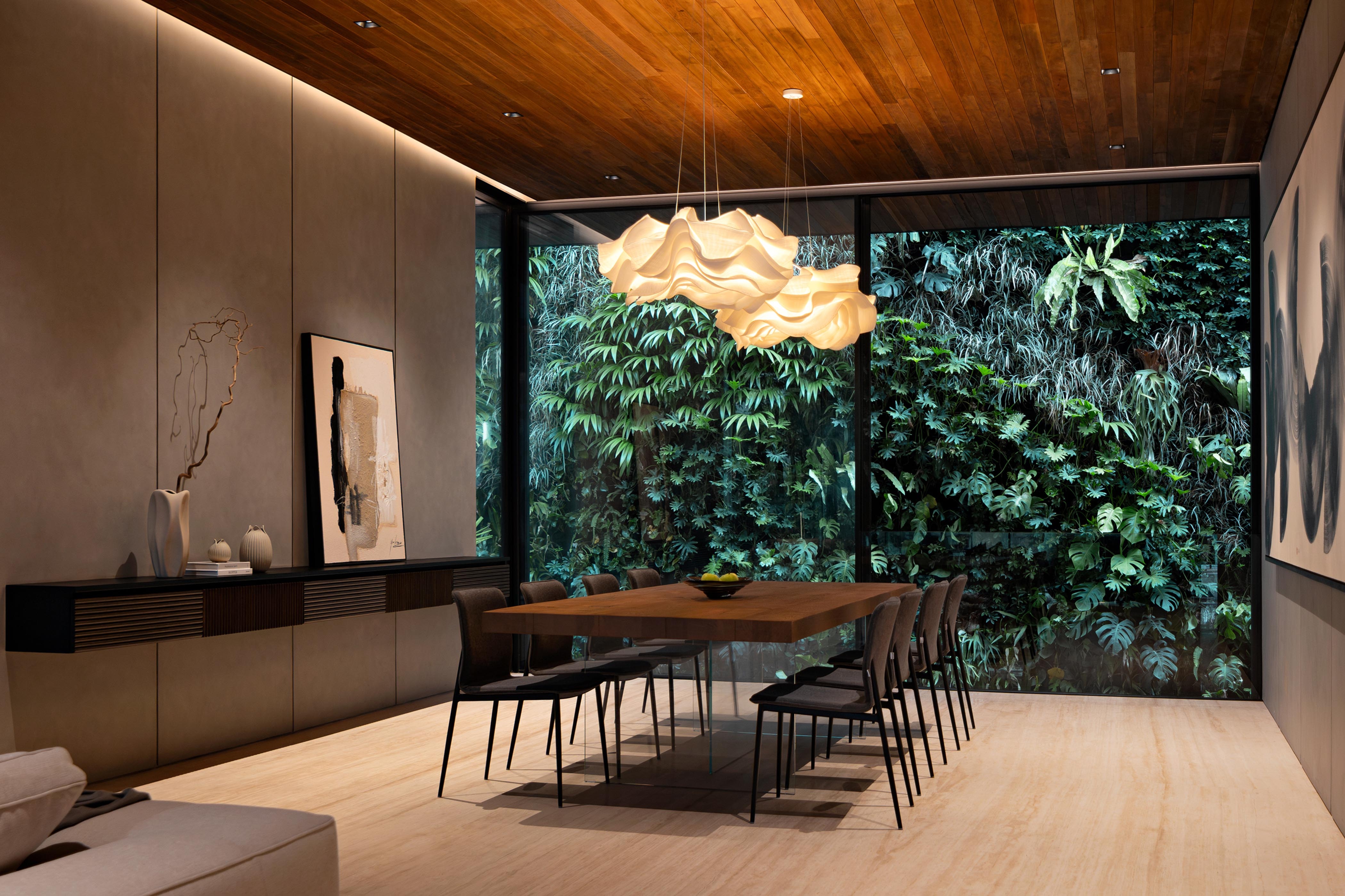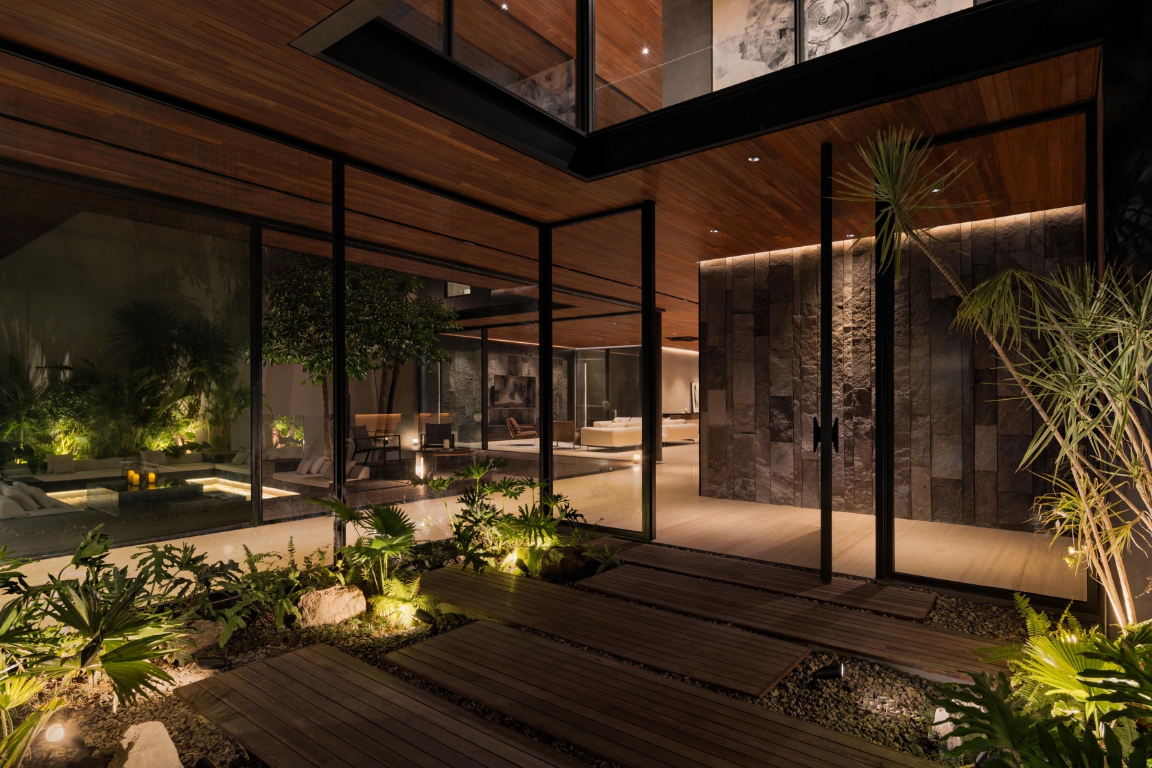 Entry DescriptionIn a home shaped by carved voids and layered courtyards, light becomes the architecture’s most fluid material. By day, openings and vertical gardens harvest Jakarta’s shifting daylight, drawing it deep into the plan. By night, the lighting design reinterprets this openness-transforming voids into glowing lanterns, stone walls into textured canvases, and circulation paths into ribbons of quiet guidance.