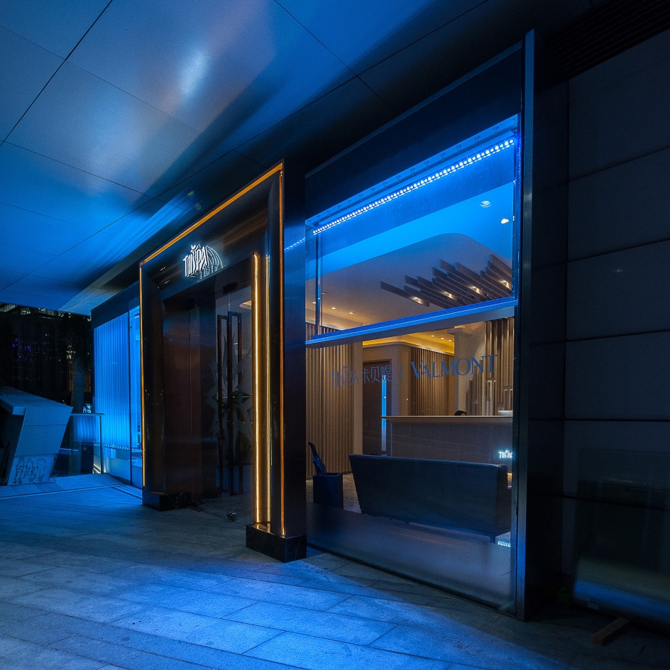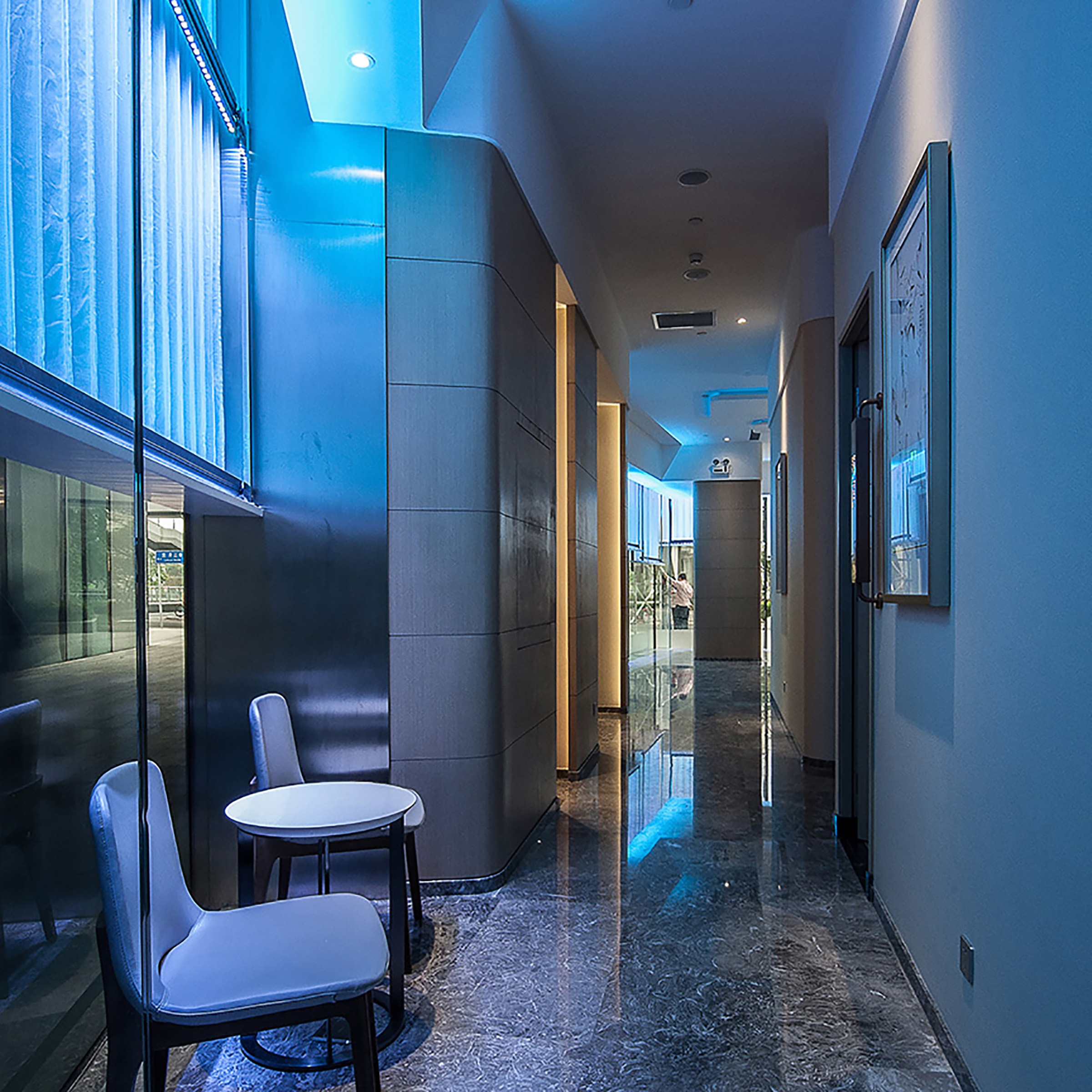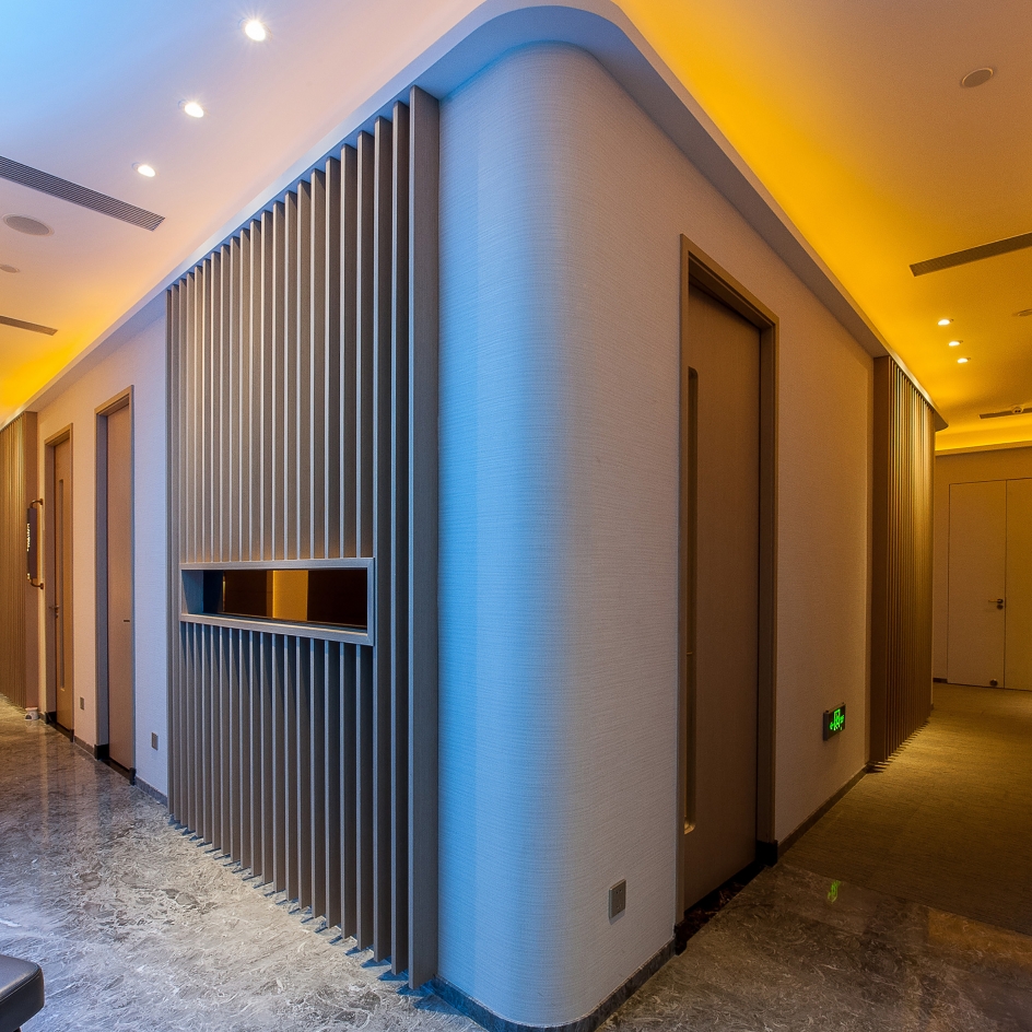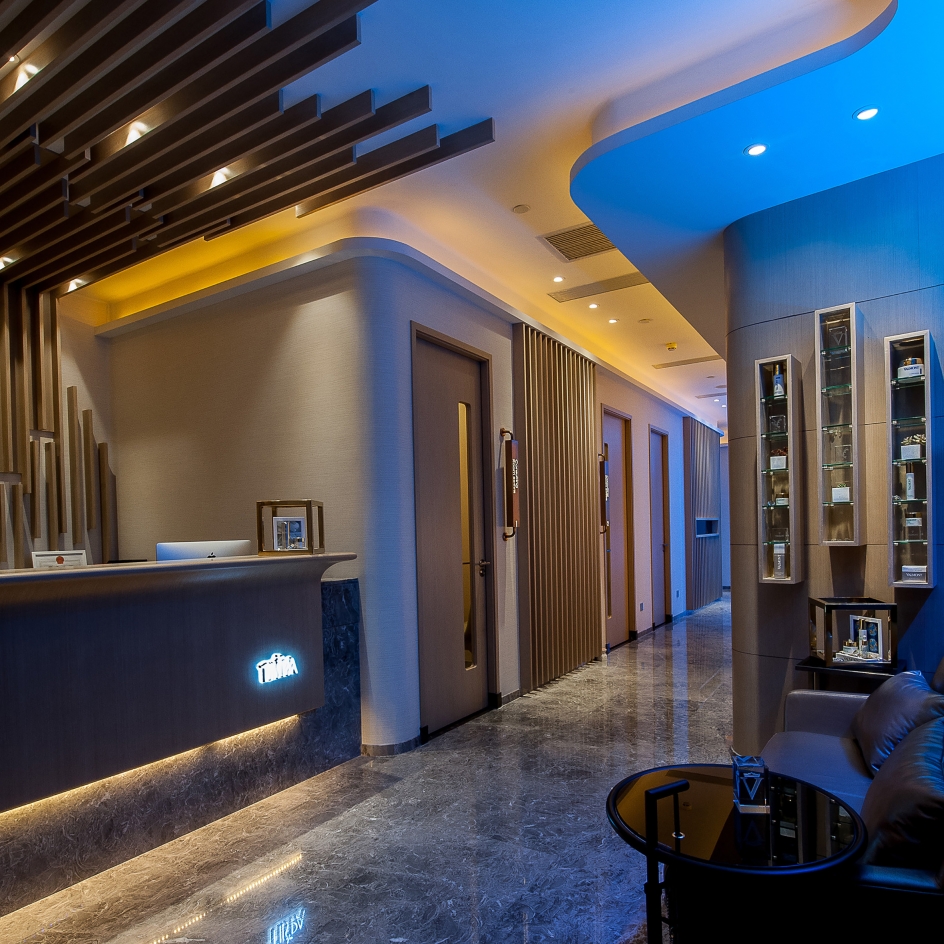 The full high glass wall feature (waterfall) material was used white curtain and blue color led light high line the curtain feel the water on the glass wall to flow. Reception counter designed material were nickel sliver stainless steel and mable. all wall designed beige color wallcovering and some brown wood pattern. The reception ceiling designed brown wood strip ceiling. interior ceiling light i design the light trough to high line all ceiling It's like a Neatly arranged stone house. In all room i put in some modern style with the people feeling inside nature style have some modern.
