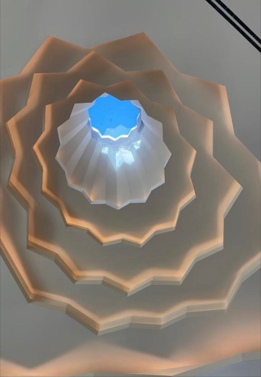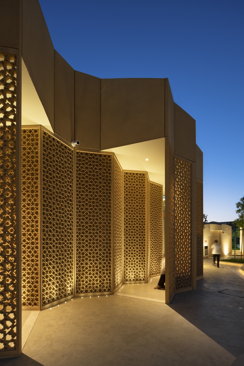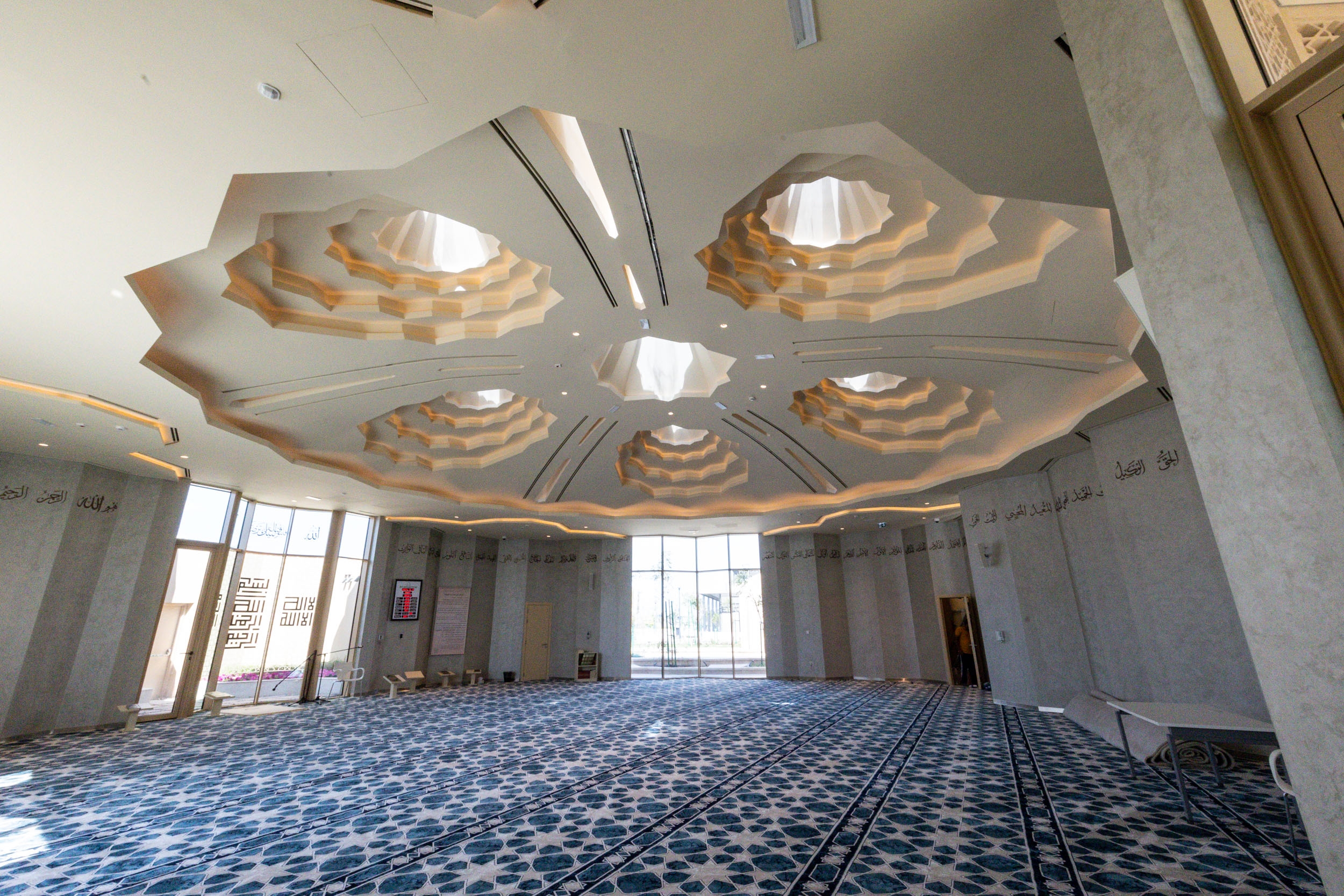 The prayer hall integrates natural and artificial light to enhance spirituality. Five sculptural skylights, symbolizing the five daily prayers, channel daylight into the space, creating a celestial glow. Mashrabiya screens soften exterior light, reinforcing the meditative ambiance. Artificial lighting ensures harmony—recessed lights define the ceiling’s geometry, uplights highlight Quranic calligraphy, and indirect cove lighting enhances the depth of the skylights. Warm dimmable LEDs and motion sensors optimize energy use.