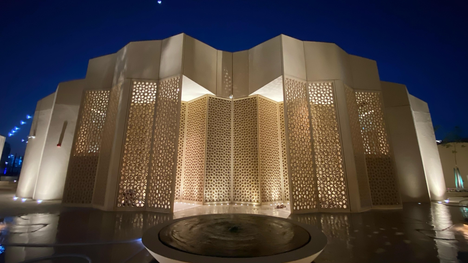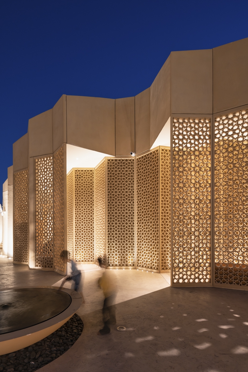Inspired by the divine symbolism of illumination, the mosque’s design transforms traditional patterns into a play of light and shadow. The façade lighting is subtle, using uplights to highlight geometric purity, while interior lighting filters through mashrabiya screens, casting intricate patterns onto the landscape.