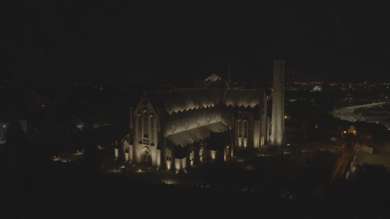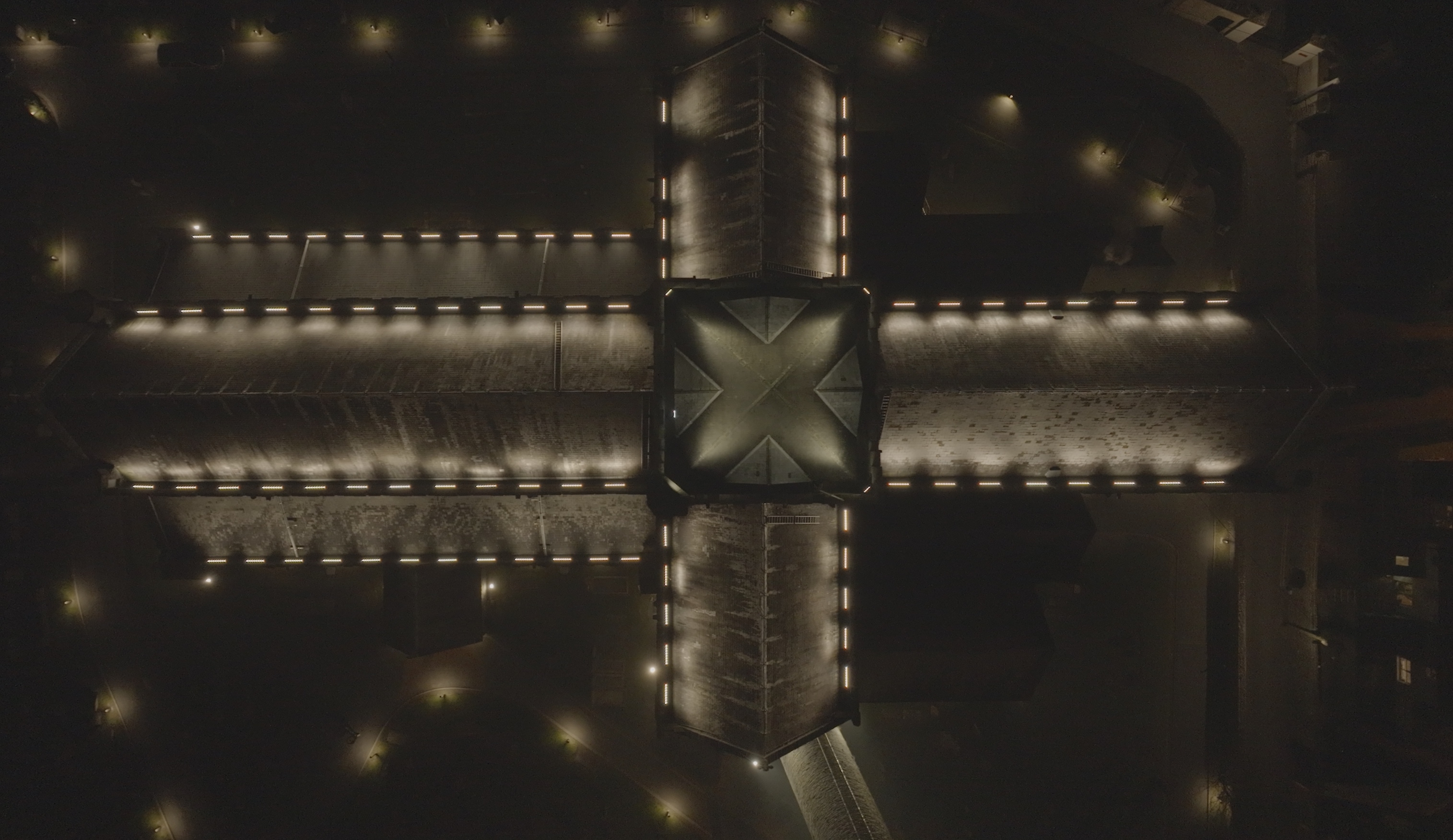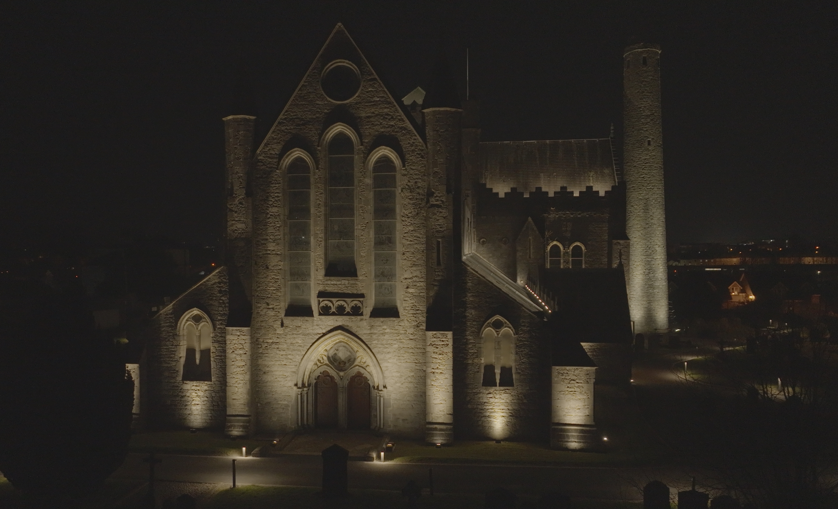 We removed the flood lighting and replaced it with three tiers of lighting. Firstly we placed linear battens with an asymmetric beam behind the parapets at the upper and mid roof levels. This illuminates the slate roof of the cathedral. This element has color changing capacity as the client wanted to be able to mark events in the building. We used luminaries with a dedicated white to ensure correct color rendering.