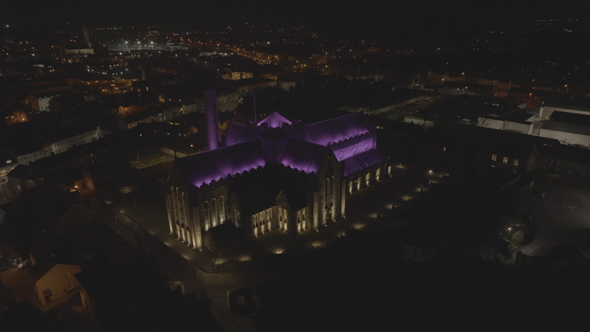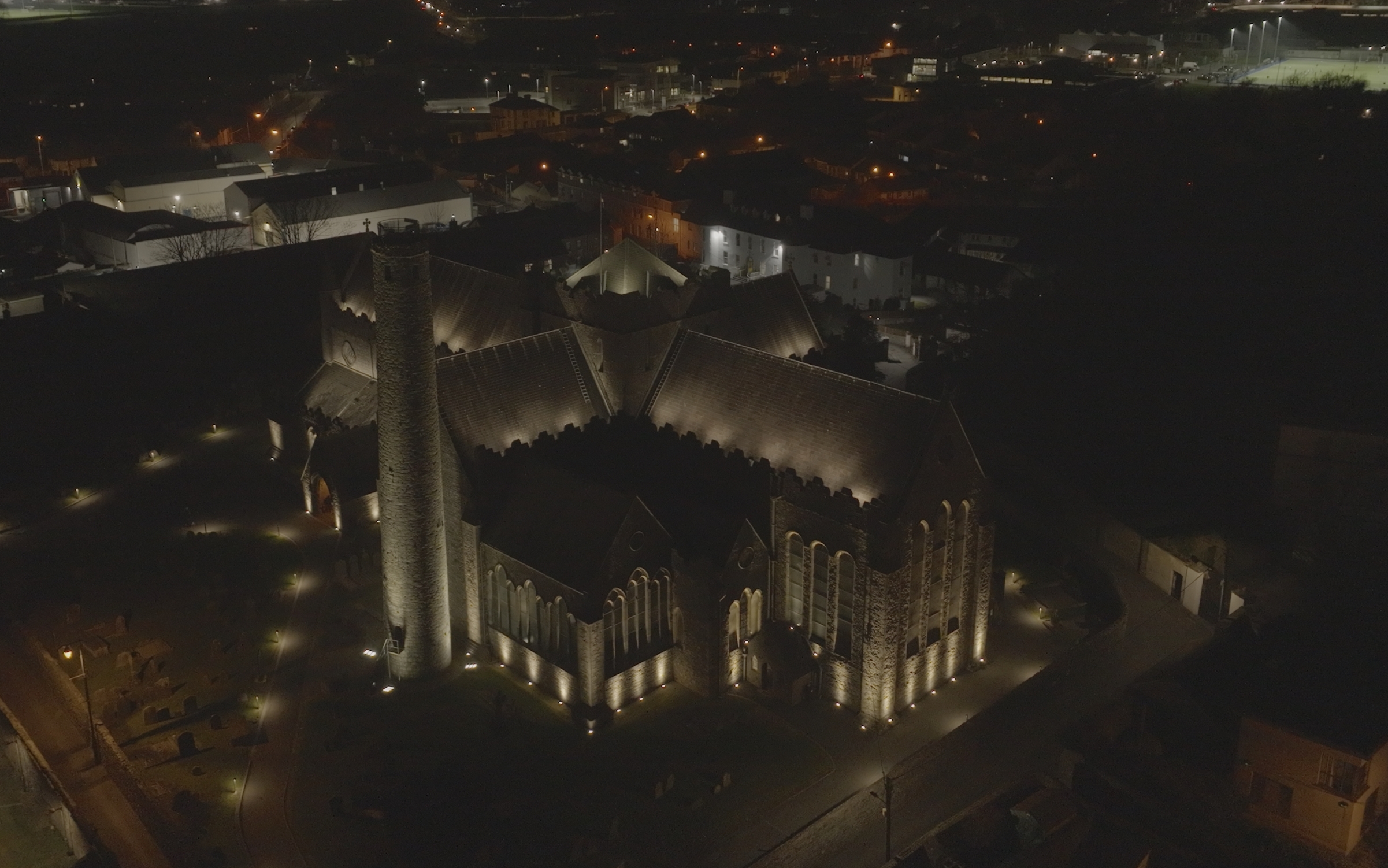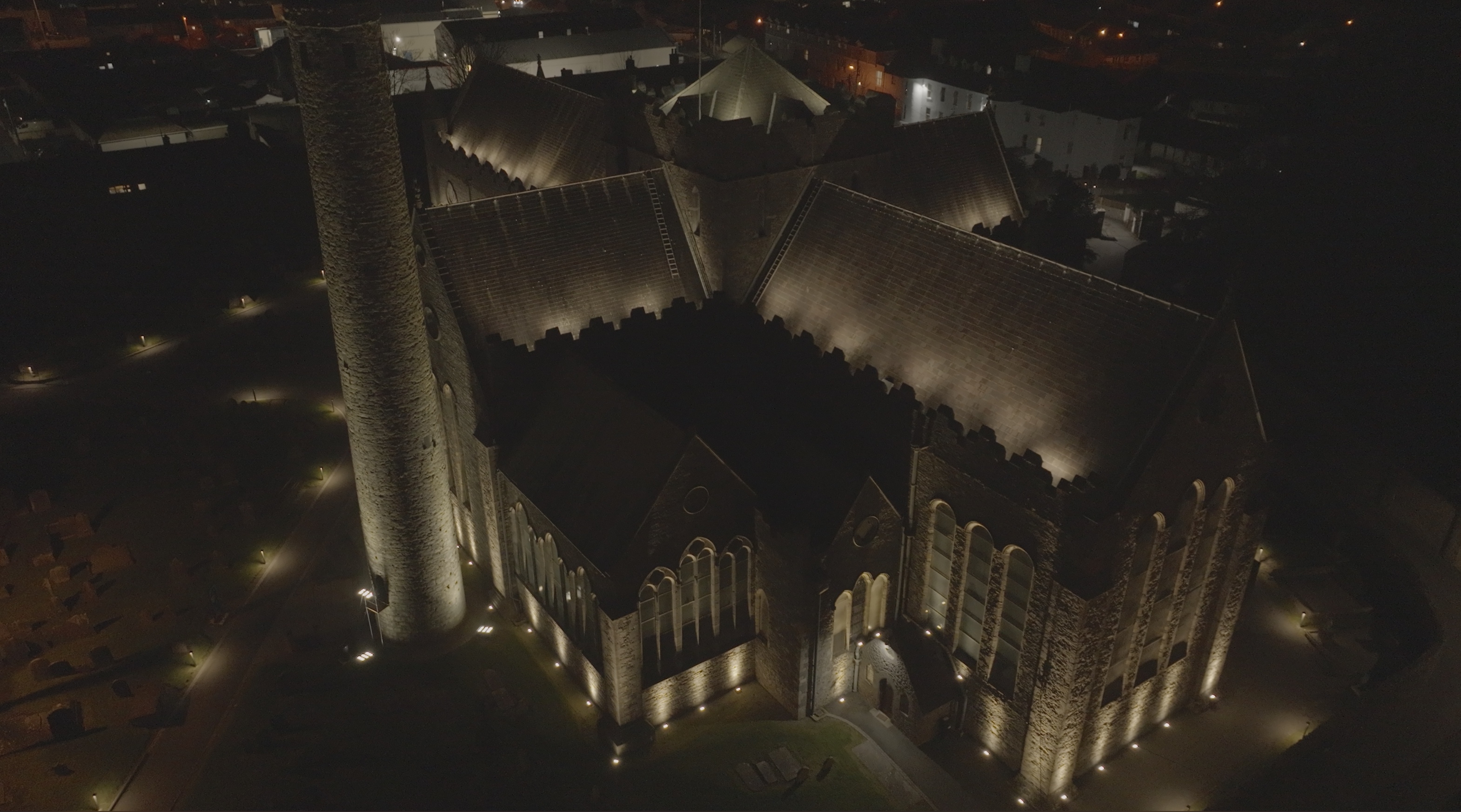 We removed the flood lighting and replaced it with three tiers of lighting. Firstly we placed linear battens with an asymmetric beam behind the parapets at the upper and mid roof levels. This illuminates the slate roof of the cathedral. This element has color changing capacity as the client wanted to be able to mark events in the building. We used luminaries with a dedicated white to ensure correct color rendering.