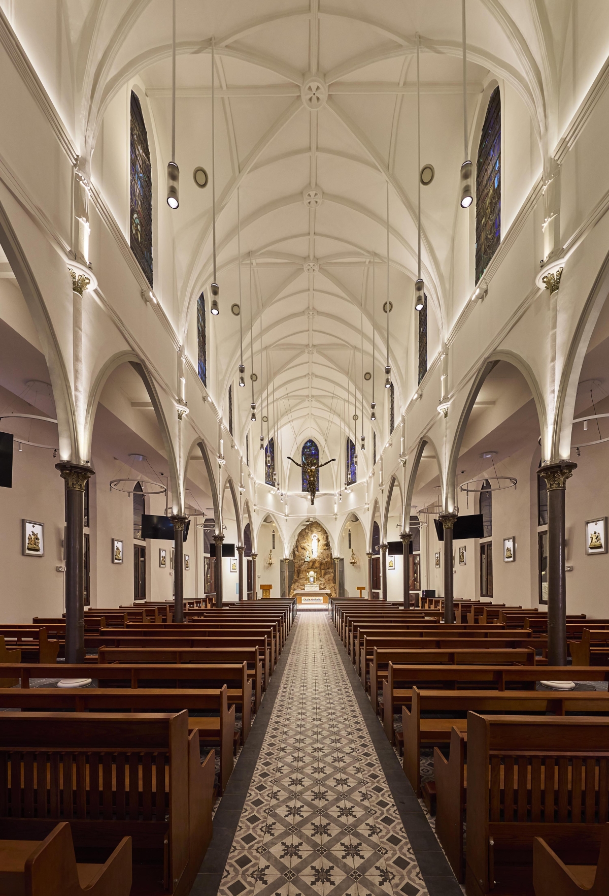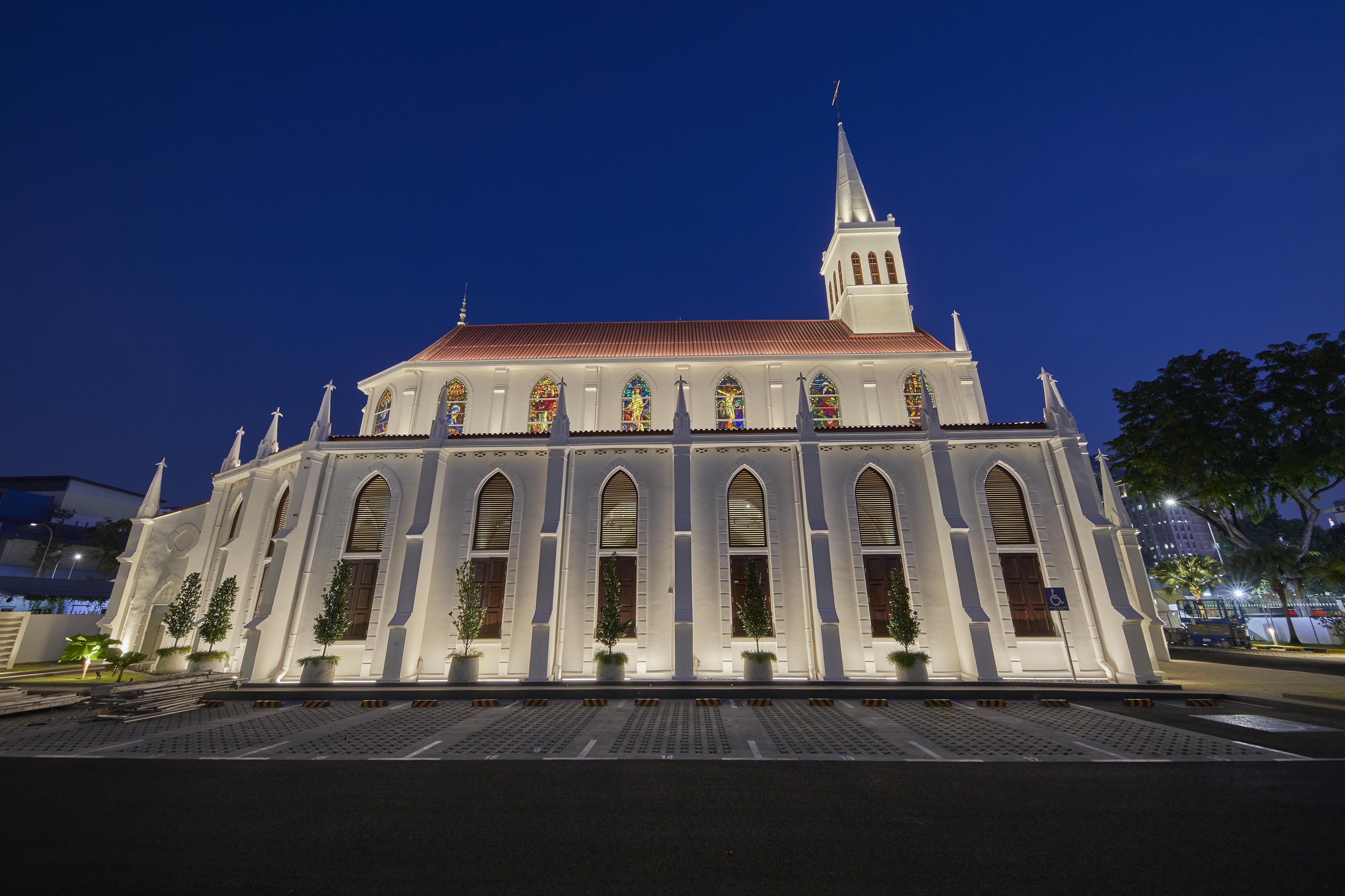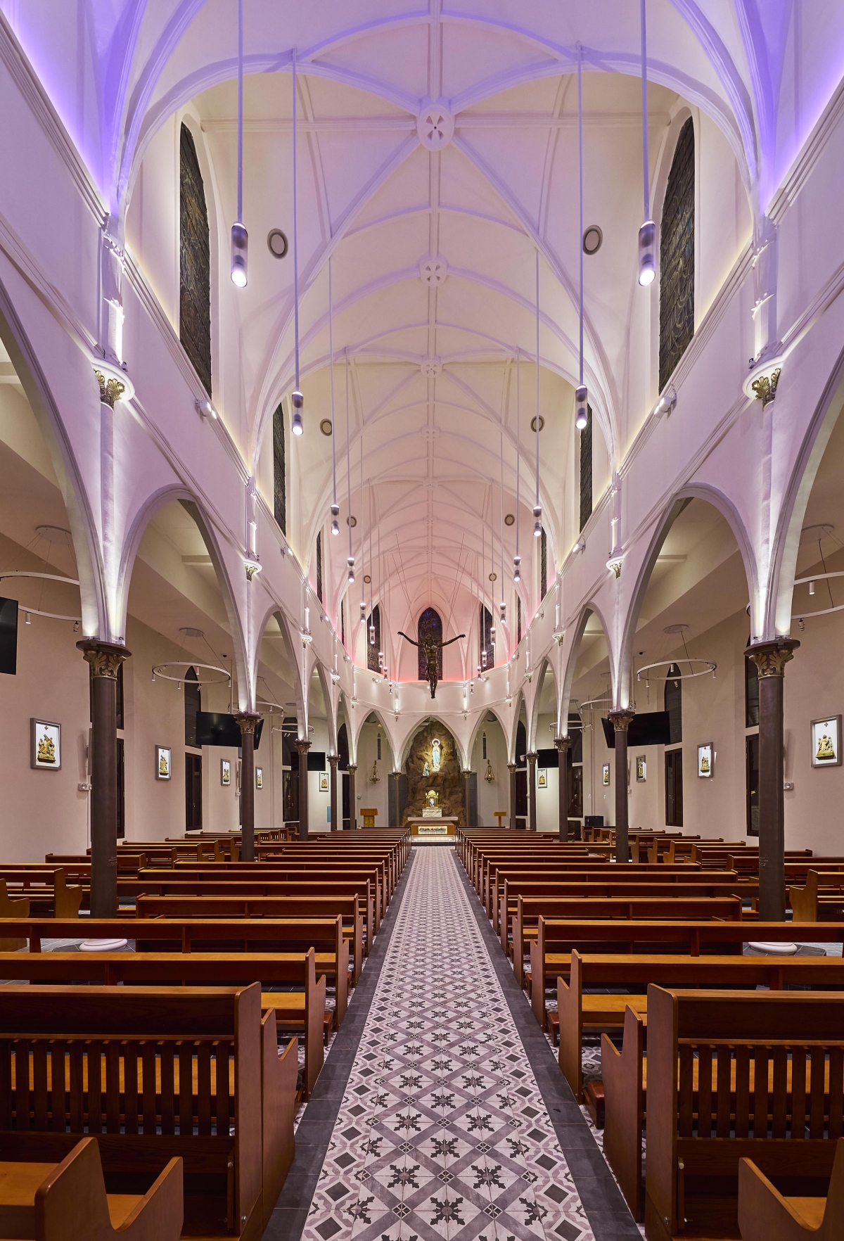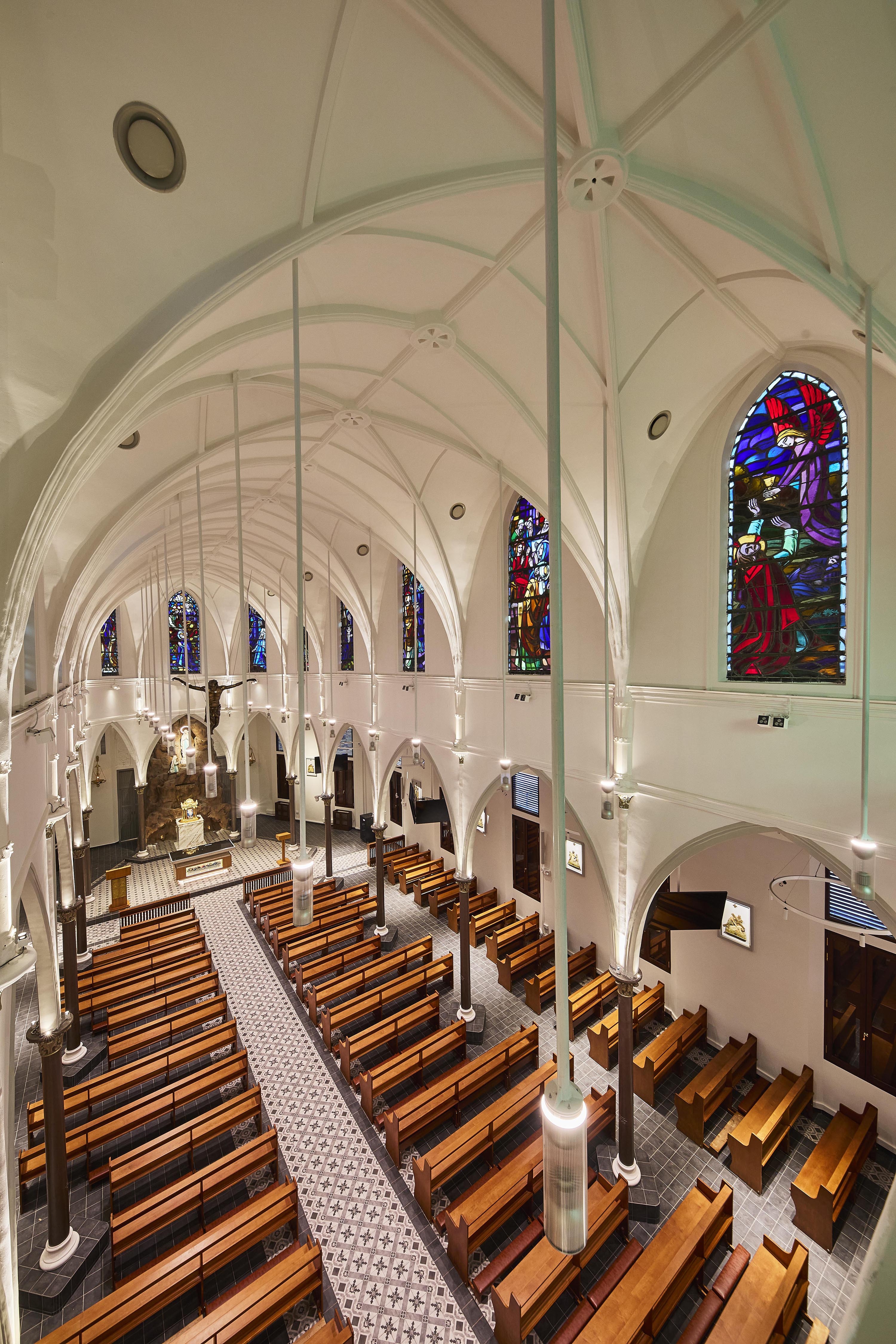Entry DescriptionChurch is a neo-Gothic monument. Careful consideration on placement of new luminaires, the overall façade and positioning surface type wall-mounted uplighters at the corners of columns so that the columns appear as shadow, while walls are lit. Façade lighting was to integrate and enhance the overall layers and elements and also illuminating the stain glass windows lining the clerestory from the interior so that they can be appreciated from outside, while also illuminating the interiors and features sensitively with various scenes from day to night. LED strip and profile were also integrated on the edges of the roof to gently illuminate the upper walls and sloped roof. For the interior, lighting various elements and layers, including introduction of new modern pendants with up and downwards emission on different circuit, so that they can be dimmable and controlled separately. 5 degree beam spotlights were strategically placed opposite side of the stain glass windows to illuminate the stainglass to be seen from outside, without having uncomfortable spill. 4 degree beam spotlights were used mounted on the mezzanine floor to accentuate the levitating Tiny spotlights were also mounted on the top of the columns to uplight the vaults and arches. A simple RGBWW strip were also integrated to respond to the client’s request for flexibility for various scenes on special occasions.