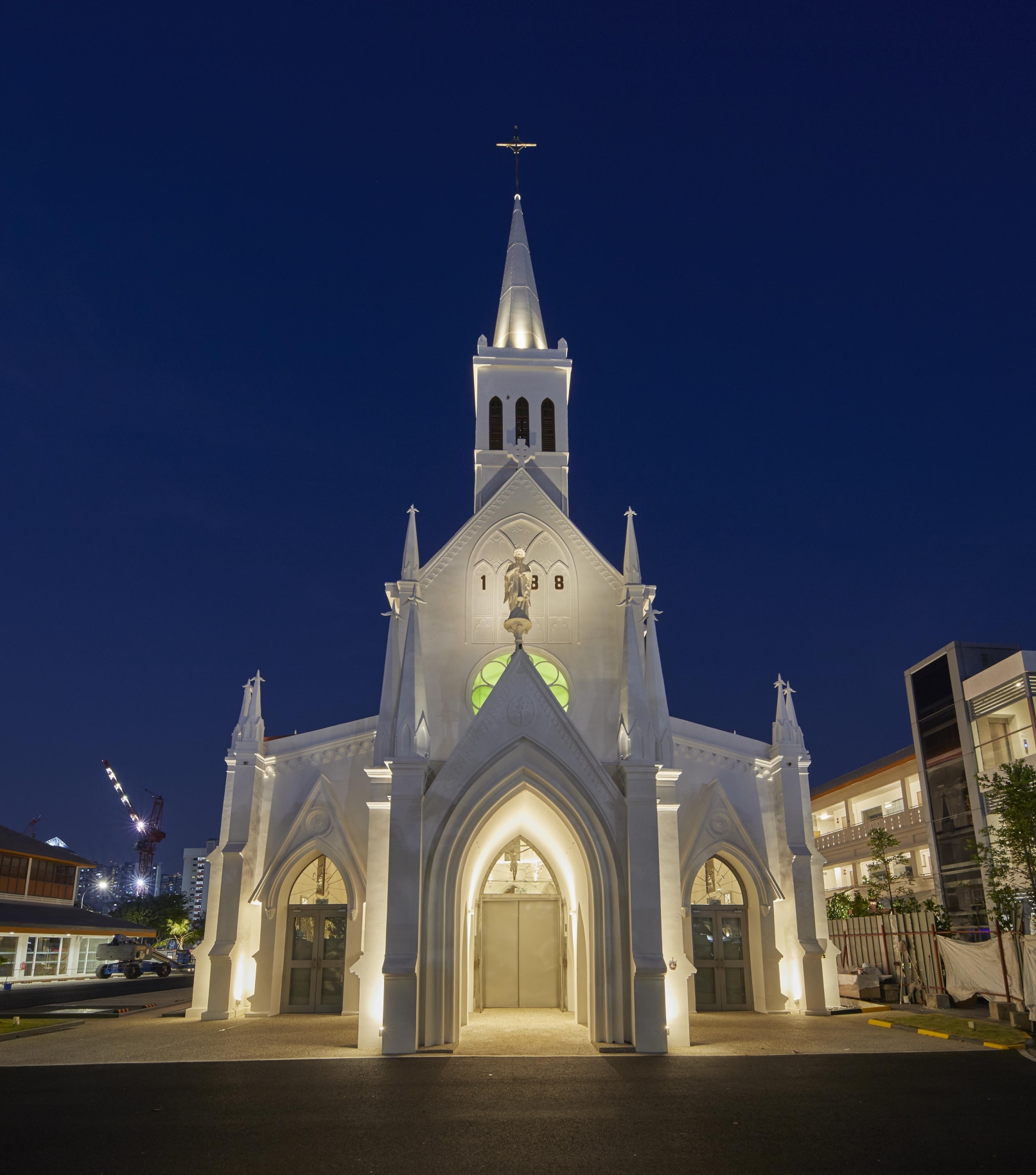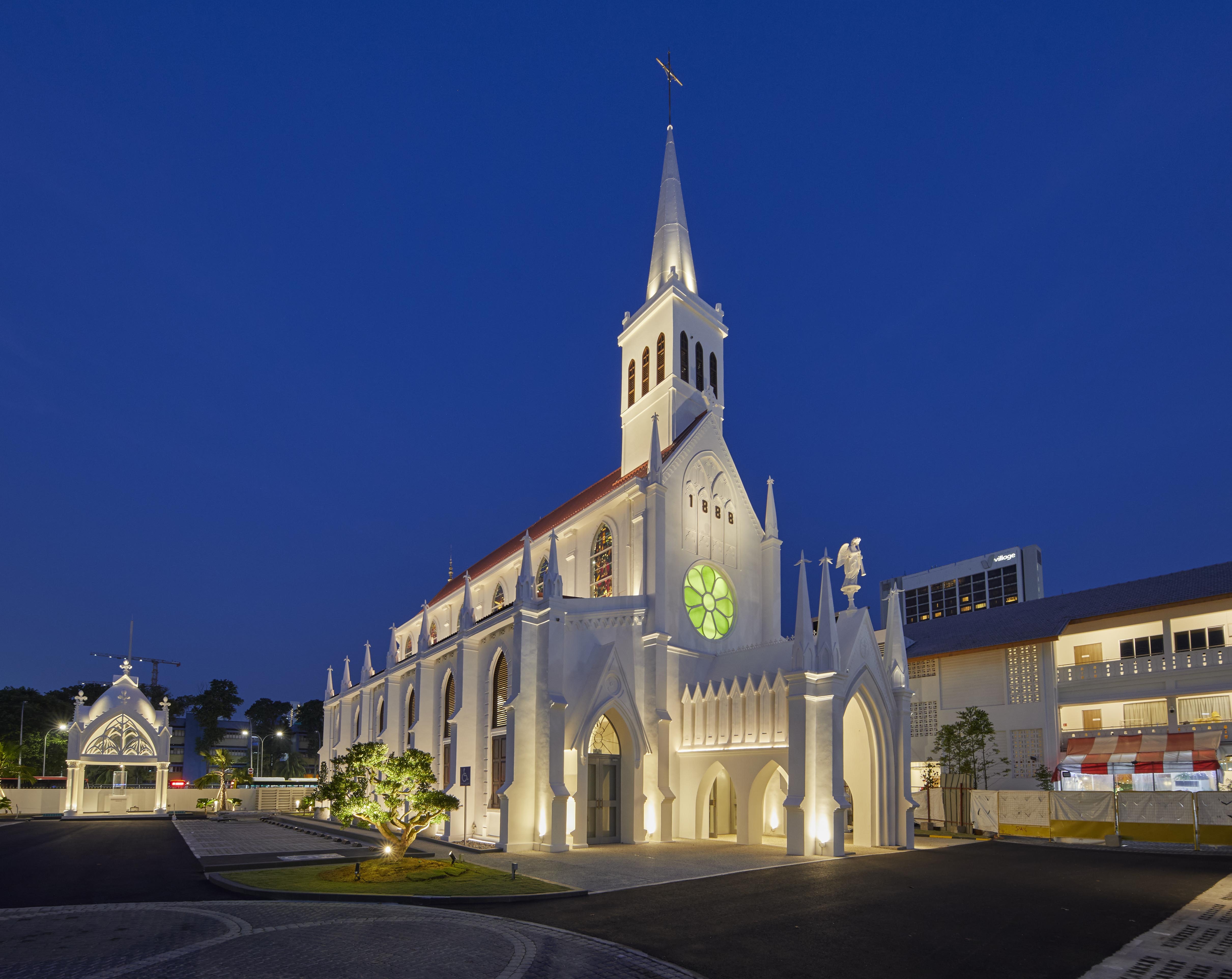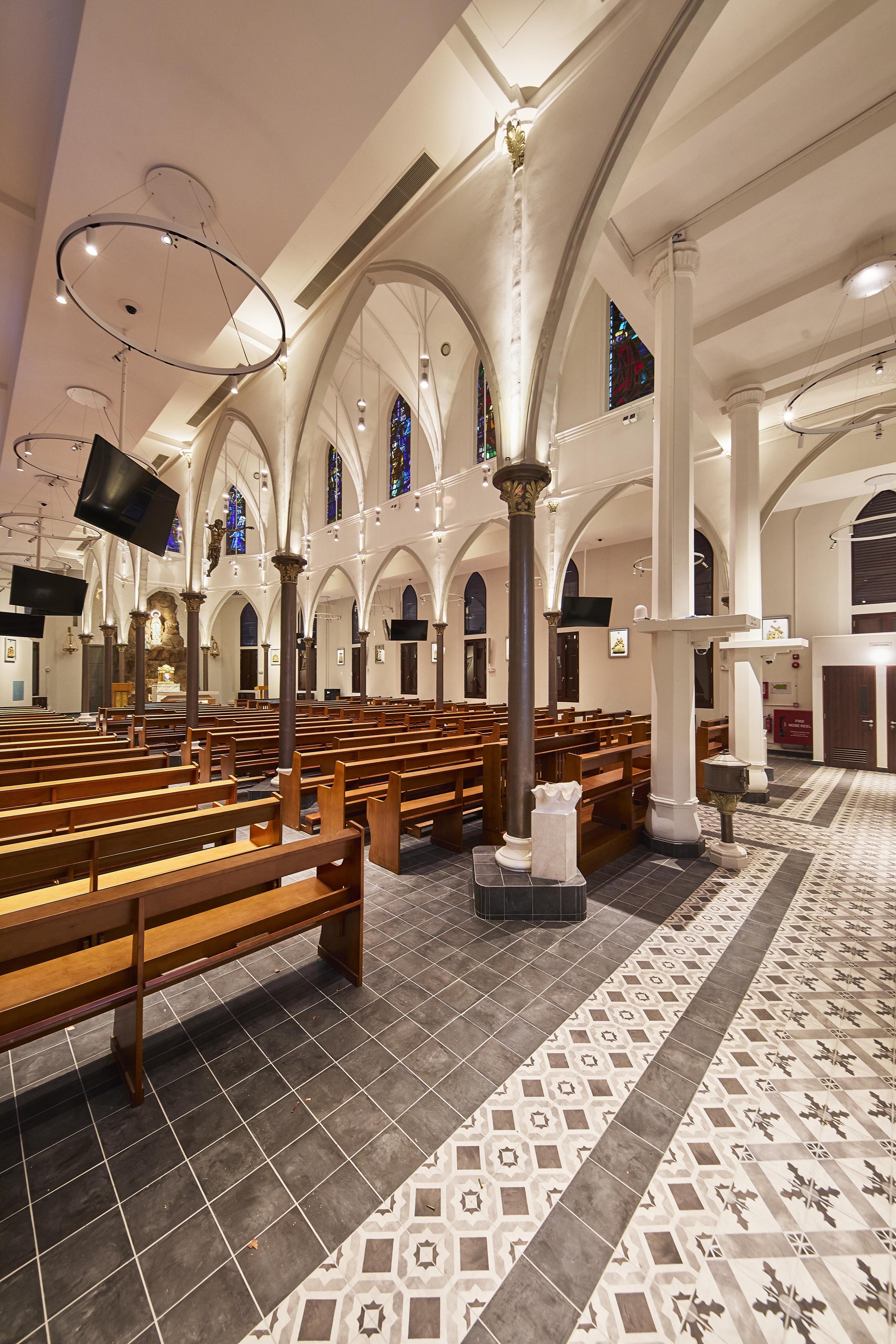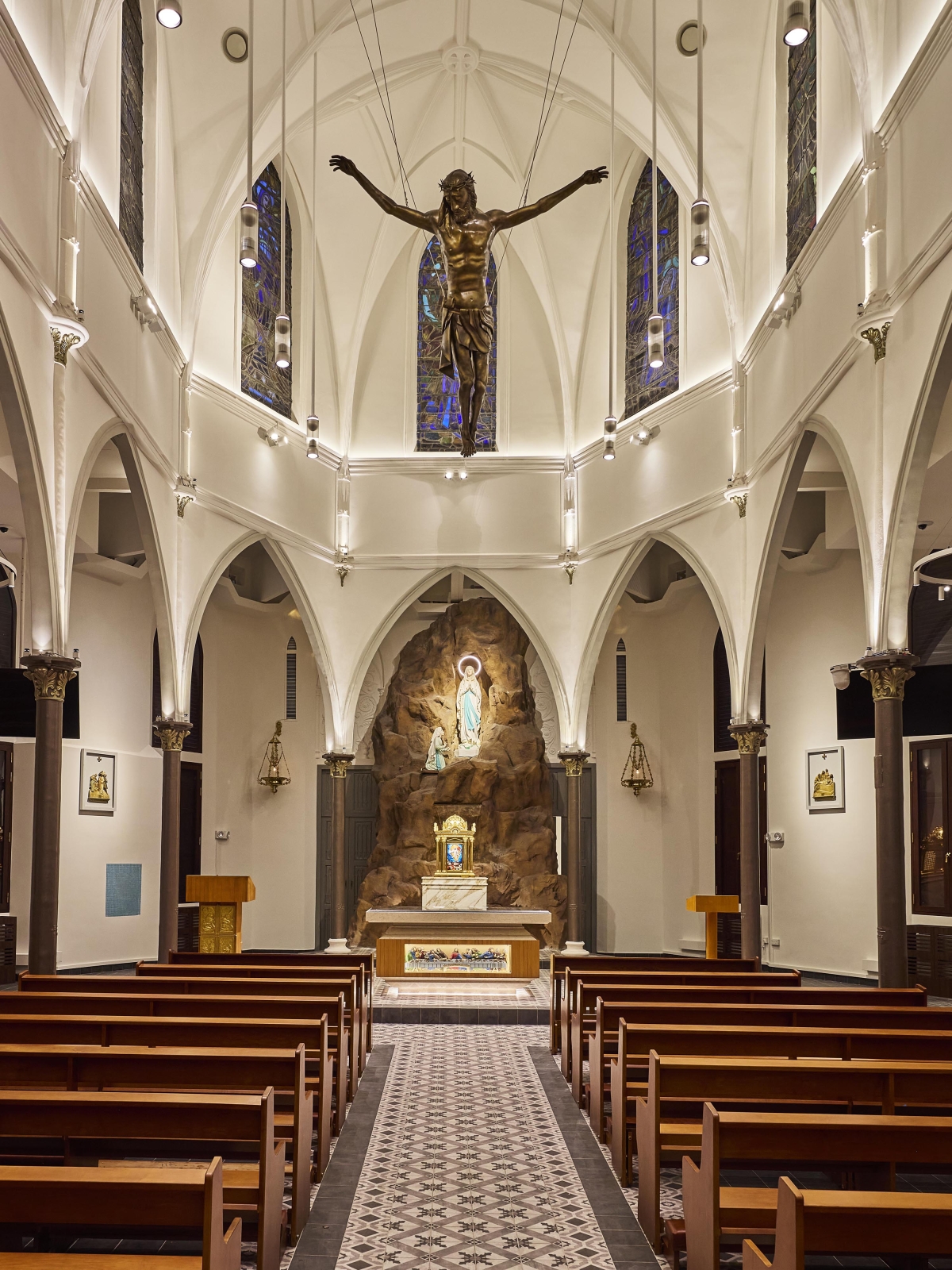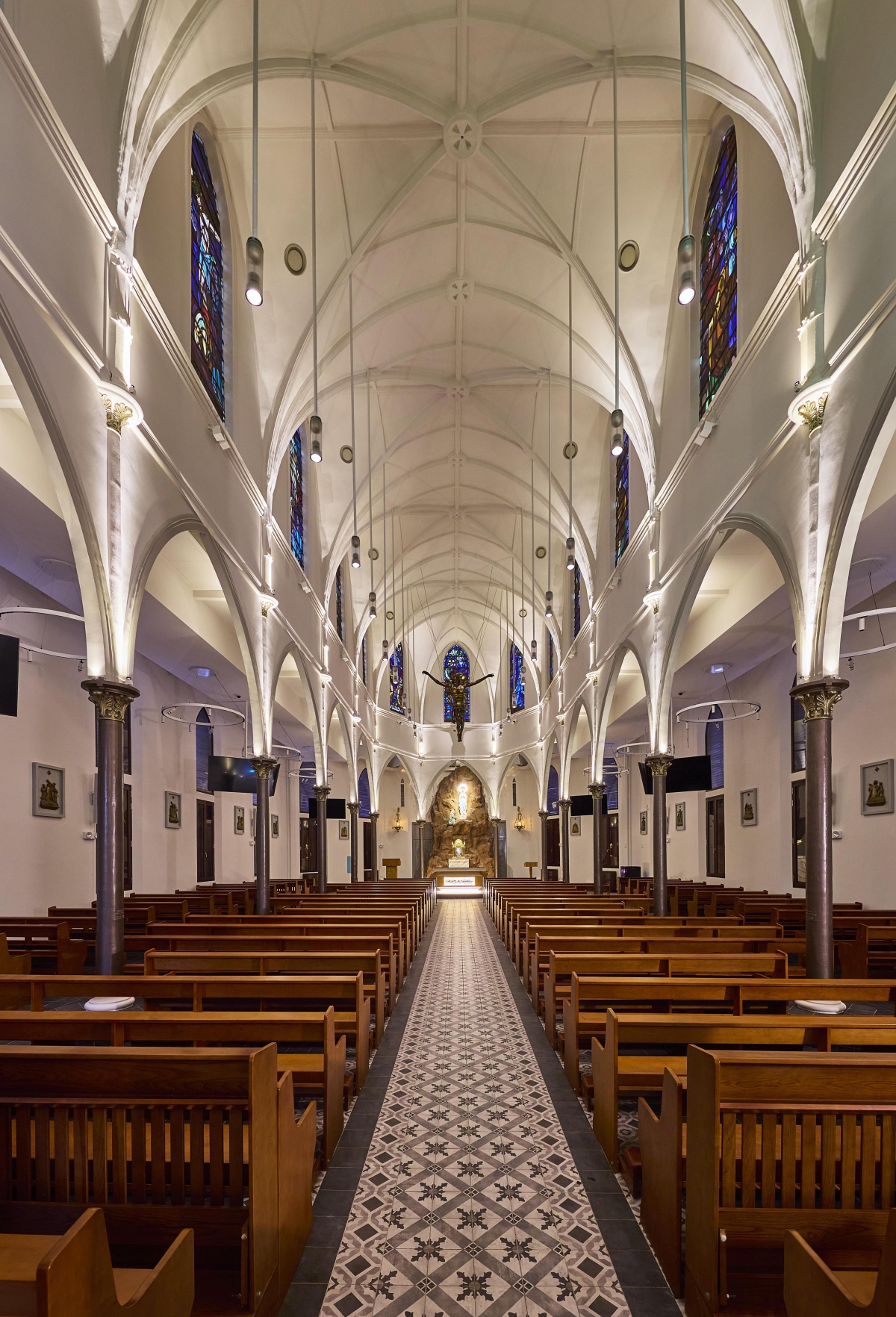 Entry DescriptionChurch is a neo-Gothic monument. Careful consideration on placement of new luminaires, the overall façade and positioning surface type wall-mounted uplighters at the corners of columns so that the columns appear as shadow, while walls are lit. Façade lighting was to integrate and enhance the overall layers and elements and also illuminating the stain glass windows lining the clerestory from the interior so that they can be appreciated from outside, while also illuminating the interiors and features sensitively with various scenes from day to night. LED strip and profile were also integrated on the edges of the roof to gently illuminate the upper walls and sloped roof. For the interior, lighting various elements and layers, including introduction of new modern pendants with up and downwards emission on different circuit, so that they can be dimmable and controlled separately. 5 degree beam spotlights were strategically placed opposite side of the stain glass windows to illuminate the stainglass to be seen from outside, without having uncomfortable spill. 4 degree beam spotlights were used mounted on the mezzanine floor to accentuate the levitating Tiny spotlights were also mounted on the top of the columns to uplight the vaults and arches. A simple RGBWW strip were also integrated to respond to the client’s request for flexibility for various scenes on special occasions.