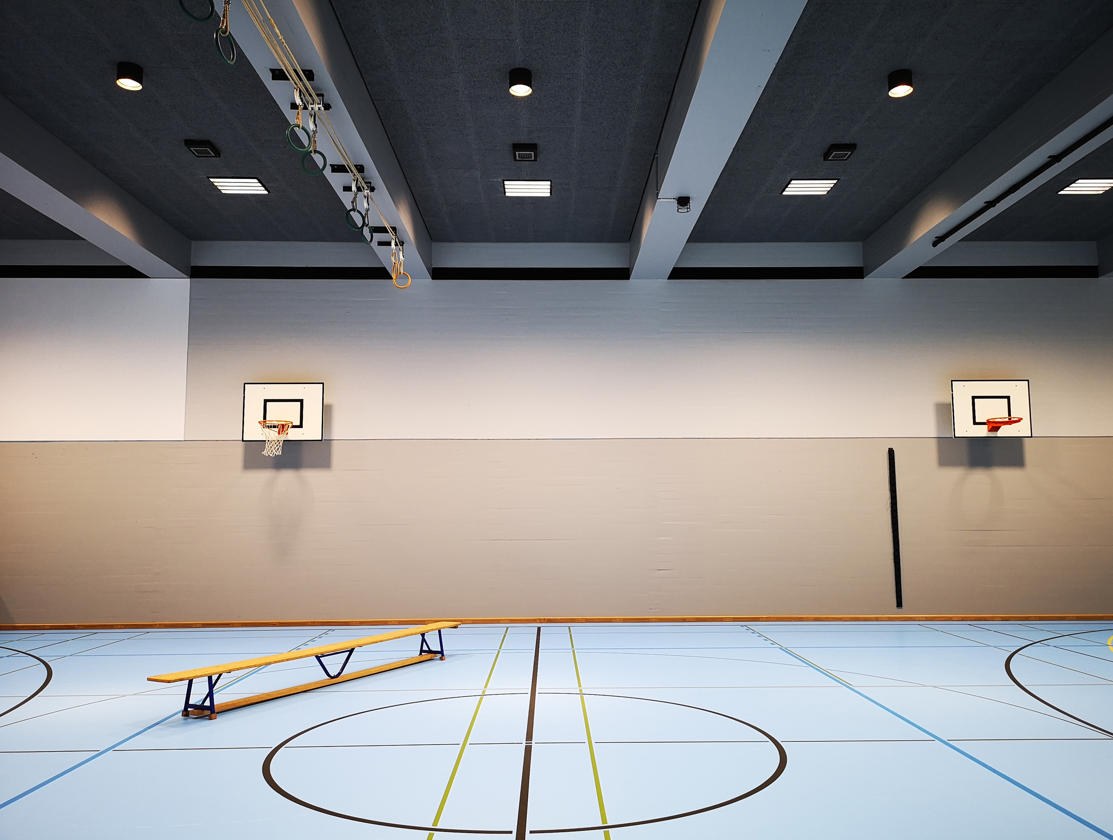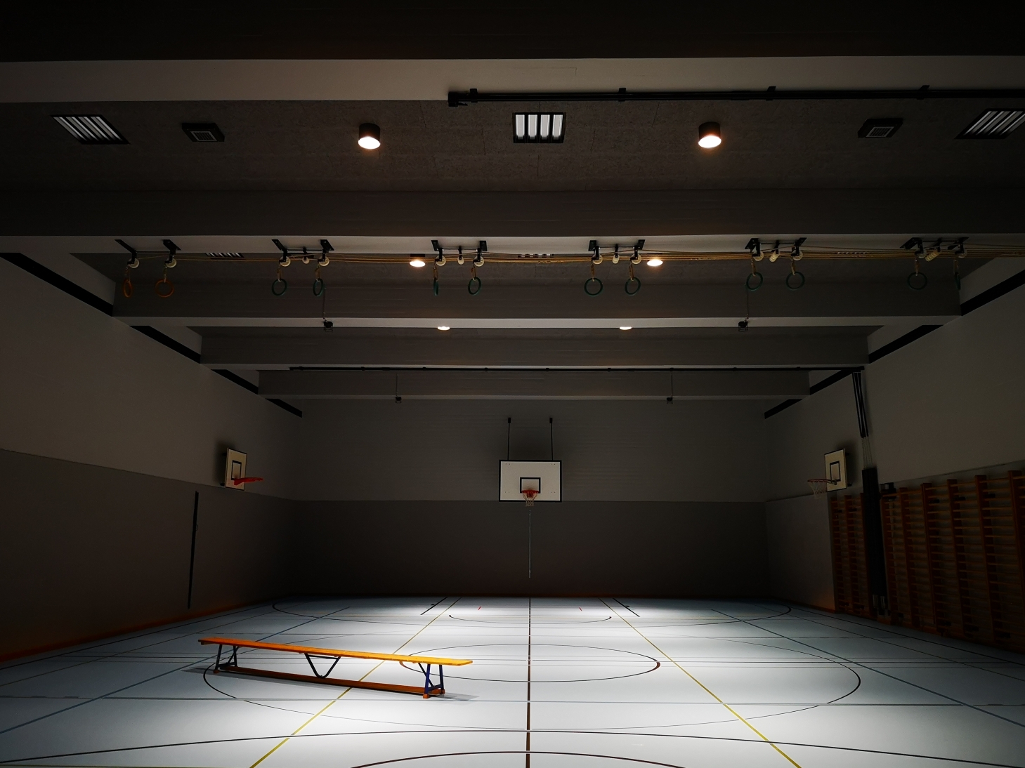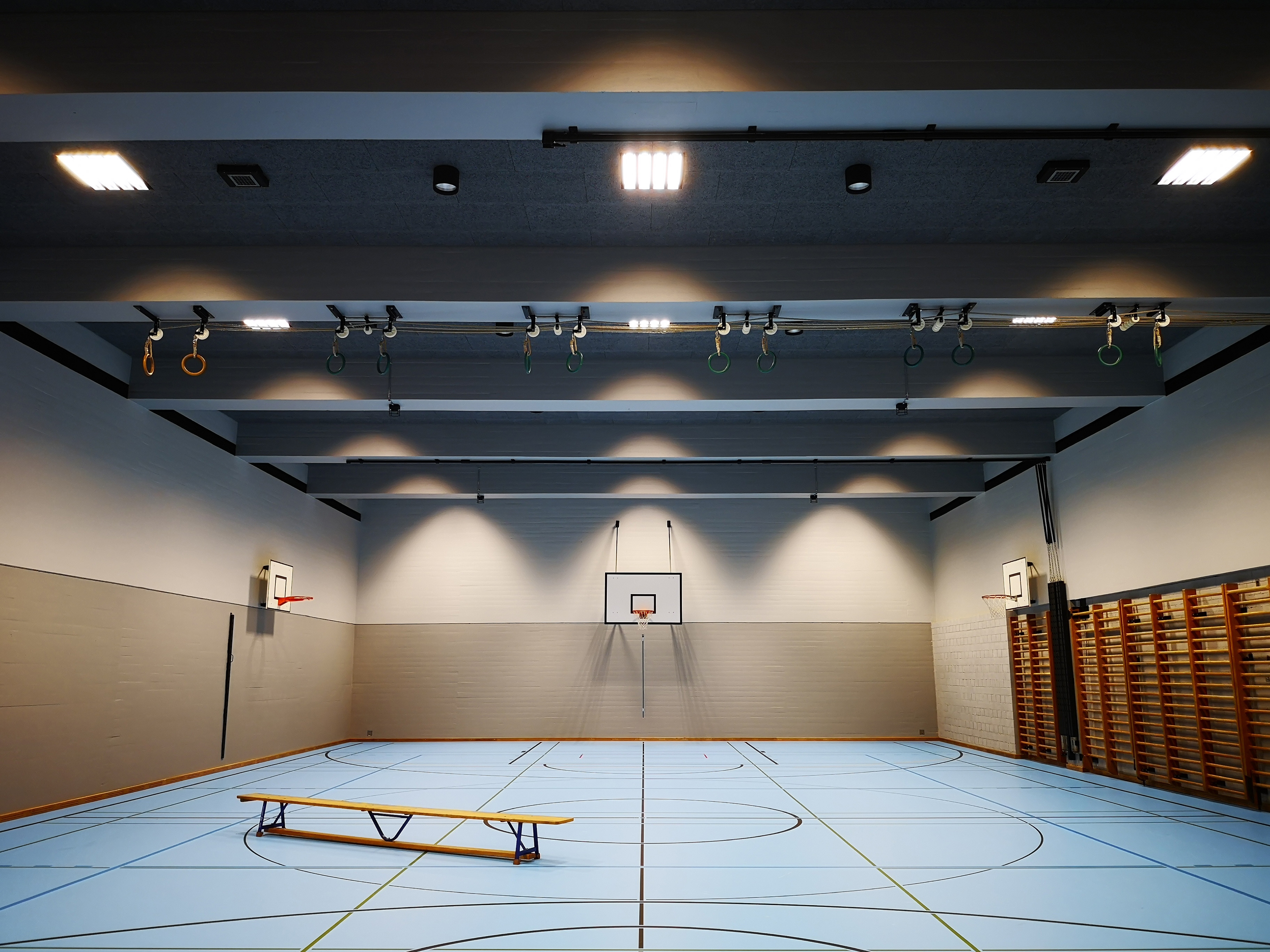 The KV Business School is the largest commercial vocational school in Switzerland and one of the greatest educational institutions in the German-speaking world. In 1974, the commercial school moved to a new school building at Escher-Wyss-Platz. The aging school building no longer met the user requirements and the state of the art was outdated. Therefore the 4 gymnasiums and the central access corridor including the fitness room were renovated in the first stage of modification. During renovation, the architects paid special attention to maintaining the original appearance and material concept of the space. For a better understanding and structure of the access area, emphasis was placed on vertical wall-washing with the general lighting in the access corridor. To optimize guidance and orientation, additional ceiling integrated round luminaires mark the crossing axes of the gym hall entrances. The main goals for the updated general light in the gymnasium was glare reduction and enhancement of the illumination levels. As the gymnasium is frequently used for association activities in the evening, a second layer of dimmable accent lighting was integrated into the updated infrastructure.