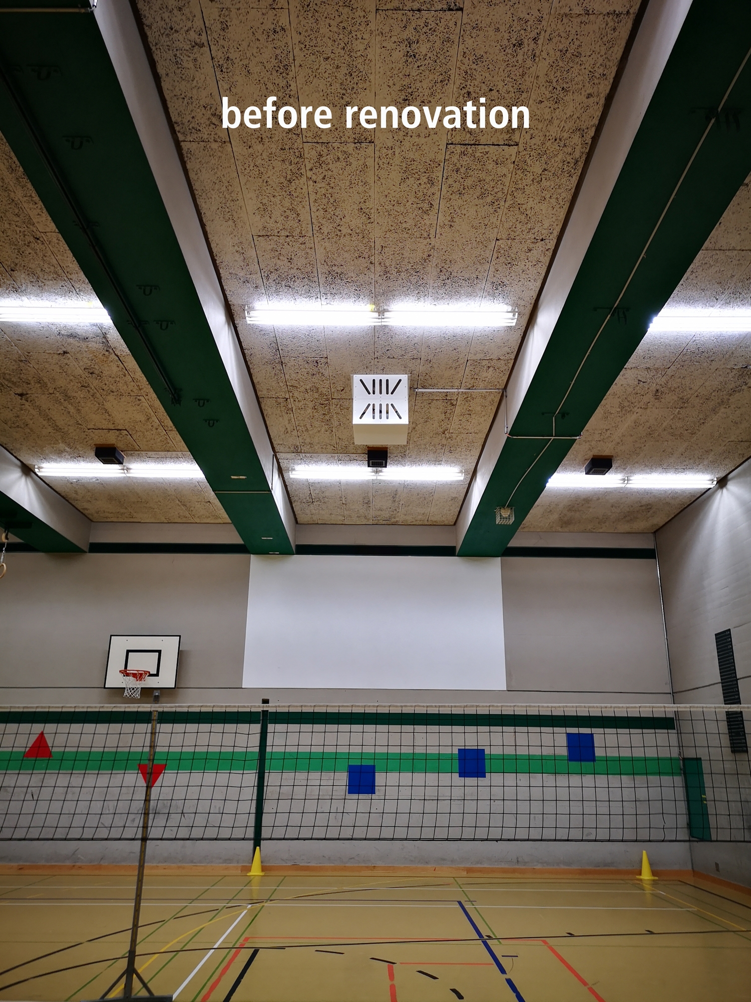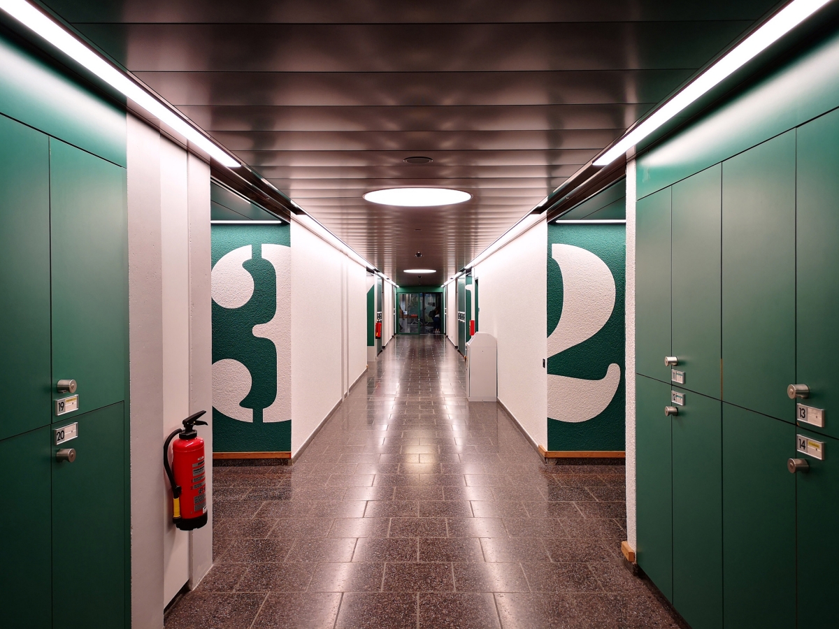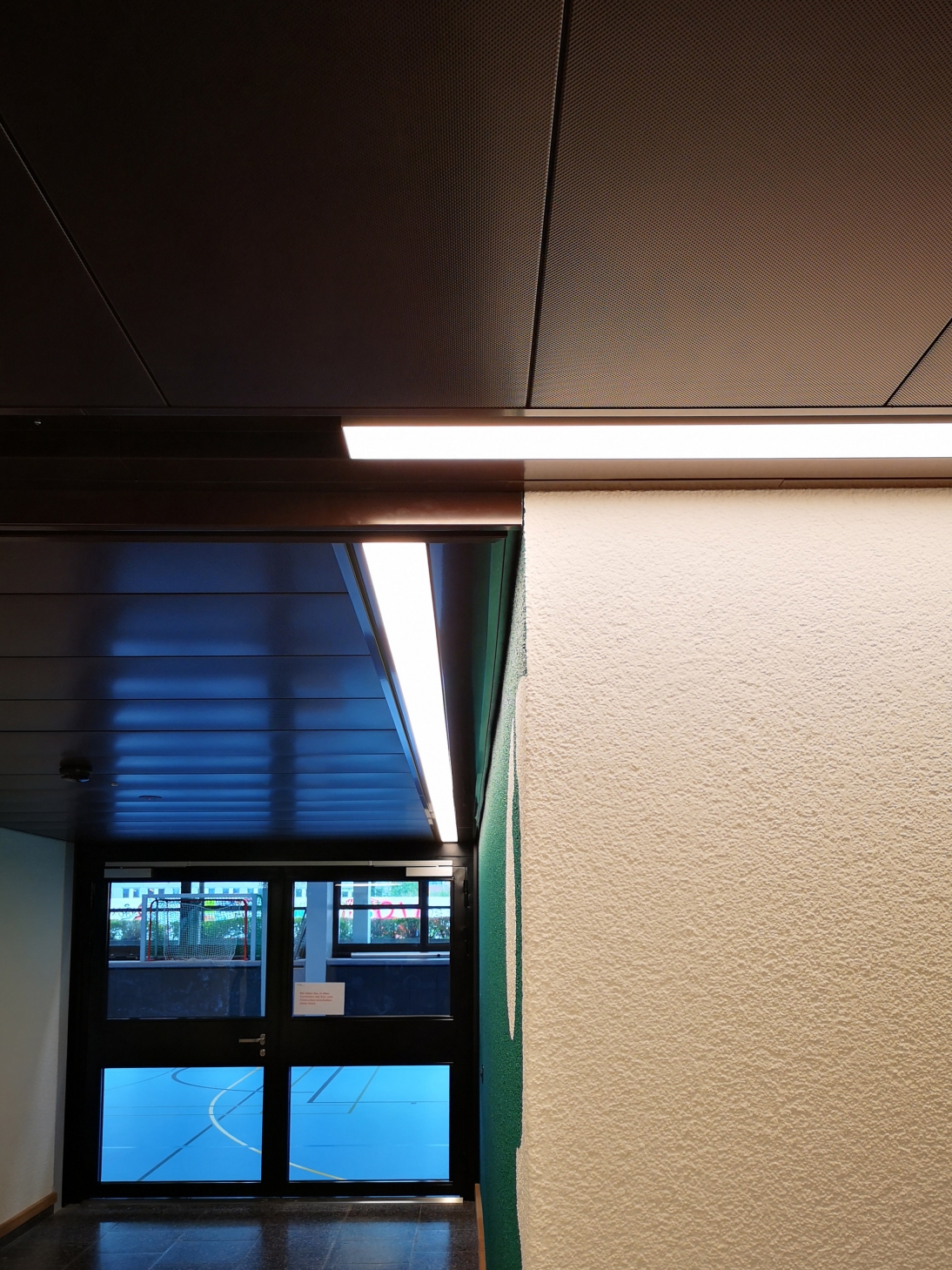 The KV Business School is the largest commercial vocational school in Switzerland and one of the greatest educational institutions in the German-speaking world. In 1974, the commercial school moved to a new school building at Escher-Wyss-Platz. The aging school building no longer met the user requirements and the state of the art was outdated. Therefore the 4 gymnasiums and the central access corridor including the fitness room were renovated in the first stage of modification. During renovation, the architects paid special attention to maintaining the original appearance and material concept of the space. For a better understanding and structure of the access area, emphasis was placed on vertical wall-washing with the general lighting in the access corridor. To optimize guidance and orientation, additional ceiling integrated round luminaires mark the crossing axes of the gym hall entrances. The main goals for the updated general light in the gymnasium was glare reduction and enhancement of the illumination levels. As the gymnasium is frequently used for association activities in the evening, a second layer of dimmable accent lighting was integrated into the updated infrastructure.