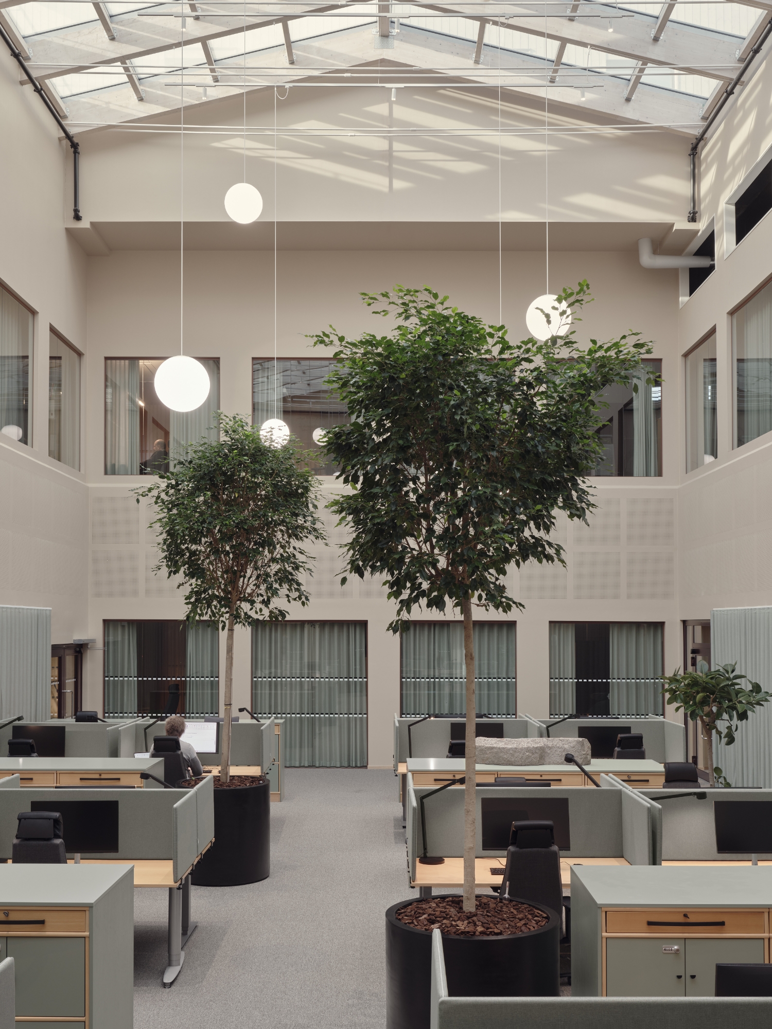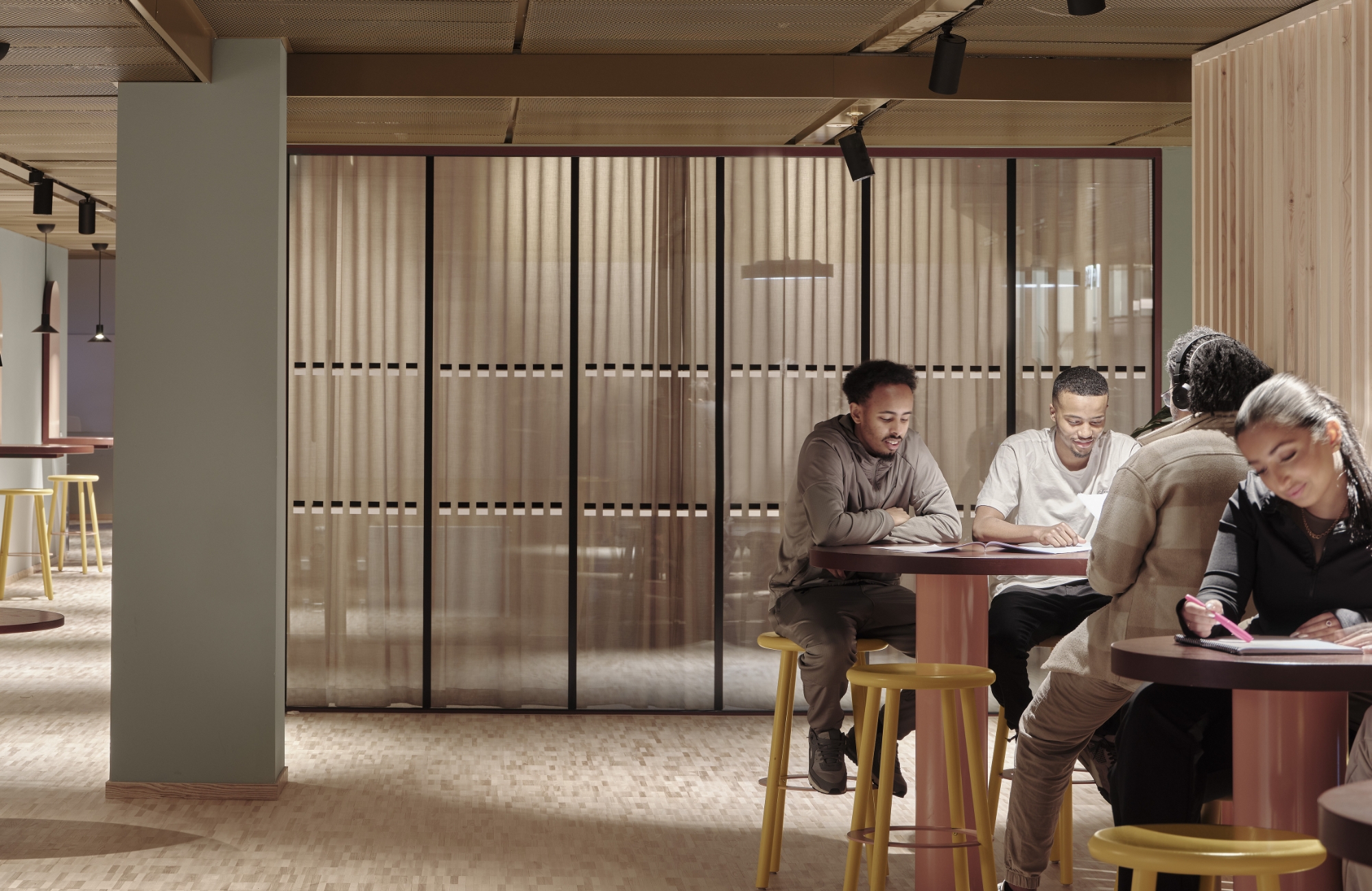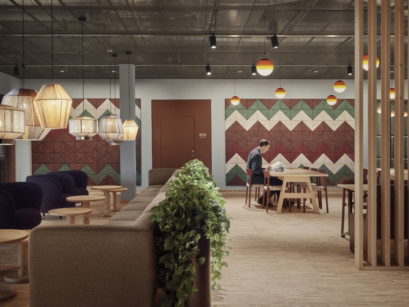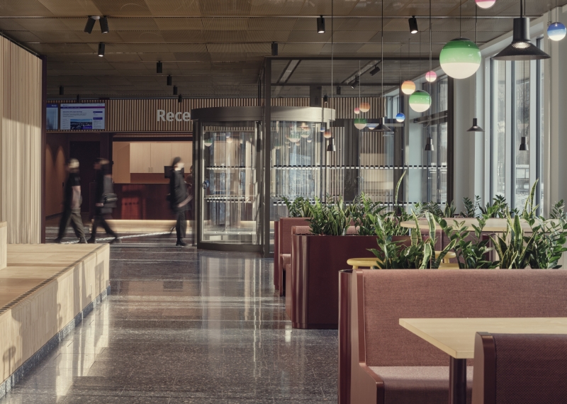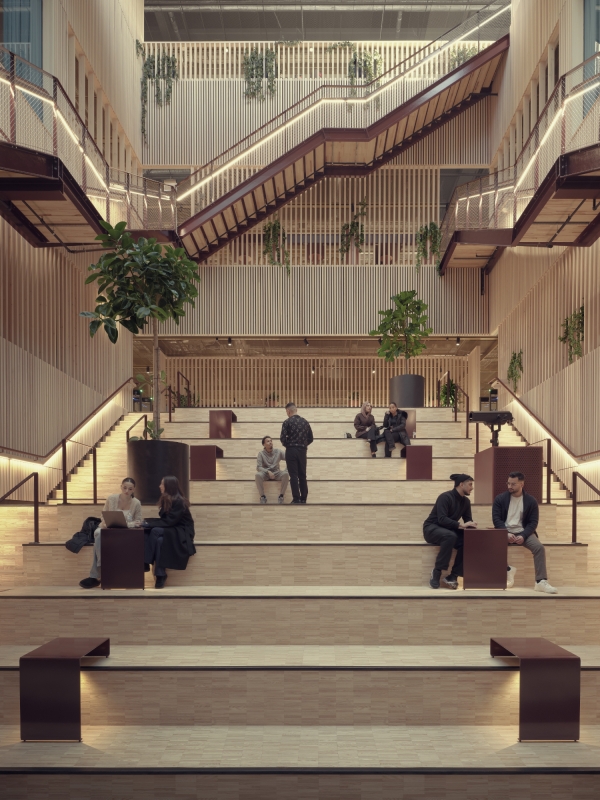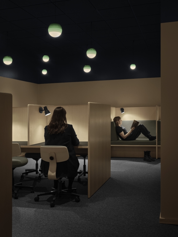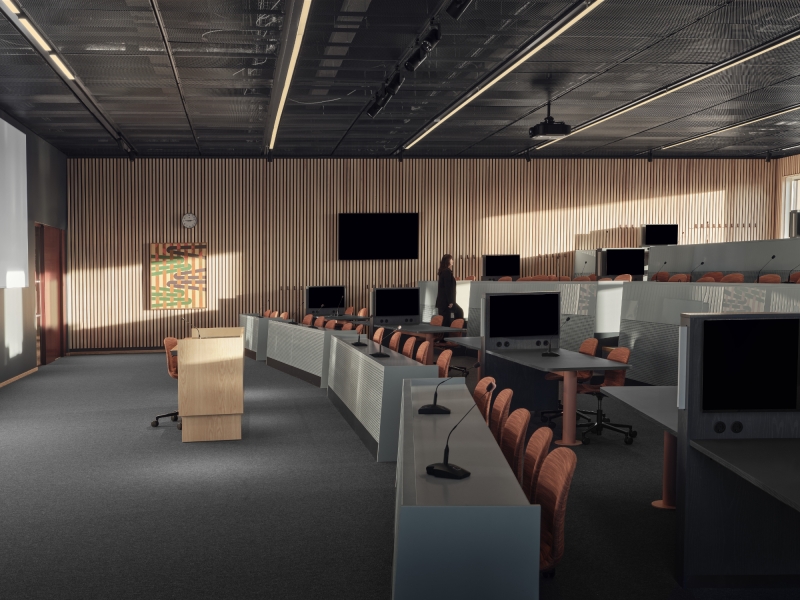 Each space is purposefully lit. Lecture halls feature suspended fixtures with direct and indirect light. Tunable white technology and layered lighting adapt to different activities. In the library’s silent reading room, floating luminaires and reading lamps create a serene ambiance. Offices and lounges use dynamic lighting scenes that respond to time and use.