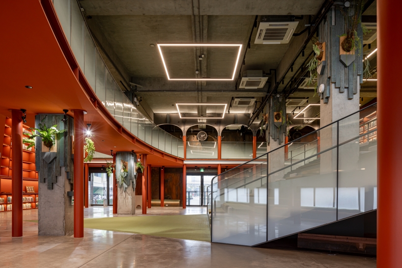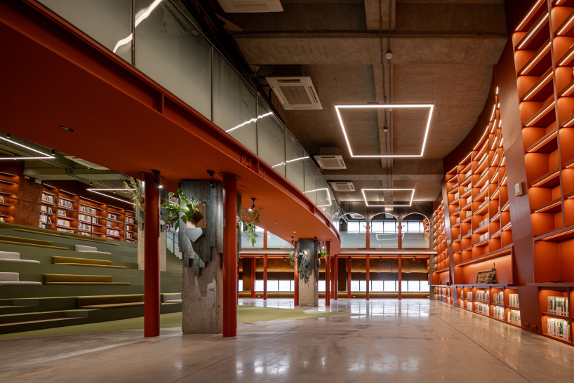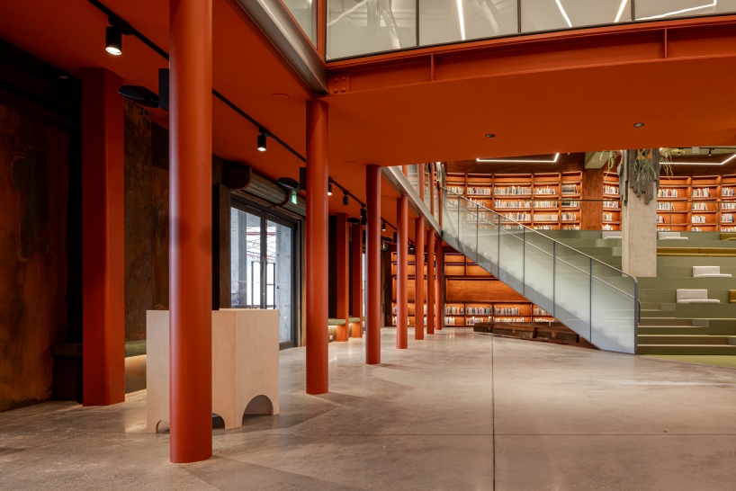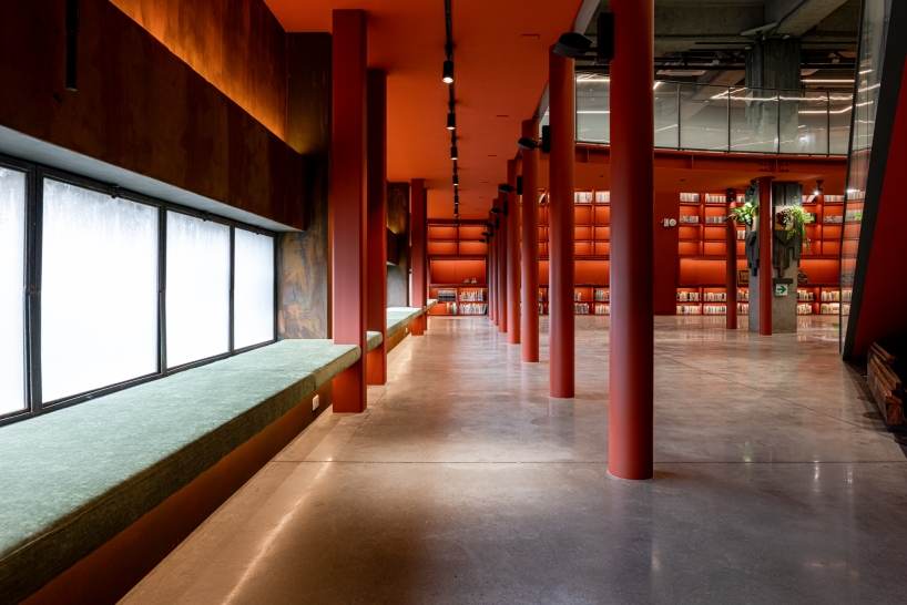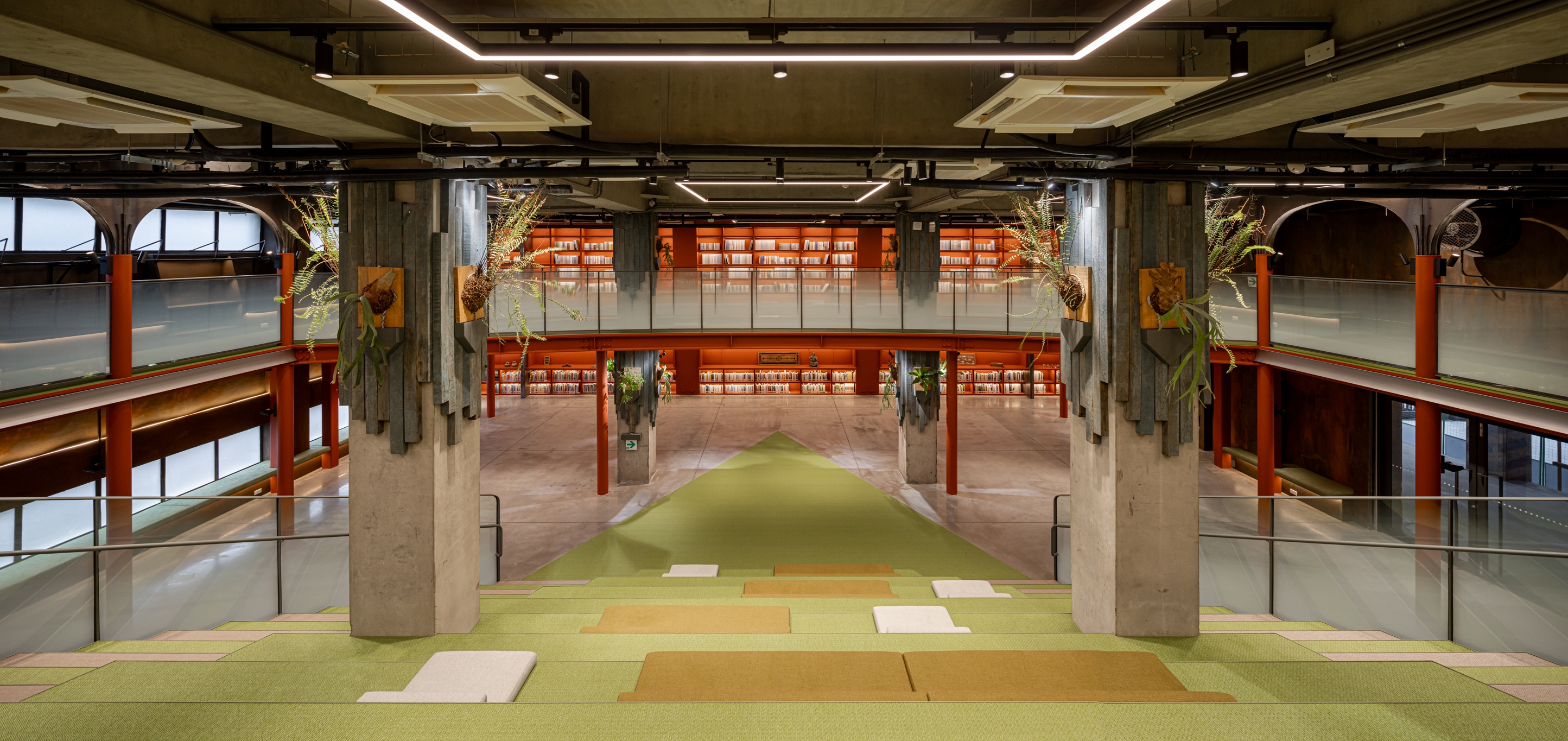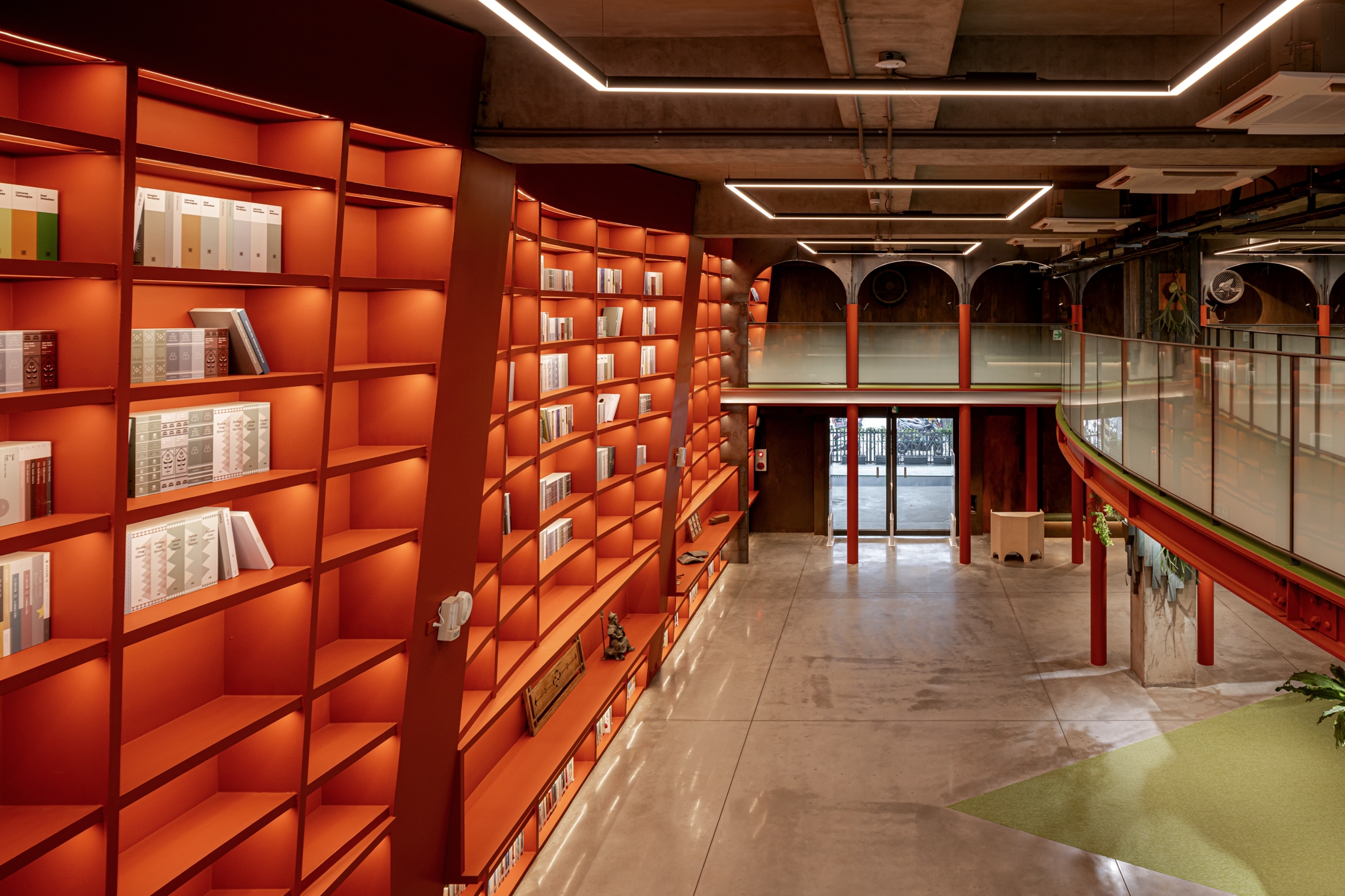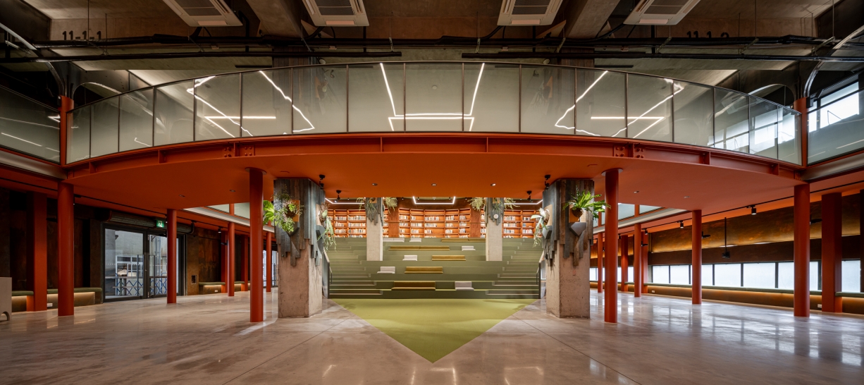 A monumental curved bookshelf becomes the spatial heart, softly lit with warm 3000K indirect light that blends into the copper and wood finishes. This wall glows like a lantern, offering both ambient illumination and symbolic warmth. Above, exposed steel trusses and column capitals are lit with elliptical beams that accentuate structural rhythm and material aging, preserving the building’s raw industrial character.