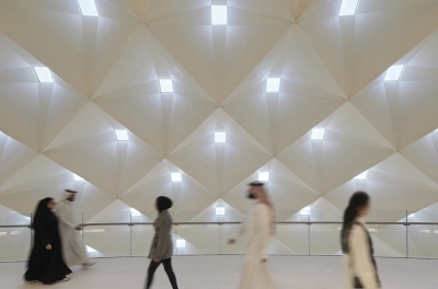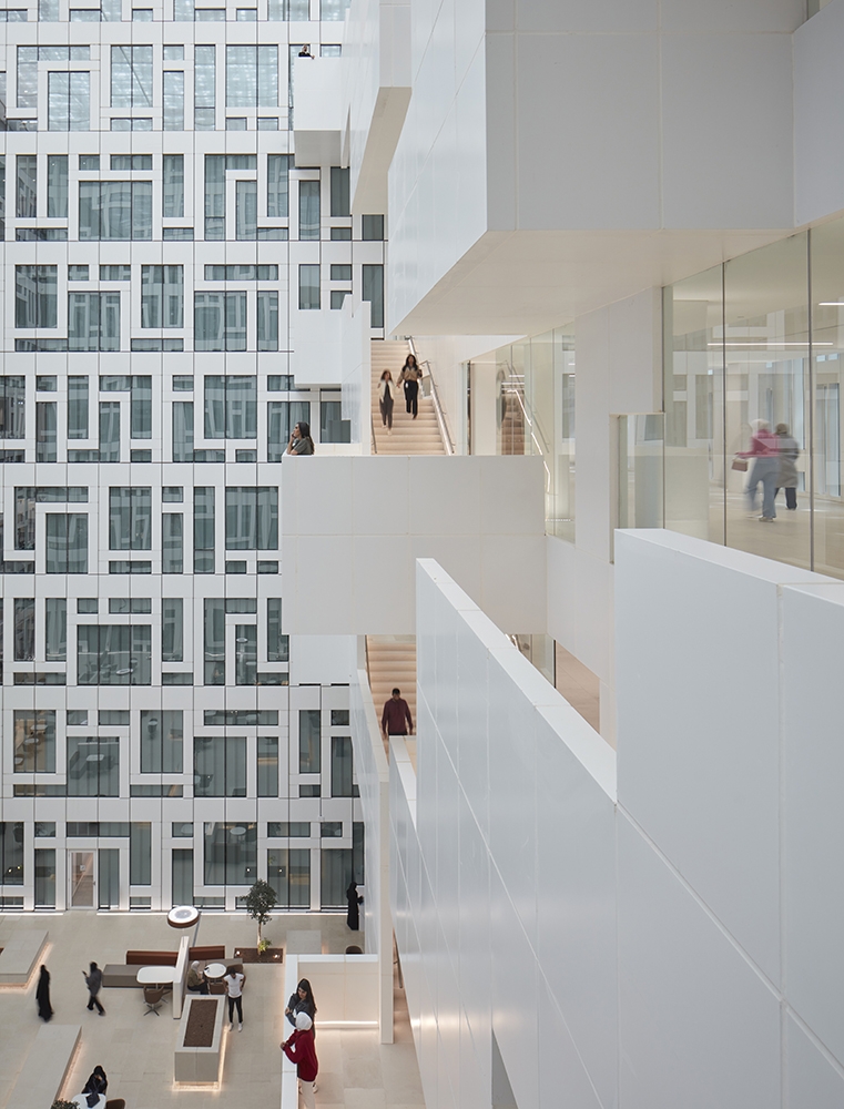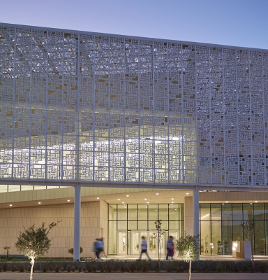 The impressive mashrabiya screen façades, designed by SOM in collaboration with Artist Farah Behbehani, celebrate the Kuwaiti culture and wrap all façades, providing an architectural narrative and continuity throughout the site. We considered the importance of how this was presented both during the day and at night. During the day, natural daylight render the screens bright and crisp, whilst at night they are transformed into silhouettes exposing the mashrabiya pattern with the internal artificial light.