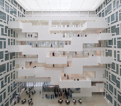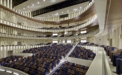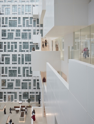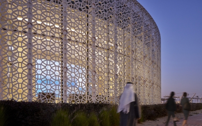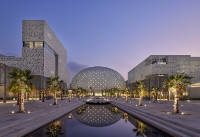 The stunning central Convocation Hall building, known as “The Pearl”, is flanked by the Library and Administration buildings which are joined to the Cultural Centre, Conference and Exhibition building facilities, and Visitor Centre. All are sat within a grand and ordered landscape stretching to the wider campus.