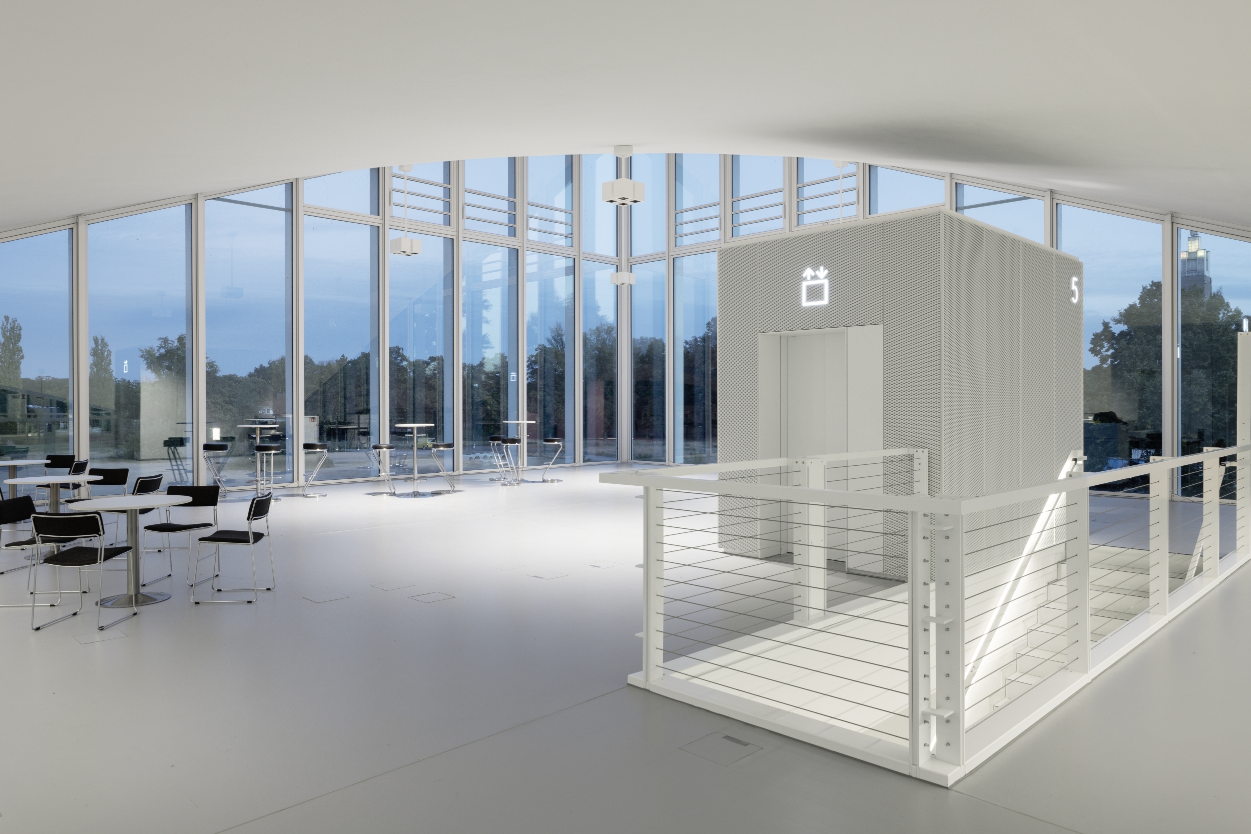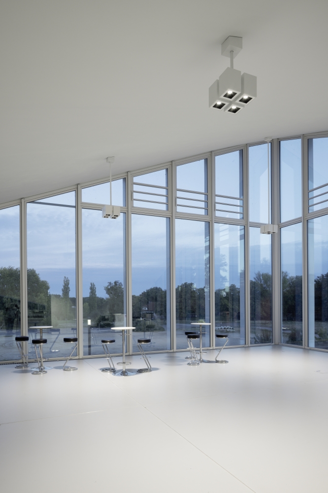 The exterior lighting is minimal. Though it is the centerpiece of the building, the roof was deliberately not illuminated directly. The Hyparschale glows from within, emphasizing the curved roof structure with light reflected from the walls and floor onto the ceiling.