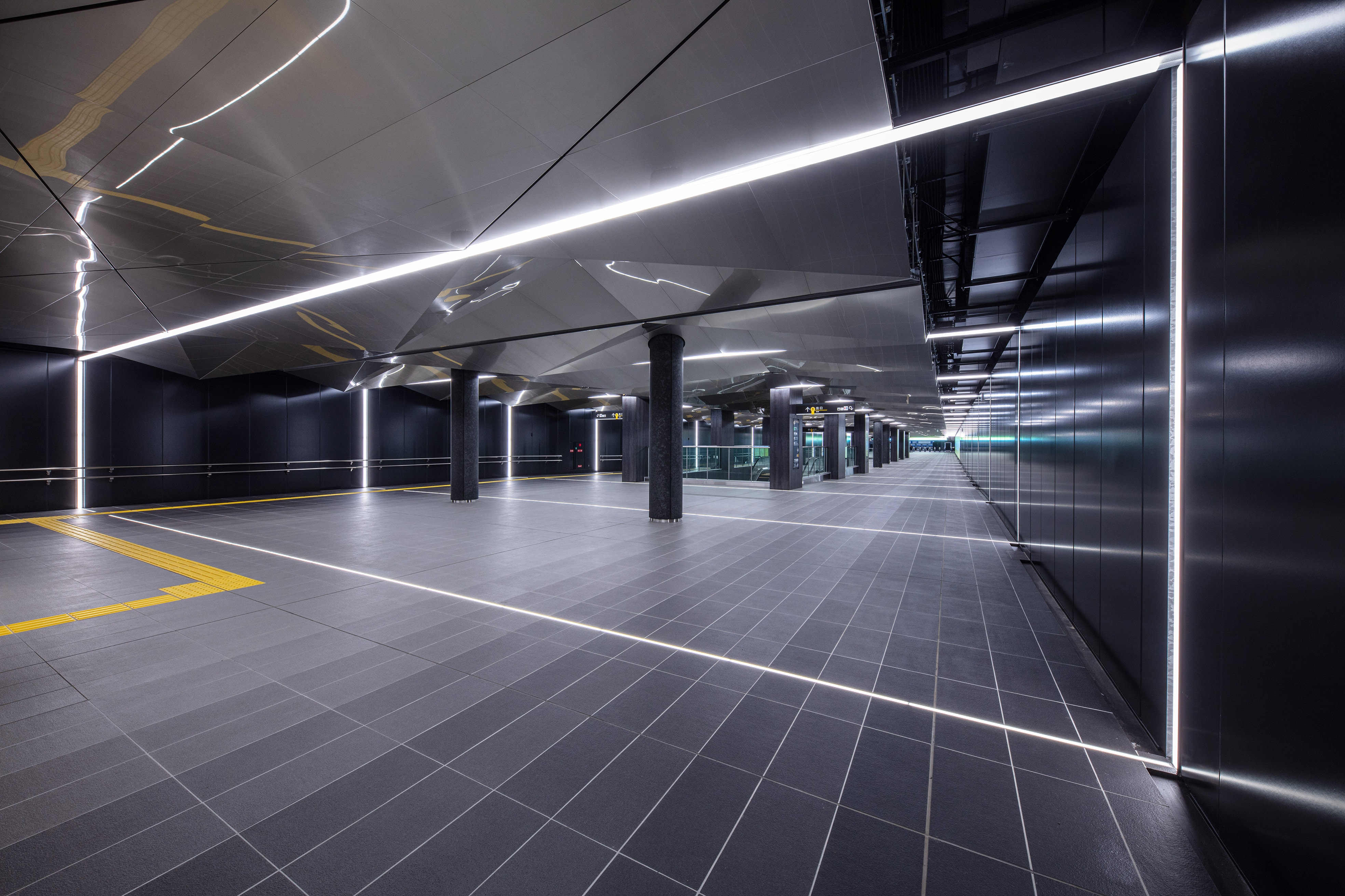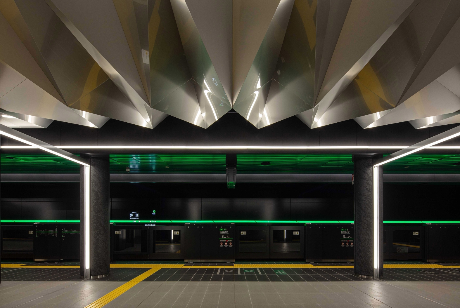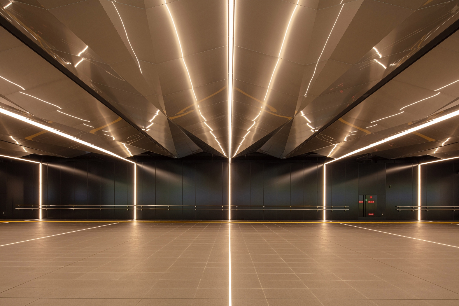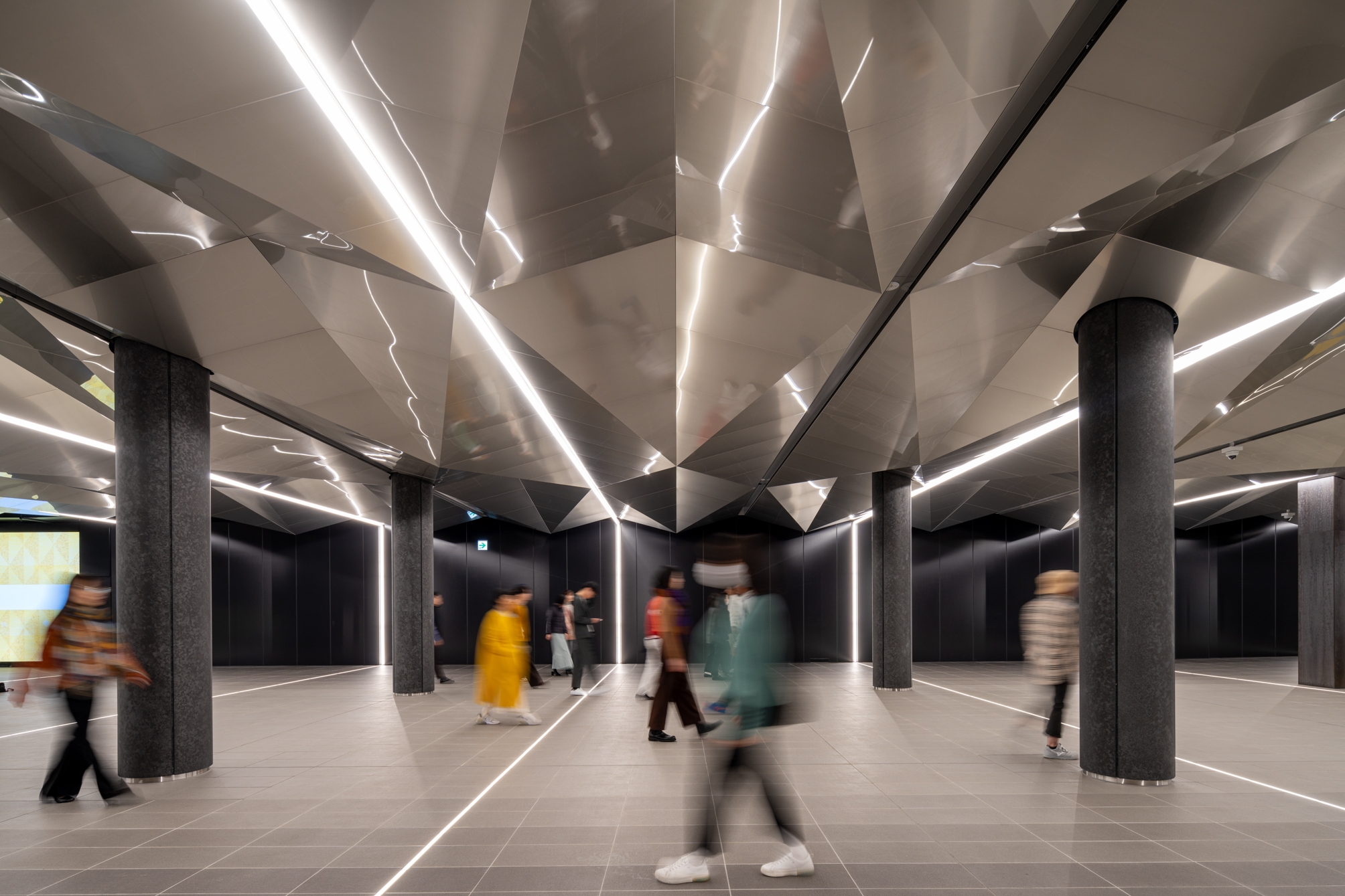 This concept is realized through five spatial methods: 1. an origami ceiling based on train operation diagrams, symbolizing precision and tradition; 2. reflections and motion, where light and people create shifting, momentary art; 3. lighting that enhances space and emotion; 4. authentic, sustainable materials like aluminum for durability and beauty; and 5. operational staging that harmonizes time, flow, and movement. These elements blend Japan’s culture and technology into a unique theater-like station experience.