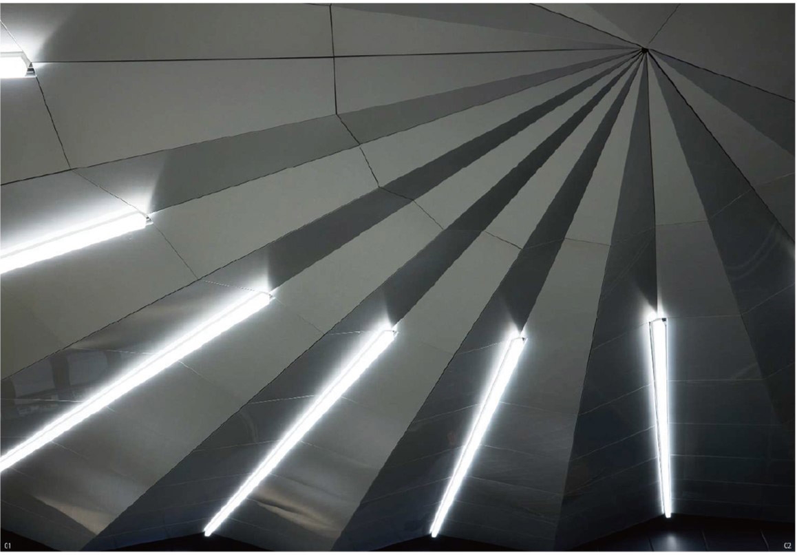 High-efficiency, high color-rendering LED fixtures are seamlessly integrated into the ceiling units. Their detailed installation allows for easy replacement. Reflective, recyclable aluminum ceiling panels amplify the light, making the space feel brighter than the actual number of fixtures would suggest.