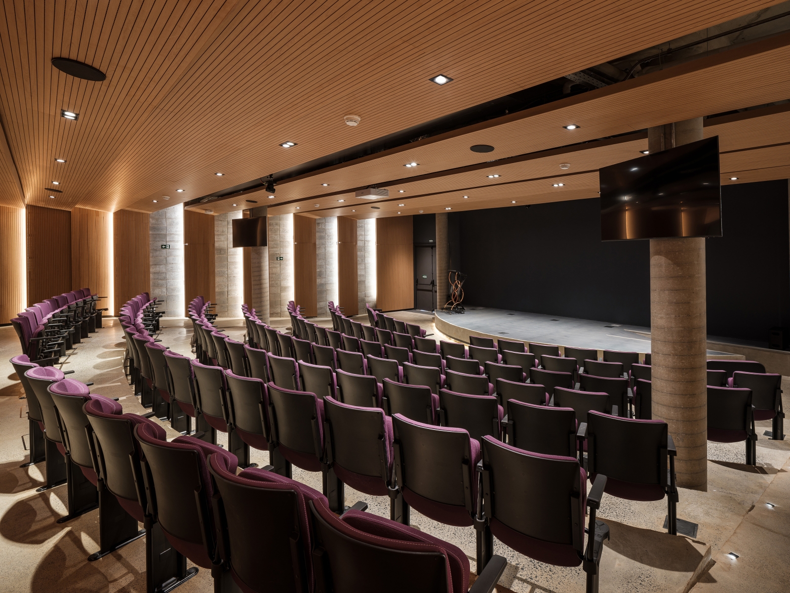 Light respects the building’s authenticity, rooted in the purity of its materials. Luminaires remain discreet, concealed within architectural elements, yet precise in delivering functionality and comfort. In the patio and student garden, they nestle within the wooden grid; in classrooms, they align between buffers; in the auditorium, they dissolve among acoustic panels. Thus, the lighting design unveils the building in its wholeness — interpreting the architecture as its second skin of light.