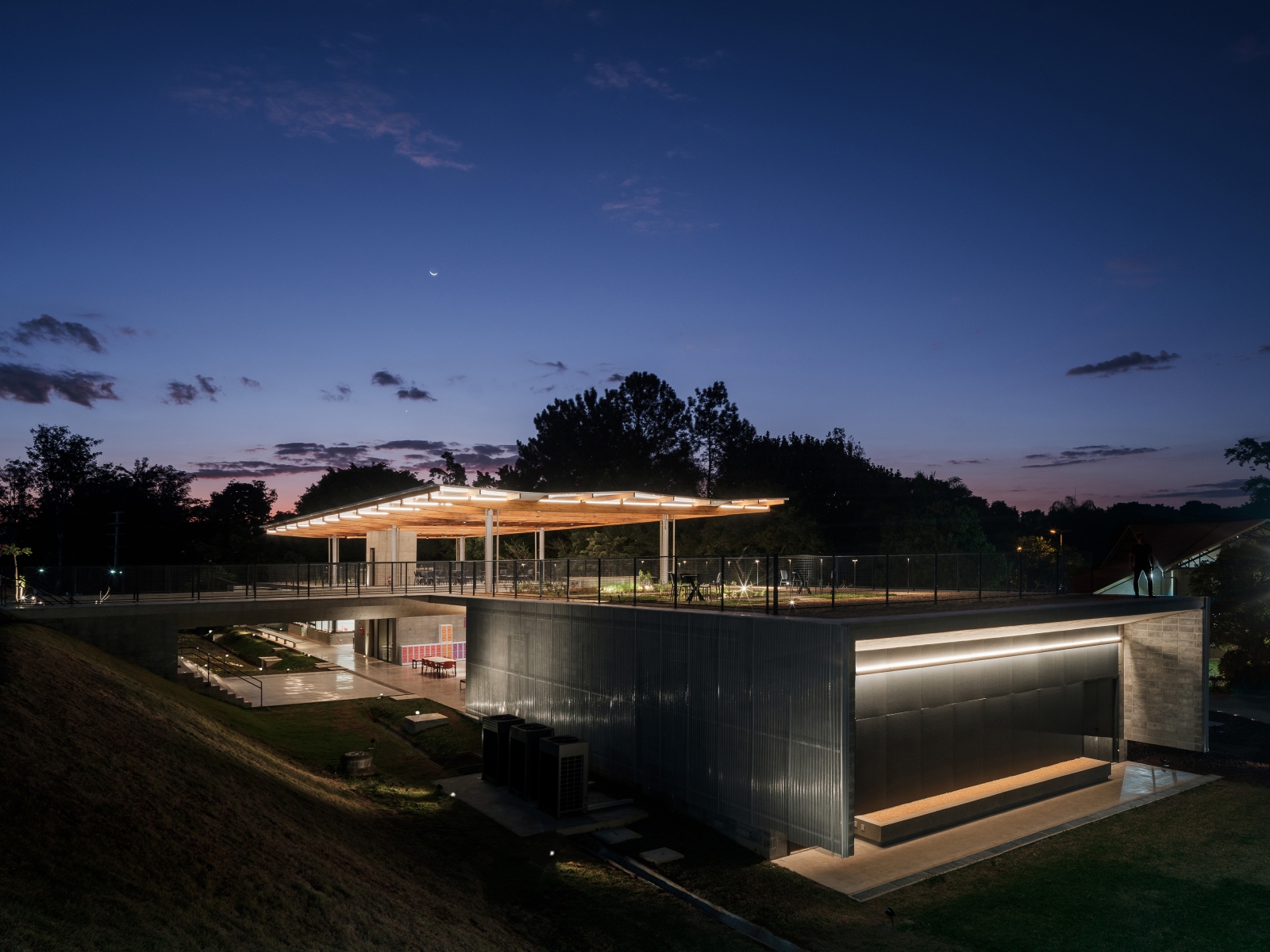 If architecture settled gently on the ground, the lighting design amplifies that levity. Illumination becomes a narrative, almost ethereal: indirect light, lyrical by nature, finds in the reflective roof surfaces an ally. At ground level, it accentuates the slenderness of the concrete slab, dissolving its weight into grace.