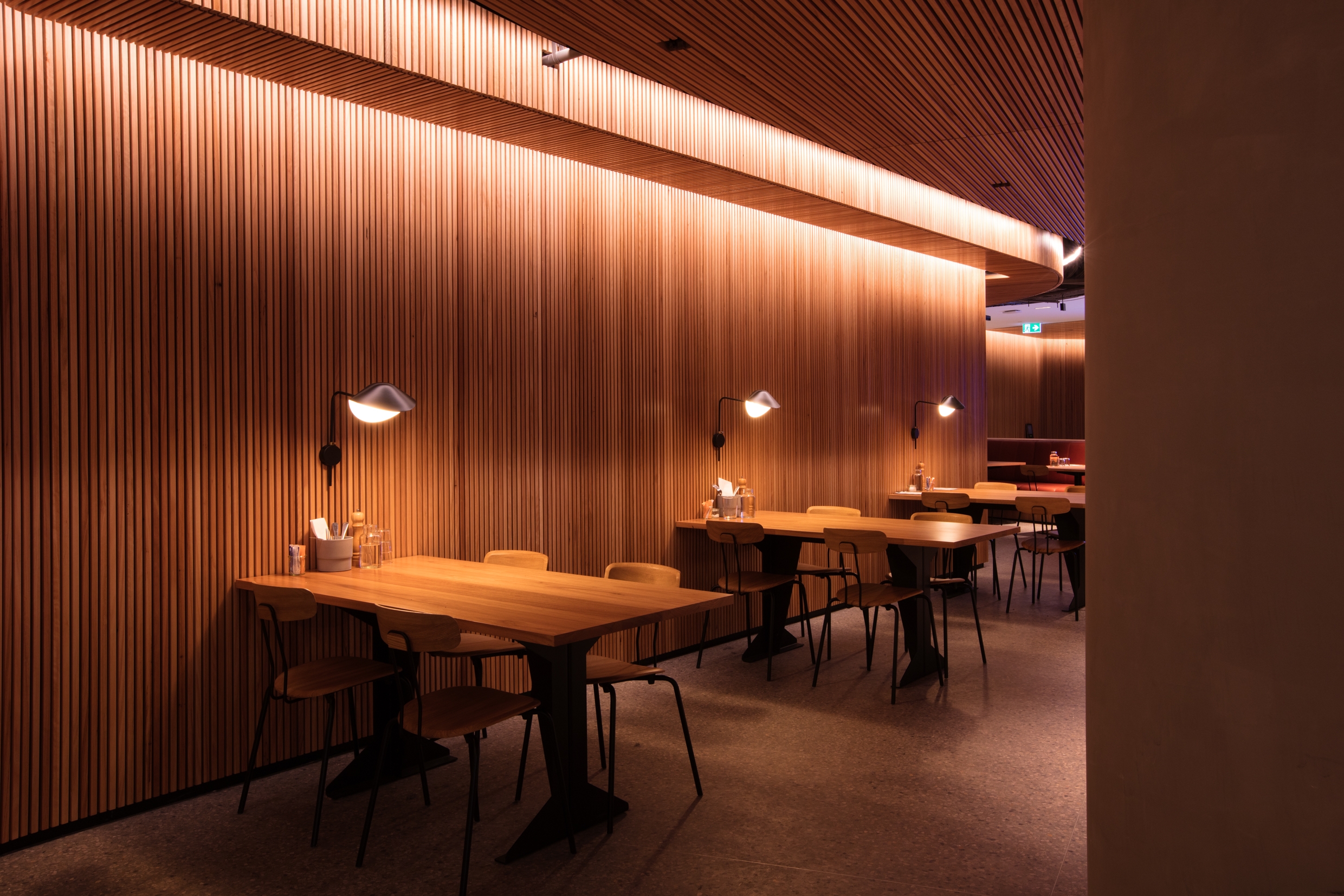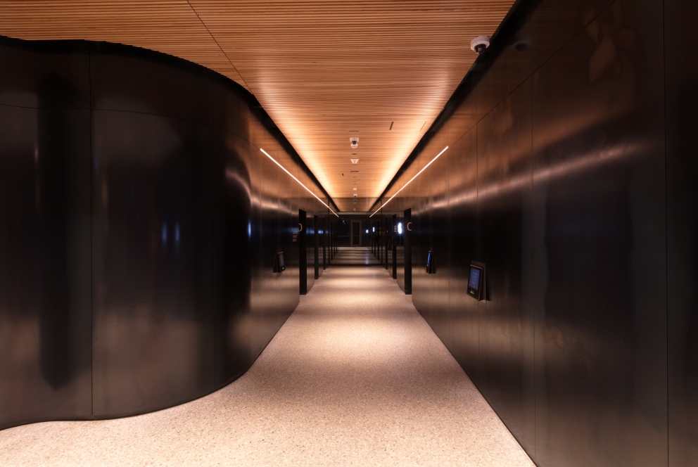 the exposed ceiling presented a challenge when trying to integrate lighting to graze walls or to conceal accent lighting. rather than the typical cove integration details, suspended profiles were used to conceal the light sources whilst delivering the cove lighting effect.