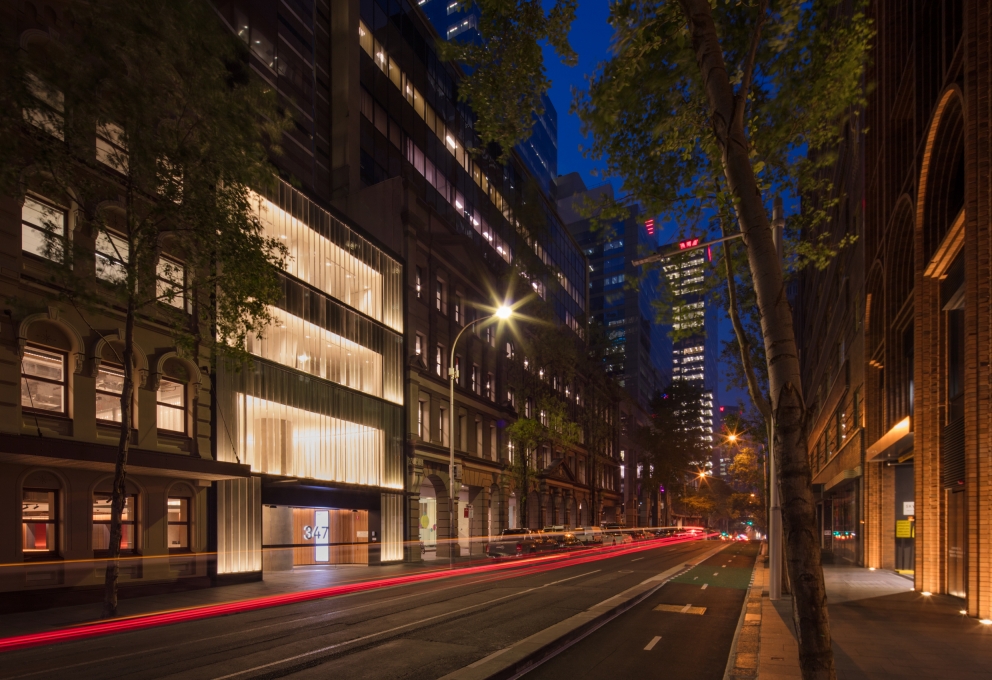 the facade is made up of glass planks, each plank with an individual up light, this effect transitions from outside to in creating a lofted entry lobby space surrounded by light.