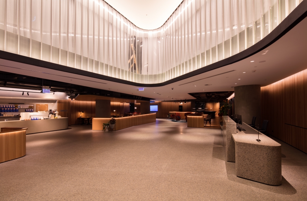 this entry lobby for a commercial workplace includes an F&B offering, reception and co-working space.