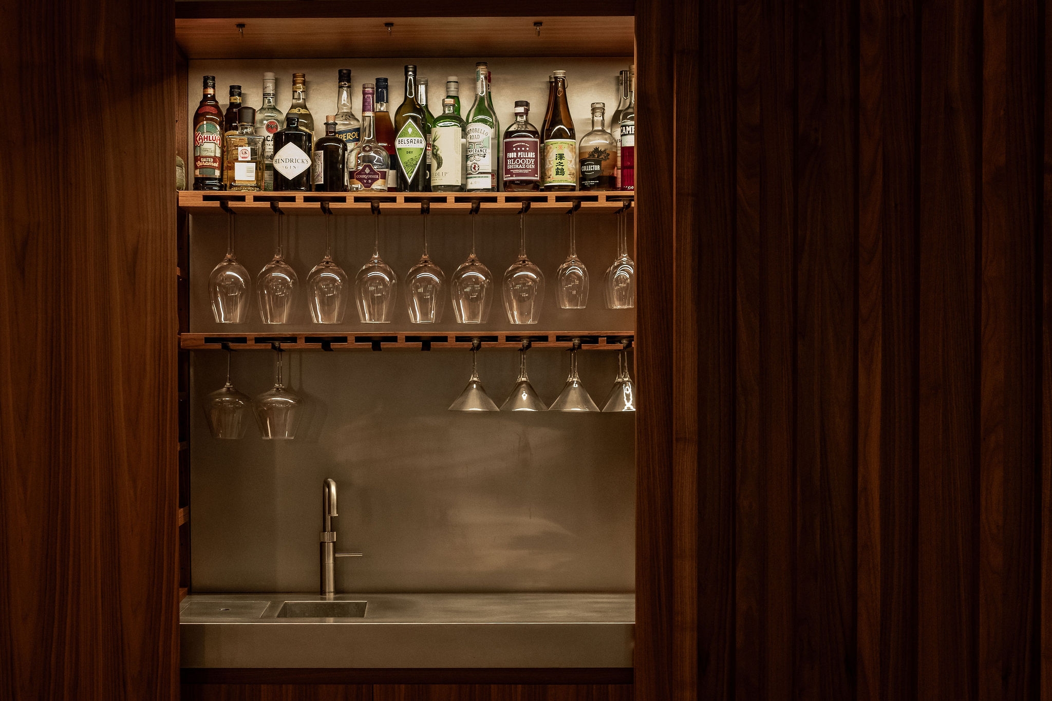 Elegant individually mounted pendants provide visual interest over the main dining area, with concealed lighting to the bespoke bar enhanced the atmosphere of the space.
