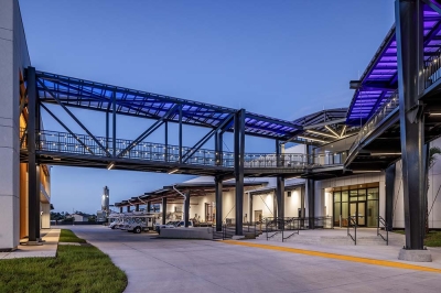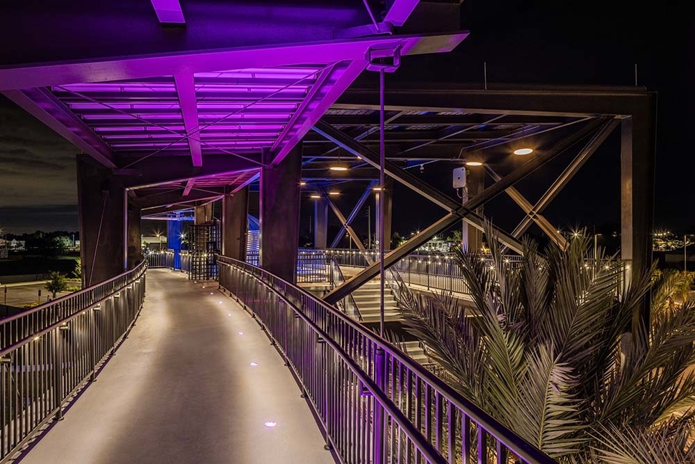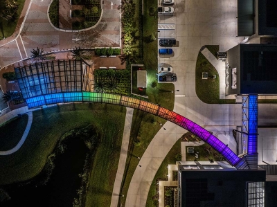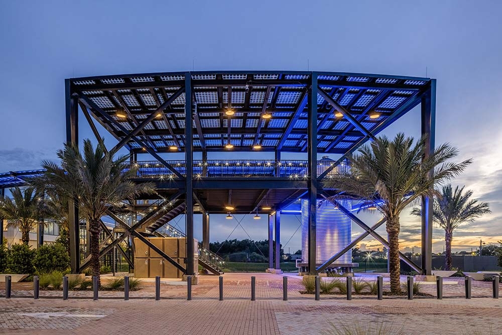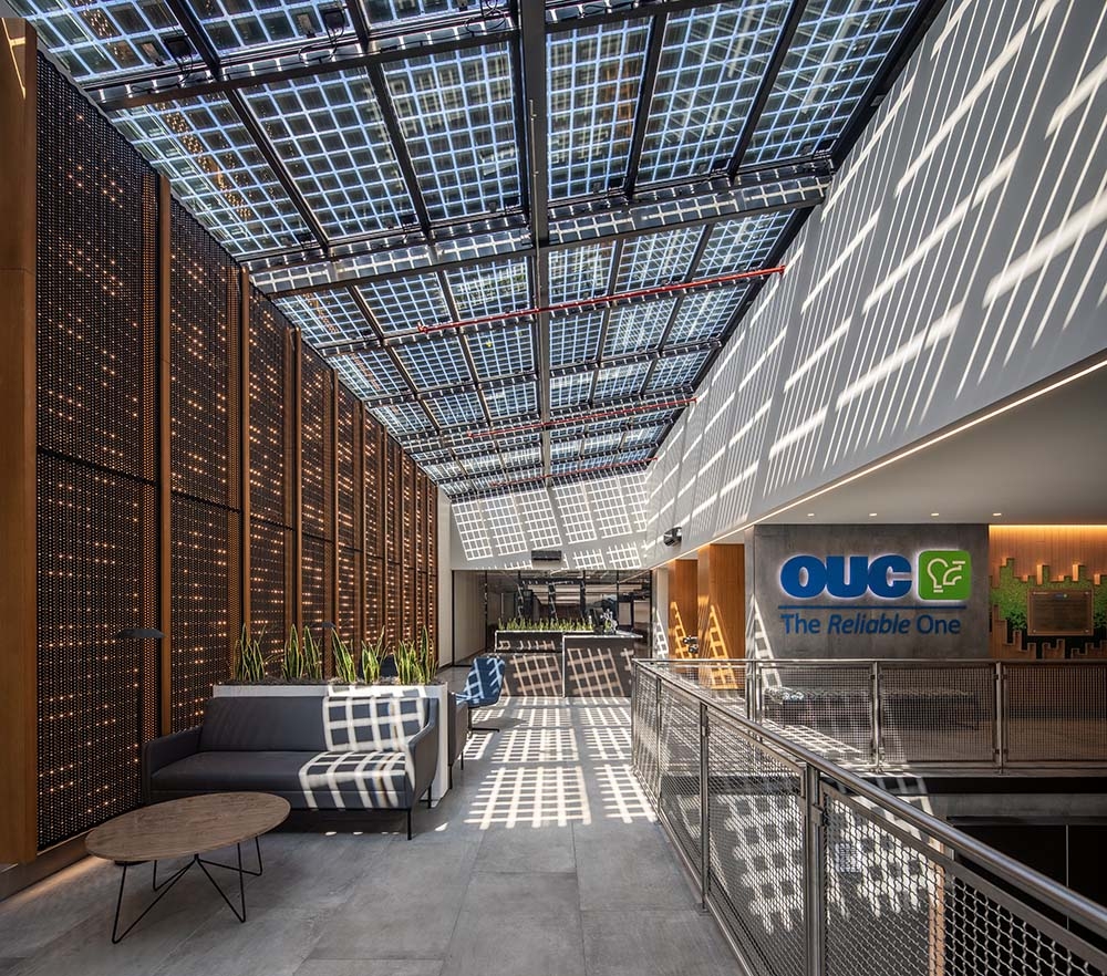 Entry DescriptionLocated in St. Cloud, Florida, the Orlando Utility Company’s new Operations and Maintenance Center sets a benchmark for sustainable industrial design, achieving Net Zero, LEED Gold, and Fitwel certifications. The project integrates energy efficiency, innovative lighting, and respect for local environmental priorities. Challenges included creating a hospitality-inspired interior in an industrial setting, preventing light trespass, and reinforcing the company’s energy identity. The exterior draws from the region’s citrus heritage, while lighting celebrates electricity as a dynamic force. Visitors encounter a sensory experience through glowing pavilions, color-shifting walkways, and subtle in-grade fixtures. Inside, lighting enhances comfort and function with power line-inspired chandeliers, acoustic panels, and daylight-responsive controls. Exterior lighting blends into the landscape, using adaptive dimming and wireless mesh controls to reduce sky glow and prevent light spill. The result is a high-performance, energy-conscious hub that reflects OUC’s sustainable vision.