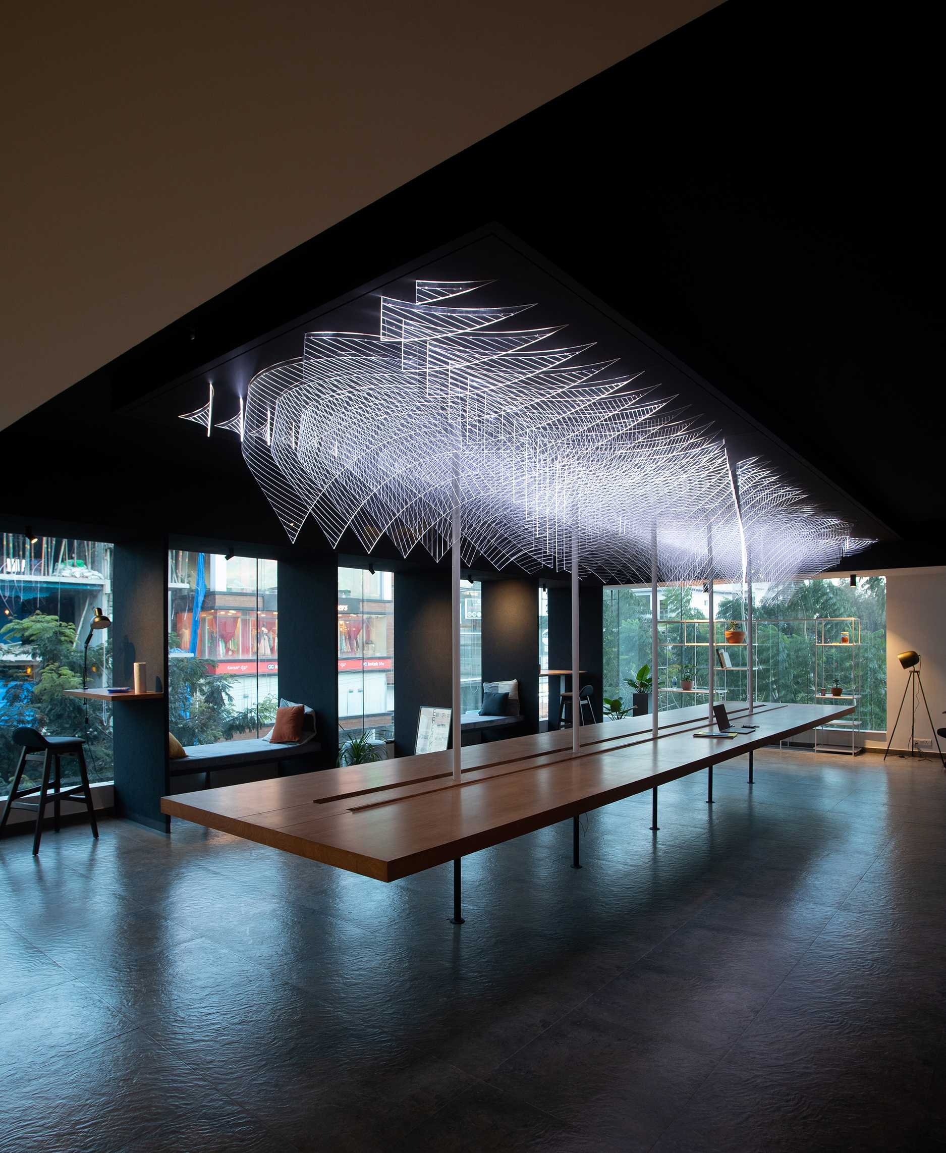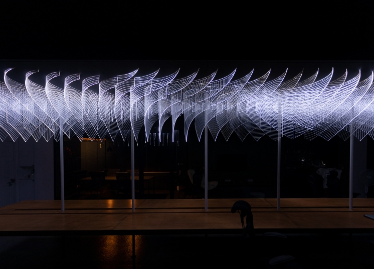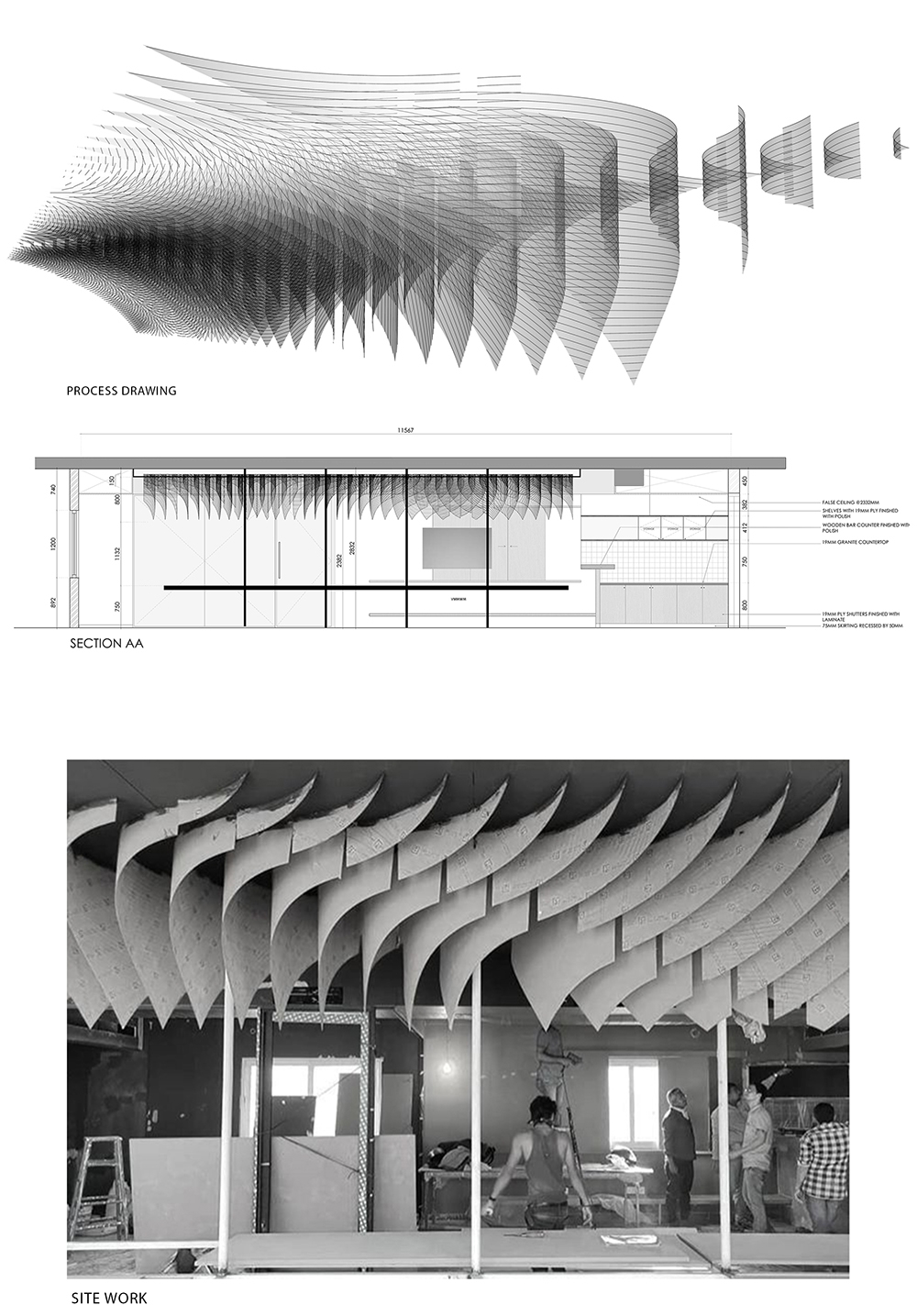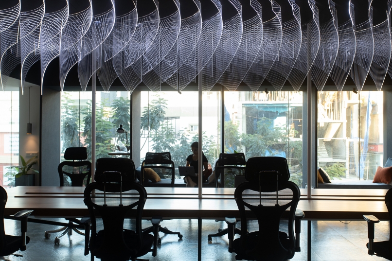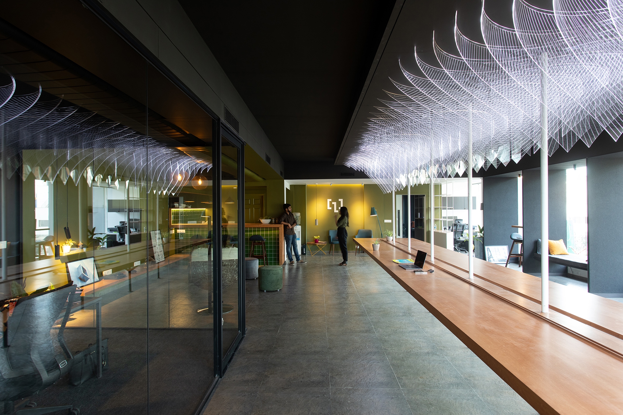 Project LINES & MOTION is a take on designing an office workspace with an approach of total contrast to the conventional workspaces. Envisioning an interactive workspace, the client approached us for designing a 1260sqft office space with a stringent budget. The simplified clean floor plan intrigued us with the idea of a single sleek long table for the whole workspace. The massive scale of the table was to be reflected on the ceiling as a single volume, in a form of a light installation. Creating a volume which wouldn’t overpower yet have a stark dominant character initiated the explorations on acrylic. The shortcomings of the material defined its vertical placement as panels. With the concept of layering, etching was done on the panels which created a complex web work and mesh of lines. The curvilinear grooves hold the panel with the light source running on top. The motion in lines brings out the dynamic character of the ceiling wherein one can experience a new form from different angles. Instead of being an object of beautification, the installation lives in the space reacting to the user through the medium of his vision.