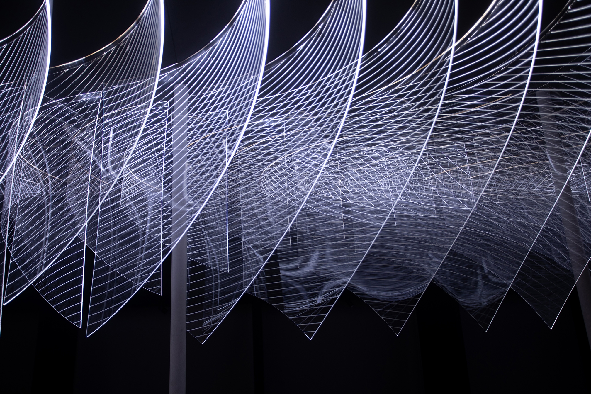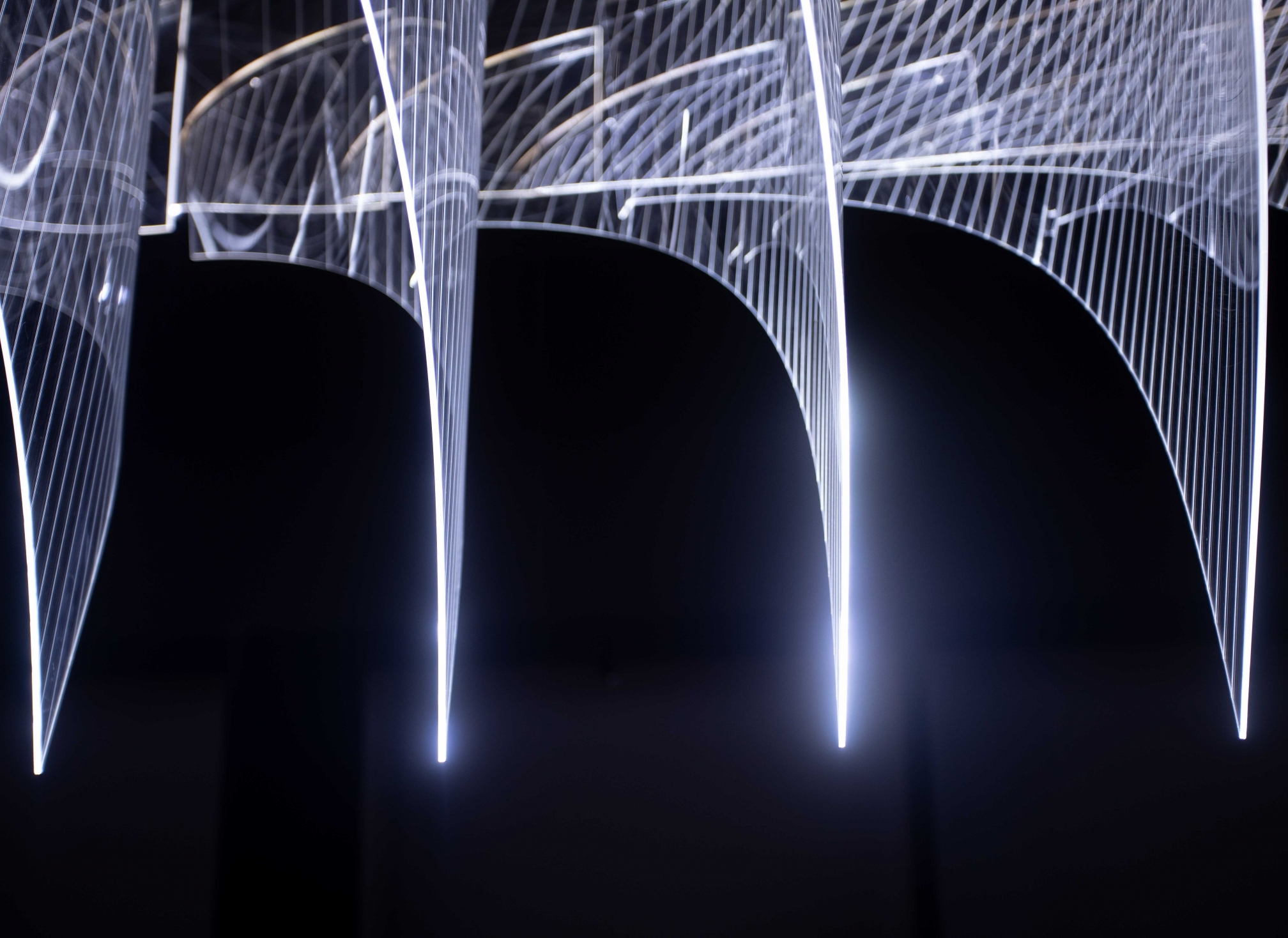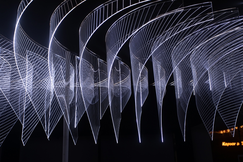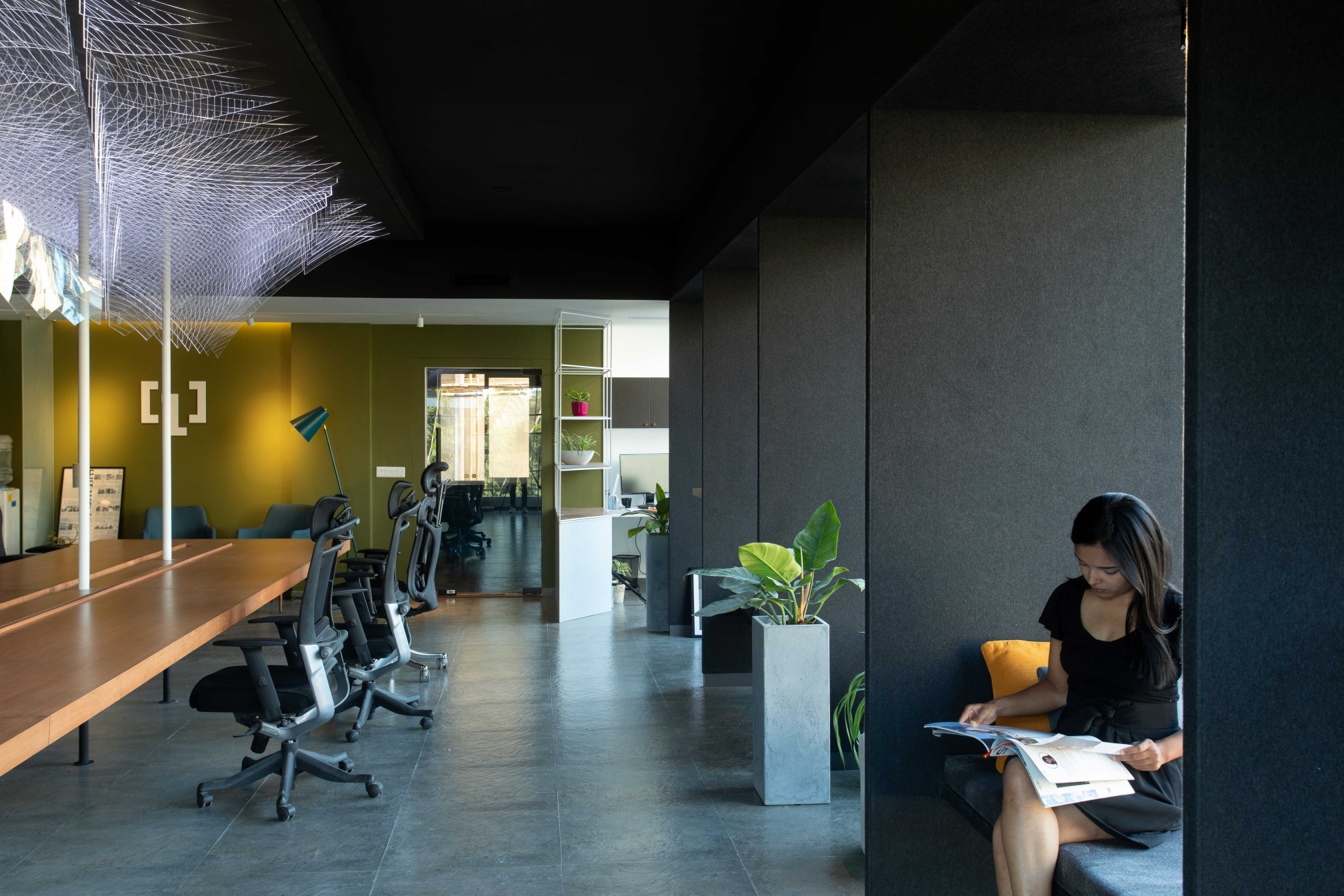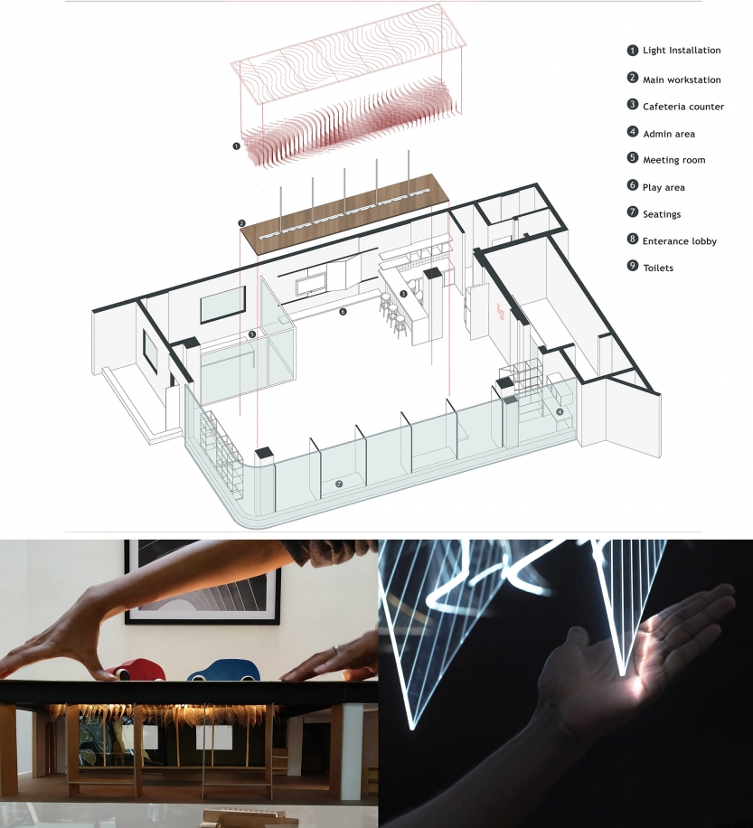 Project LINES & MOTION is a take on designing an office workspace with an approach of total contrast to the conventional workspaces. Envisioning an interactive workspace, the client approached us for designing a 1260sqft office space with a stringent budget. The simplified clean floor plan intrigued us with the idea of a single sleek long table for the whole workspace. The massive scale of the table was to be reflected on the ceiling as a single volume, in a form of a light installation. Creating a volume which wouldn’t overpower yet have a stark dominant character initiated the explorations on acrylic. The shortcomings of the material defined its vertical placement as panels. With the concept of layering, etching was done on the panels which created a complex web work and mesh of lines. The curvilinear grooves hold the panel with the light source running on top. The motion in lines brings out the dynamic character of the ceiling wherein one can experience a new form from different angles. Instead of being an object of beautification, the installation lives in the space reacting to the user through the medium of his vision.
