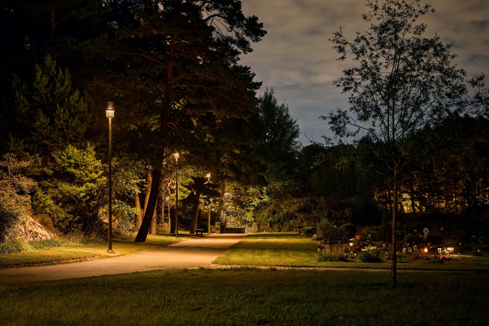 Topographical characteristics have been preserved, highlighting the valley surrounded by higher terrain, the embankment around the cemetery and important sightlines. Subtle lighting accentuates tree canopies, allowing them to stand out against the evening sky, while the new stormwater pond provides a focal point in the landscape. Soft integrated lighting in the seating area is reflected in the pond, letting visitors enjoy a place of solace and contemplation without visual disruption. Fixtures, poles, and colors unify the area visually, establishing a connection to the historical materials of the cemetery whilst also improving visual comfort of lighting in public pathways. Other areas were deliberately left unlit, making trees appear as silhouettes at dusk and dawn.