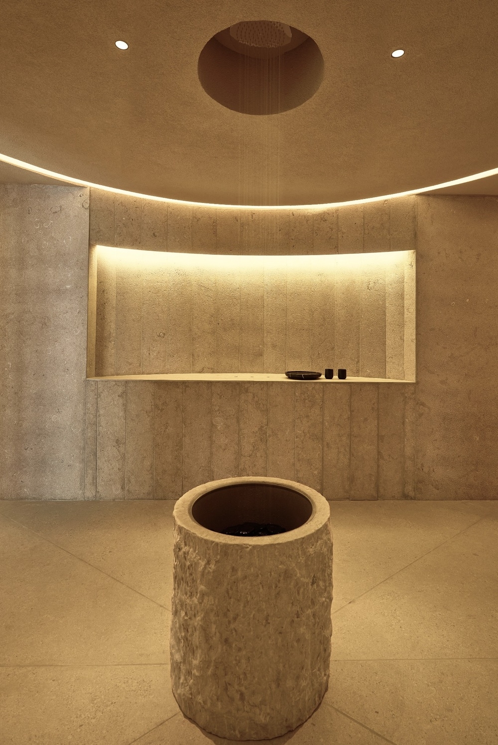 From the entrance, users walk through a space where soft lighting and the sound of flowing water create a sensory experience that invites them to leave the noise of the city behind. This transitional zone gently prepares the body and mind for the session.