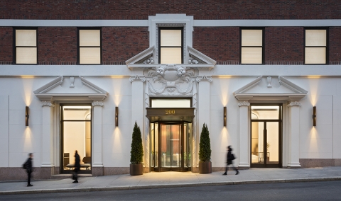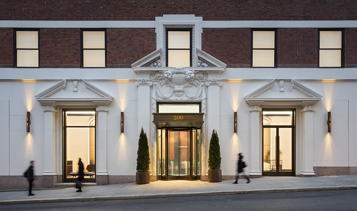 A louvered direct-indirect ring pendant welcomes visitors to the lobby with low-glare lighting and a simple curved form that echoes the architecture’s curved geometry. New downlights in the entry canopy supplement the interior light visible through the glass entry doors, while large custom sconces illuminate the sidewalk and complement the historic detailing on the façade.