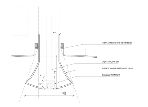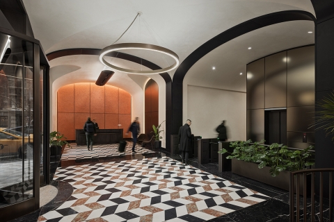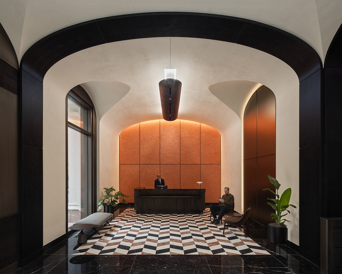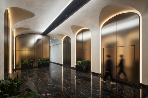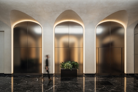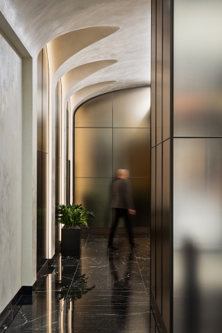 Entry DescriptionThe lighting design for this lobby renovation synthesizes varied lighting requirements for the polished marble floor, semi-specular walls, and matte plaster walls and ceiling. Custom ceiling-mounted architectural reflectors indirectly light the molded plaster, while discreet downlighting in the bottom of the reflectors illuminates circulation paths without disrupting the continuity of the architecture. Cove-mounted edge lighting highlights arched wall recesses, including at the elevator doors, where this approach accentuates the doors while avoiding direct light on their semi-specular surface. The curving linear fixture’s orientation and distance from the wall are calibrated to optimize the size and shape of the cove detail.