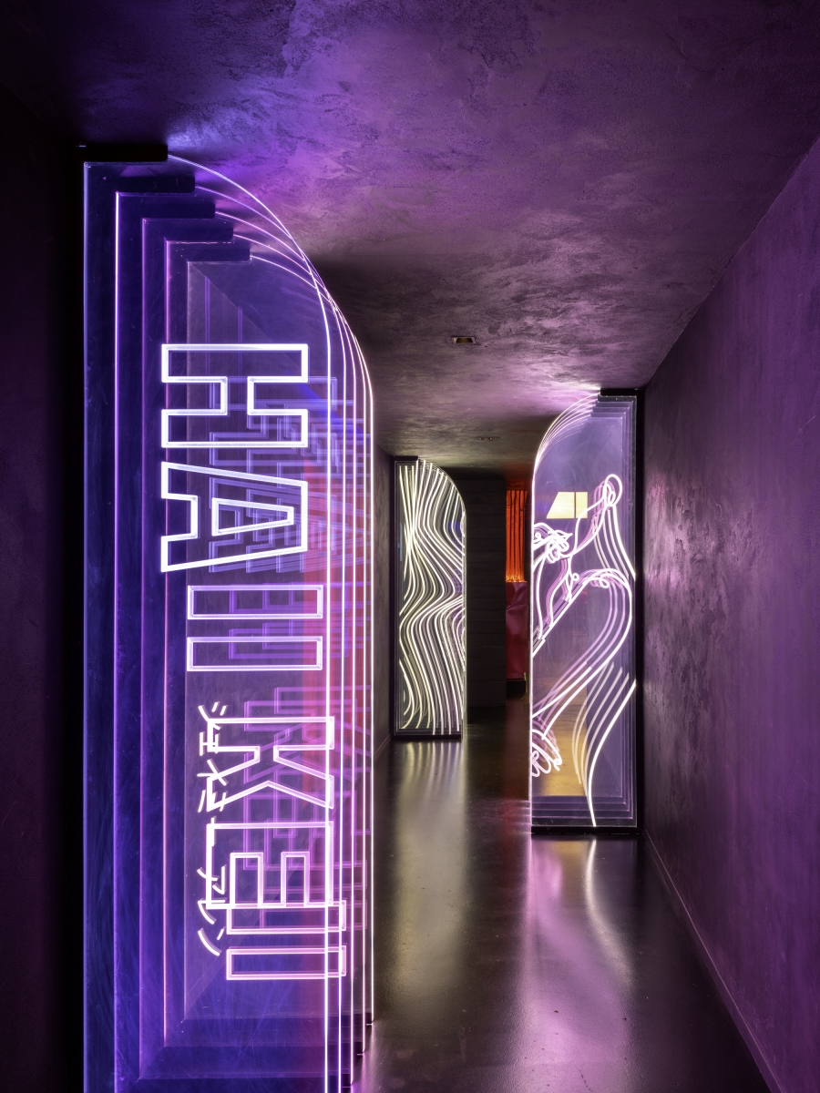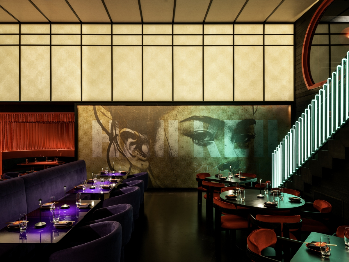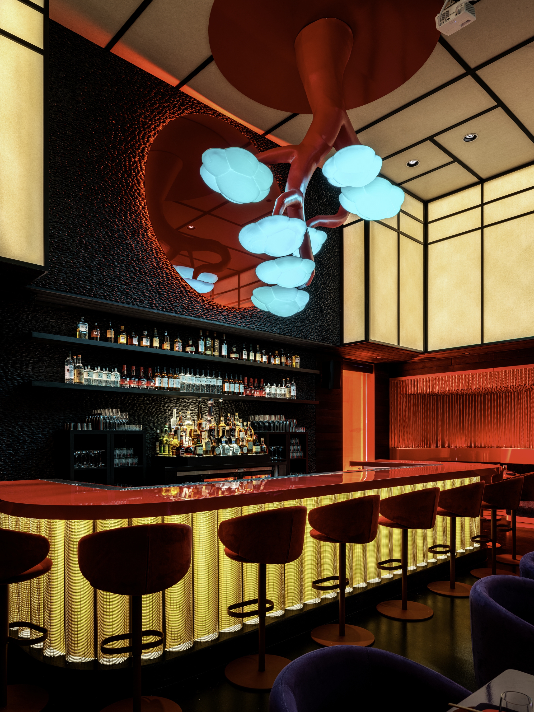 Entry DescriptionHaii Keii invites guests into a cinematic world where fantasy and reality blur, drawing inspiration from popular movies like Blade Runner and Kill Bill. The lighting design balances dramatic storytelling with warmth and visual comfort, crafting an immersive yet appetizing dining experience. A glowing entry corridor of edge-lit acrylic screens guides diners toward a central dining space anchored by a suspended bonsai tree with RGBW glowing leaf clusters. Intimate booths flank the space, wrapped in crimson rope and bathed in red uplight. Shoji screens span the upper walls, evenly backlit and animated with silhouetted projections to evoke hidden narratives behind. At the bar, reflective red surfaces are precisely spotlighted against black stone and warm backlit mesh. Throughout the space, fixtures are concealed or custom-finished to harmonize with the architecture. A layered lighting control system with DMX, astronomical time clock, and programmable color scenes enables dynamic mood shifts. With every detail, the lighting underscores the restaurant’s theatrical storytelling, driven by deep coordination between local artists, fabricators, and designers.