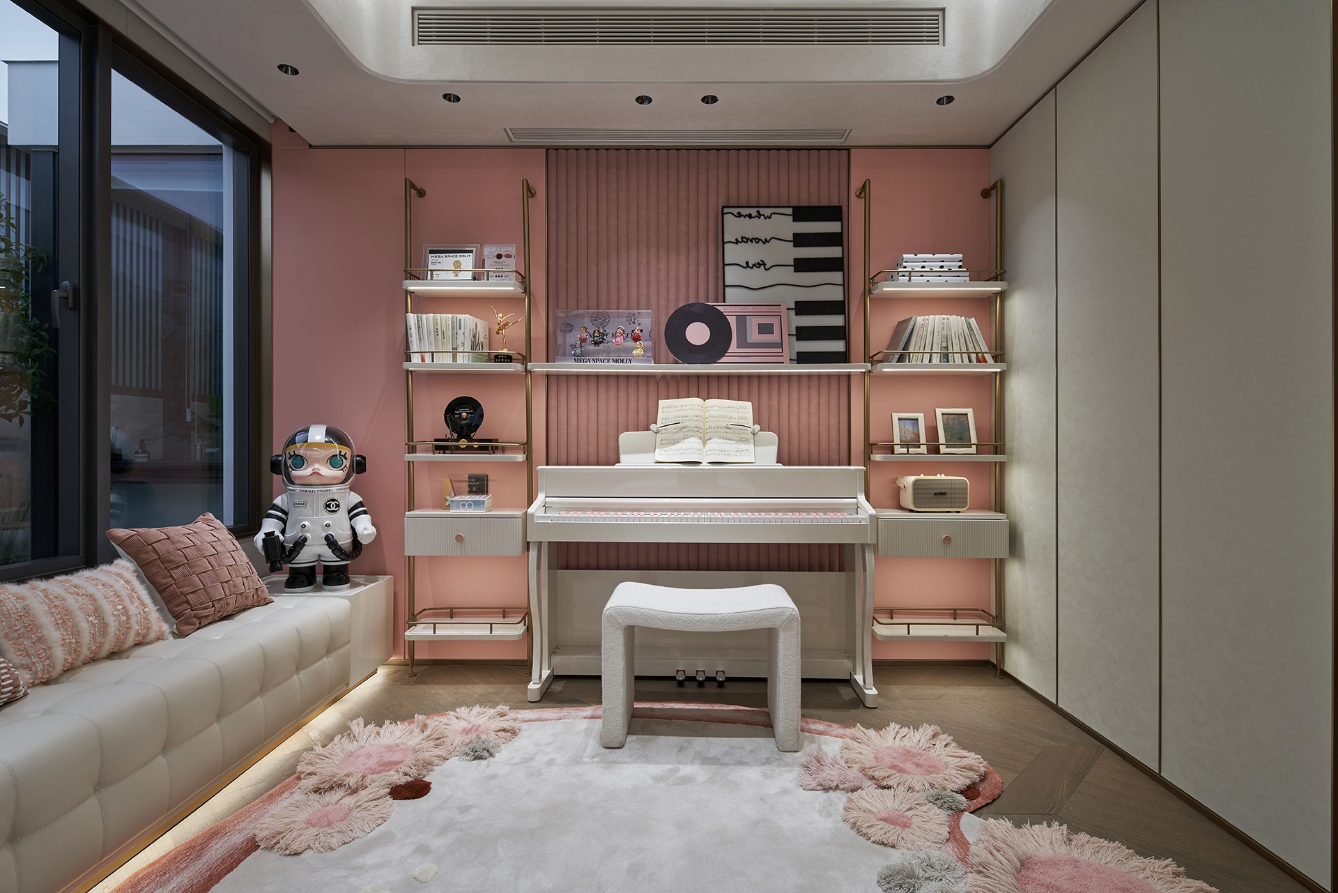 The two-story glazed glass serves as the ultimate visual focal point, emphasizing the volume and brightness of the structure through lighting.