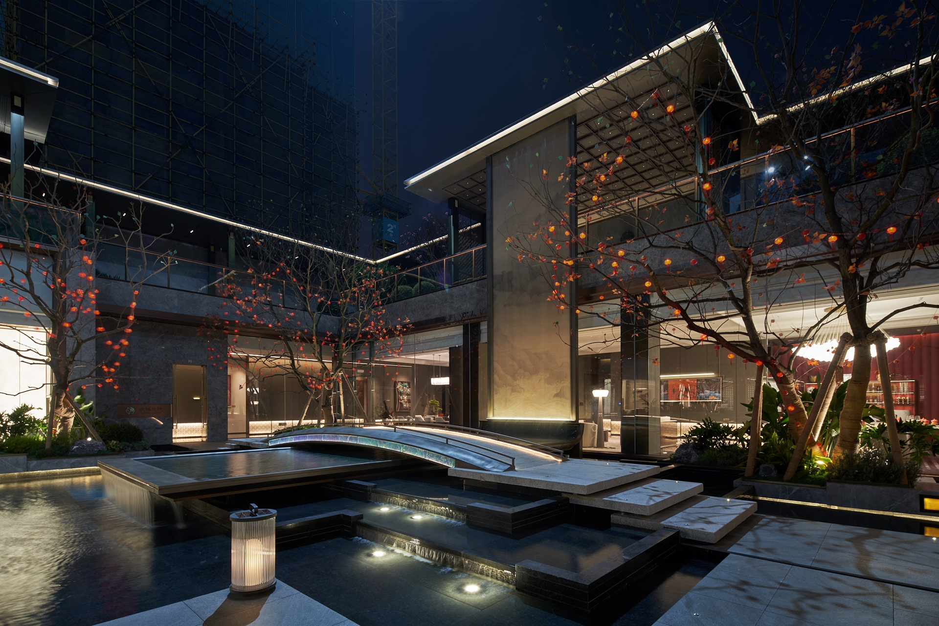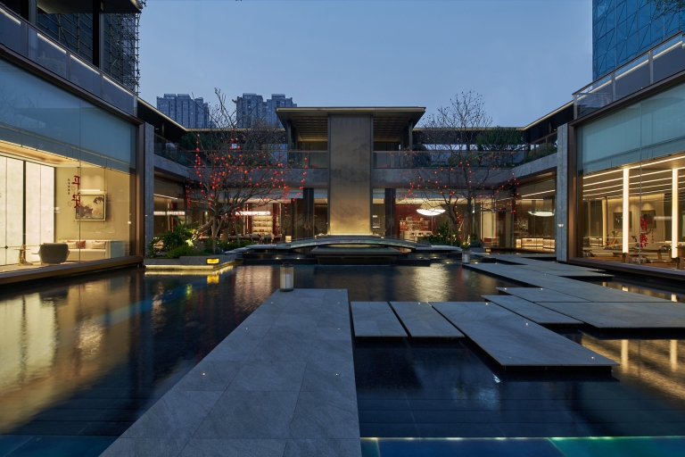 The water feature and greenery, as the core landscape elements of the inner courtyard, blend seamlessly with the sales department building, effectively enhancing the surrounding environment.