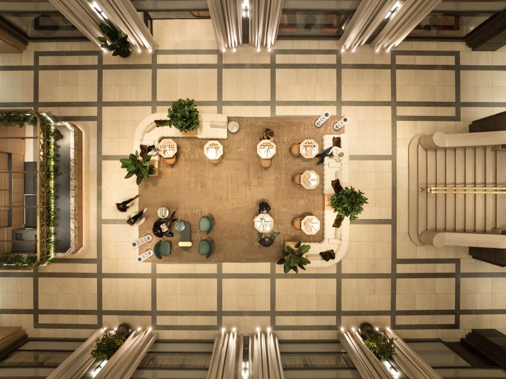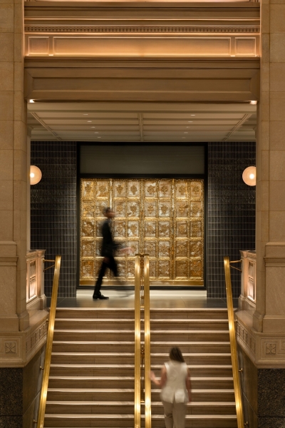 On the Mezzanine, ornate golden doors are softly lit by recessed fixtures with black louvers.