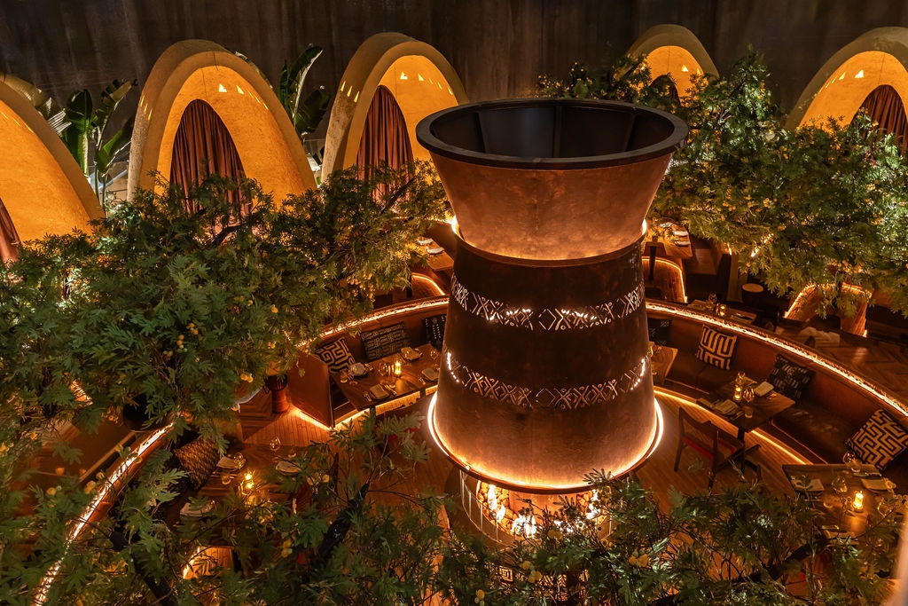 Well beyond illumination, light was woven into every element of the space –helping bring to life the storytelling, highlighting the incredible work of specialist craftspeople, and guiding behaviour. From the statement lit bespoke fire pit to the custom-built acacia trees animated by uplighting that casts dappled shadows across the ceiling, to the sculptural lighting of the 4.2m Boma structures —every corner of the space tells a story, and lighting plays a key role in weaving those narratives. Pools of warm light over each table were achieved with custom designed 6 deg. Snoop attachments. Fixtures were embedded into tree, booth seating and joinery so that the technology remained hidden. Dali controlled scene controls and zones provide dynamic flexibility, shifting from vibrant dining to late-night intimacy, and to cleaning and reset modes.