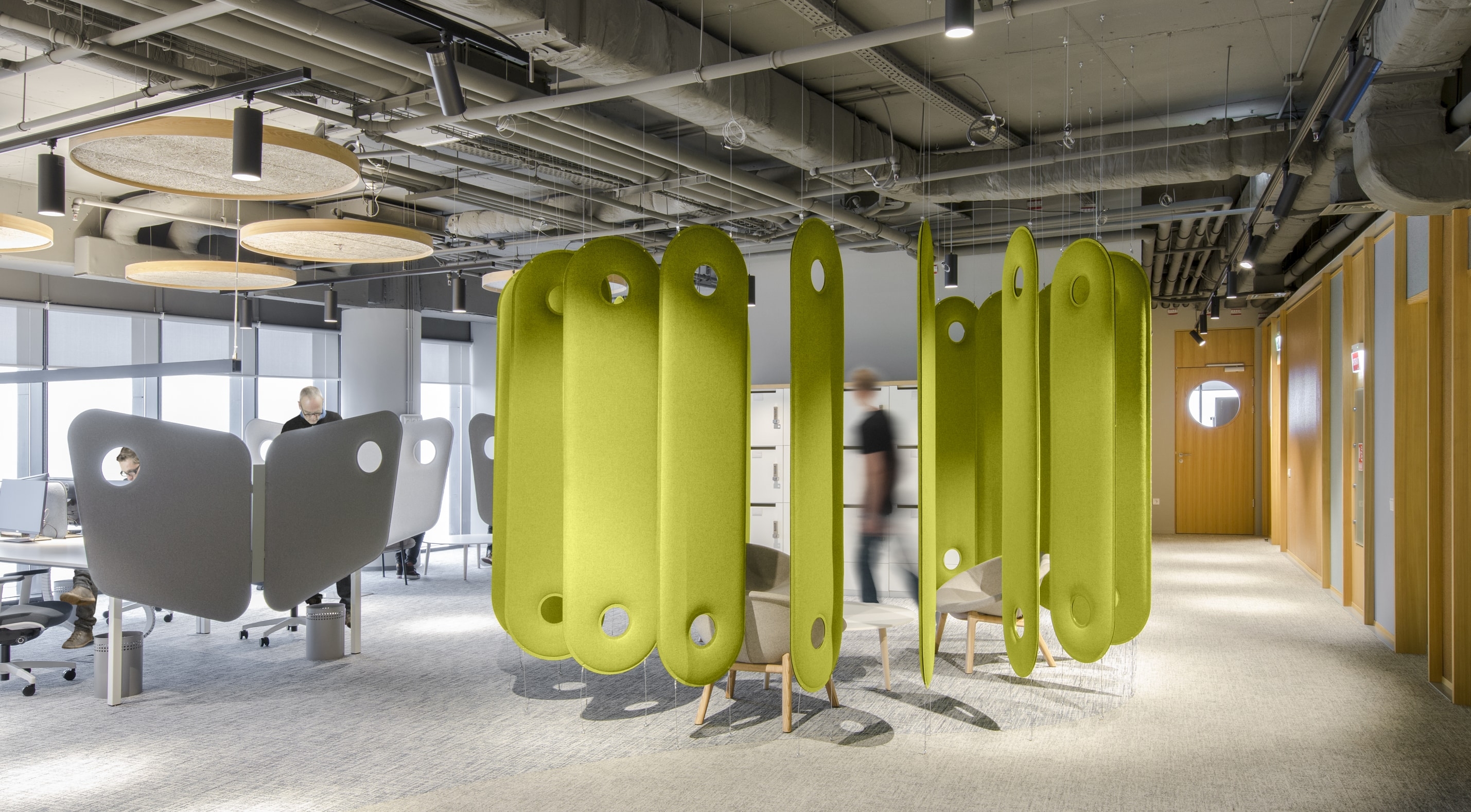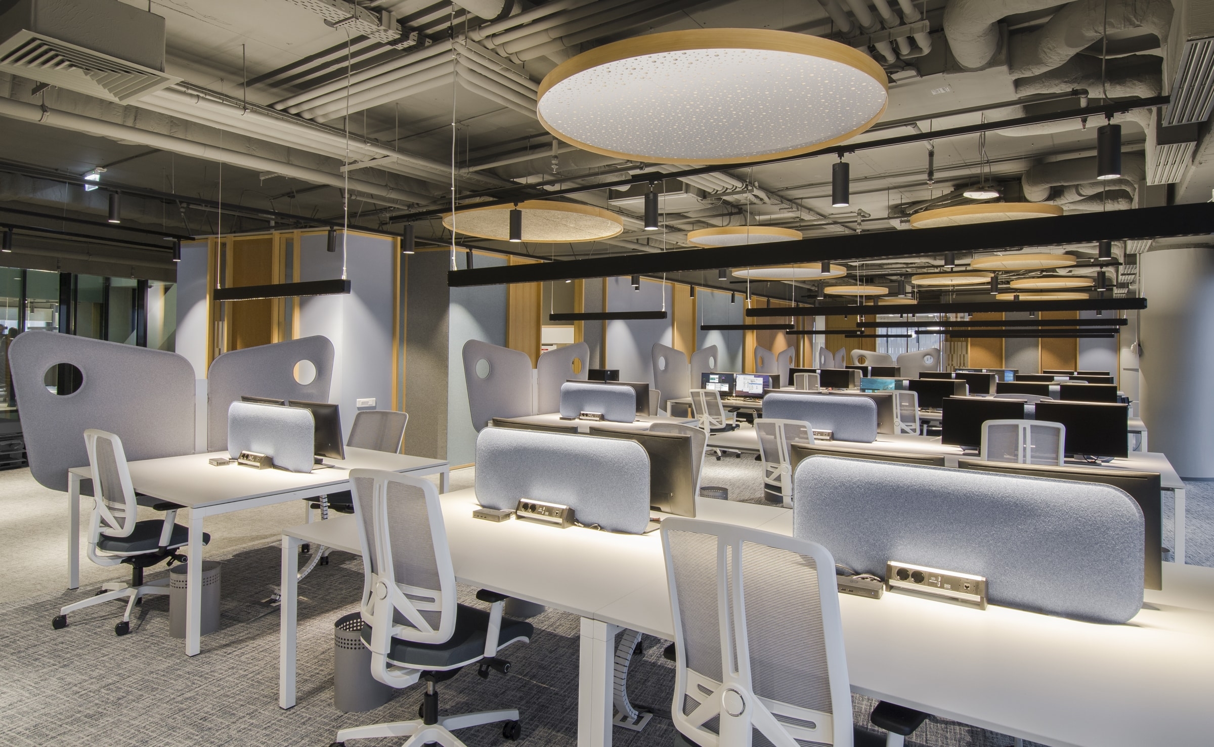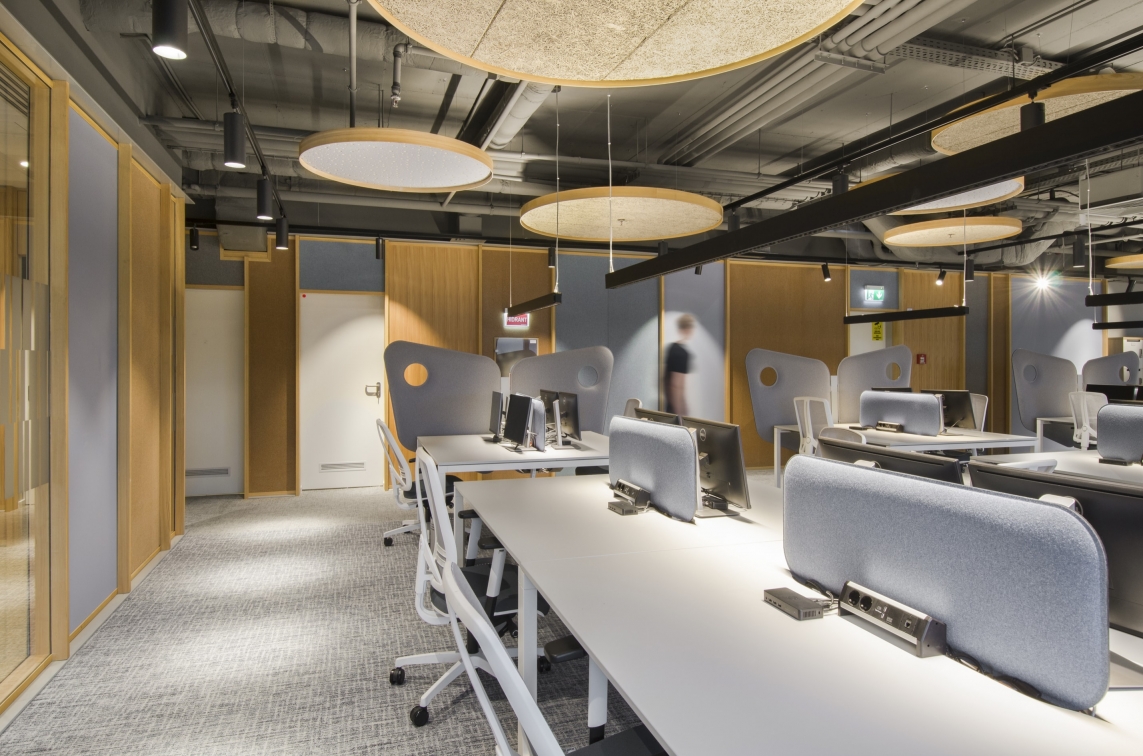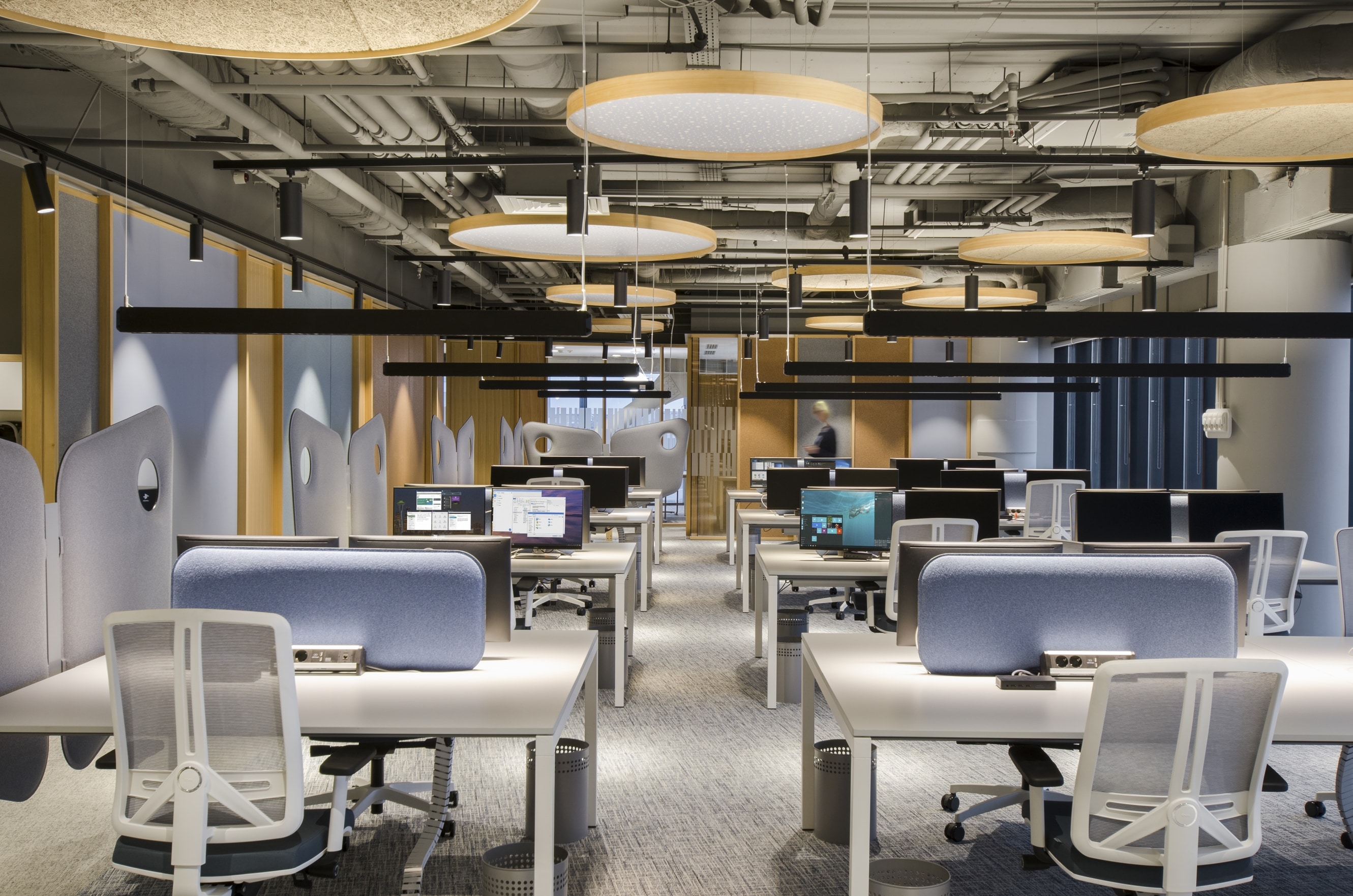 Despite the tremendous innovation in light technology and the enormous changes in the contemporary workspace environment, mostly towards wellbeing, work space lighting remains surprisingly dull, seldom more than functional. Part of this stagnation is due to the regulations conceived about half a century ago for typewriting and handwriting activities and largely assimilated to manufacturing activities hence similar requirements of uniform light all around as in factory halls. The attention paid to pleasant lighting in retail or hospitality eluded the office sector. Disruptive to this situation, the Microsoft Offices in Bucharest feature laser blade pendants controlling light spill in front of the screen while illuminating the background , a 15 % up light for filling effect on ceiling, dramatic light on architectural elements, light washed pillars, dedicated spotlights for plants and a rhythm of rays animating the long corridors), all light sources are recessed in black cones to avoid glare on screens. Temperature is 3000 K and all is DALI controlled. One scenario corresponds to the norms while the others are aimed at the real needs of the users and conceived with them.
